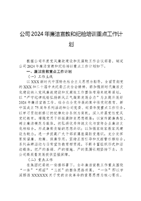 公司2024年廉洁宣教和纪检培训重点工作计划根据公司年度党风廉政建设和反腐败工作会议部署,制定公司2024年廉洁宣教和纪检培训重点工作计划如下。一、廉洁宣教重点工作计划(一)工作主线以XXX新时代中国特色社会主义思想为指导,全面贯彻党的XXX和二十届中央纪委三次全会精神,将加强新时代廉洁文化建设纳入党风廉政建设和反腐败工作整体布局来统筹谋划,以严守纪律规矩弘扬新风正气凝聚发展合力为主题开展好2024年廉洁宣教工作。结合在全党开展的集中性党纪教育、新中国成立75周年系列活动和公司党委、纪委年度重点工作任务,以学习贯彻新修订的纪律处分条例为契机,深入开展党性党风党纪教育,增强党员干部拒腐防变思想根基;以宣传勤廉典型、树立廉洁模范为载体,把弘扬优秀传统文化与宣传企业廉洁文化相结合,形成廉荣贪耻的思想共识;以加强家庭家教家风建设为助力,进一步提高广大干部家属拒腐防变意识,充分发挥家庭倡廉、助廉、保廉作用。坚持正面引导和反面警示相结合,系列品牌活动与日常宣传教育相贯通,不断丰富组织形式和活动载体,把严的基调、严的措施、严的氛围长期坚持下去,为公司高质量发展提供坚强保障。(二)重点工作在集团纪委统一安排部署下,全年廉洁宣教工作重点围绕一体两面三抓的整体思路开展。一体即以学深悟透XXXXXX关于党的自我革命的重要思想为核心要求。通过全面学与专题学相结合、线上学和线下学相结合、集中学与自主学相结合等方式,将这一重要思想所蕴涵的理论逻辑、实践要求转化为企业廉洁文化建设的基本遵循、源头活水,将学习成果转化为攻坚克难、干事创业的强大动力。两面即强化正反两方面教育。以宣贯心至廉路致远廉洁文化理念为抓手持续深化正面教育,把廉洁文化理念融入企业文化建设,深入开展党风廉政宣教月系列活动,营造风清气正的良好氛围;以查处的典型违纪违法案件为抓手持续深化反面教育,坚持以案示警、以案为鉴,用好办案成果,通过召开警示教育大会等形式,在公司上下进一步树立严的标准、严的导向。三抓即统筹抓好党性教育、纪律教育和廉洁教育。不断深化党性教育,深入贯彻《党史学习教育工作条例》,充分发挥党史以史鉴今、资政育人的作用,鼓励所属单位通过阅读党史著作、开展研讨交流、参加教育培训、参观红色场馆、参加实践活动等形式常态化开展党史学习教育,引导党员把不忘初心、牢记使命作为终身课题,弘扬革命精神、传承红色基因、筑牢党性根基。系统开展纪律教育,按照党中央统一部署和上级有关要求,在公司上下开展一次集中性纪律教育,着力解决对党规党纪不上心、不了解、不掌握等问题。各级纪委走在前、作表率,既要抓好自身学习,也要开展多形式、多级次的宣教活动,确保纪律教育覆盖基层一线。继续推行新提任领导干部、基层单位经理/党组织书记任前廉洁谈话等工作机制,加强对纪律规矩执行情况的监督检查,进一步提升领导干部依规依纪依法履职的意识和能力。创新推进廉洁教育,继续开展家庭家教家风建设系列活动,督促领导干部从严管好亲属子女;大力推动廉洁文化进单位、进家庭,结合一线实际建设基层单位廉洁文化展示墙、开设流动廉洁课堂,依托单位资源开展廉洁开放日家风座谈会活动,塑造家企廉动新格局,增强廉洁教育的辐射力和感召力。(三)重要活动安排文可居文库——海量学习资料,手机电脑均可下载www.wenkeju.com1.集中性纪律教育工作安排。按照党中央统一部署,突出严的基调组织一次集中性纪律教育。3-4月,向集团纪委推荐讲师人选,组建宣讲团,统一制作宣讲课件,拟定宣讲计划。4-10月,参与集团统一开设的纪律宣贯流动讲堂,组织公司总部机关、三级单位总部和基层单位积极参与宣讲课堂学习新修订的纪律处分条例,以及政务处分、问责条例、党内监督、廉洁自律等纪律要求。5月,公司纪委牵头,会同相关单位纪委编制干部员工廉洁自律应知应会,督促引导广大党员干部学纪、知纪、明纪、守纪。7月,公司纪委以拓宽警示教育形式,组织一定规模参观警示教育基地等活动,督促广大党员干部牢固树立正确的权力观、政绩观、事业观。9月,公司纪委牵头,组织相关部门和单位更新完善党纪法规考试题库,开展一次对各级党委管理干部的集中考试,增强党员干部拒腐防变思想根基。(以上将按照上级部署做相应调整完善)2.廉洁家风建设活动安排。4-12月,组织开展诵诺实语系列家风建设主题活动。诵:动员广大干部职工以家庭为单位,积极参加诵读廉洁故事传承优良家风微广播/视频录制活动,精选音频节目积极向集团纪委报送。诺:与各级领导干部、关键岗位人员签订《勤廉家风承诺书》,督促大家以从严管好亲属子女的郑重承诺,培育、践行和传承以勤为美、以廉为荣的勤廉家风。实:各单位结合实际邀请职工家属实地参观公司单位,通过了解单位和体验现场,更加支持和理解亲人的工