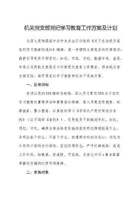 机关党支部党纪学习教育工作方案及计划为深入贯彻落实中共中央办公厅印发的《关于在全党开展党纪学习教育的通知》精神,进一步增强支部党员的纪律意识,教育引导党员干部学纪、知纪、明纪、守纪,根据中央、省委、市委以及局机关党委关于开展党纪教育工作要求,结合机关党支部实际,就开展党纪学习教育制定如下实施方案。一、总体目标坚持以党的XXX精神为统领,深入学习贯彻XXX关于党纪学习教育的重要讲话和重要指示精神,深入开展党性教育、纪律教育、警示教育,认真组织学习《中国共产党纪律处分条例》(以下简称《条例》),引导党员干部做到学纪、知纪、明纪、守纪。确保支部全体党员搞清楚党的纪律规矩是什么,弄明白能干什么、不能干什么,把遵规守纪刻印在心,内化为日用而不觉的言行准则,坚定信仰信念,严守纪律规矩、改进工作作风,知敬畏、存戒惧、守底线,为奋力书写x事业新篇章提供坚强的纪律作风保障。二、参加对象支部全体党员、入党积极分子三、时间安排2024年4月-7月。四、学习内容1.原原本本逐条学习《中国共产党纪律处分条例》,明确党的纪律标准,把握党的纪律尺度,做到心中有戒、行有所止。2.开展警示教育。选取近年来发生的违纪违法典型案例,进行深入剖析,以案说法,以案明纪,引导党员从中吸取教训,增强遵纪守法意识。五、学习方式1.集中学习:每月支部至少组织2次集中学习。2.自主学习:鼓励党员利用业余时间进行自主学习,通过阅读相关书籍、观看教育片等方式,加深对党纪知识的理解。3.专题党课:支部书记组织一次党纪教育专题党课。4.讨论交流:组织党员开展讨论交流,分享学习心得和体会,共同提高党性修养和纪律意识。四、学习要求与保障文可居文库——海量学习资料,手机电脑均可下载www.wenkeju.com1.成立专班。成立由支部书记任组长、支部委员参与的党纪学习教育专班,负责党纪学习教育活动的统筹协调和组织实施。2.制定计划。专班按照各级要求制定《党纪学习教育计划》,压实责任,强化落实。3.做好学习资源保障。积极对接局机关党委,为支部党员提供必要的学习资料,包括《中国共产党纪律处分条例》、警示教育片等。机关支部全体党员要高度重视本次党纪学习教育,领导干部要发挥表率作用,带头学习、带头遵守党纪,为其他党员树立榜样。附件:市x局机关党支部党纪学习教育计划市x局机关党支部党纪学习教育计划时间学习内容组织形式组织者文可居文库——海量学习资料,手机电脑均可下载www.wenkeju.com参加人员4月23日学习《中国共产党纪律处分条例》第一章至第三章集中学习支部书记全体党员和入党积极分子5月14日学习《中国共产党纪律处分条例》第四章、第五章集中学习支部书记全体党员和入党积极分子5月28日支部书记讲党纪教育专题党课专题党课支部书记全体党员和入党积极分子6月13日文可居文库——海量学习资料,手机电脑均可下载www.wenkeju.com学习近期省、市通报的典型案例、观看警示教育纪录片警示教育活动支部书记全体党员和入党积极分子6月25日学习《中国共产党纪律处分条例》第六章、第七章集中学习支部书记全体党员和入党积极分子7月2日学习《中国共产党纪律处分条例》第八章至第十一章集中学习支部书记全体党员和入党积极分子7月23日围绕党纪学习收获、体会等,组织党组开展讨论交流讨论交流文可居文库——海量学习资料,手机电脑均可下载www.wenkeju.com支部书记全体党员和入党积极分子文可居文库——海量学习资料,手机电脑均可下载www.wenkeju.com