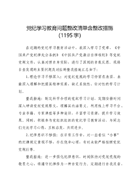 党纪学习教育问题整改清单含整改措施(1195字)在近期的党纪学习教育活动中,我深入学习了党章、《中国共产党纪律处分条例》《中国共产党廉洁自律准则》等党纪党规文件,认真对照自身实际,进行了深刻的自我反思。现将自查发现的主要问题及对应的整改措施汇总如下:1.理论学习不够深入:对党纪党规的学习停留在表面,未能深入理解和把握其精神实质,缺乏系统性、针对性的学习计划。整改措施:制定科学合理的党纪学习计划,定期安排时间深入研读党纪党规原文,理解其内涵要义。利用线上学习平台、专业书籍、专家讲座等多种途径,丰富学习资源,提升学习效果。同时,积极参与党组织组织的党纪学习教育活动,与同志们交流学习心得,互相启发,共同进步。2.纪律意识不够强:在日常工作中,对一些看似小事的纪律规定重视不够,存在侥幸心理,有时未能严格按照党纪党规行事。整改措施:进一步强化纪律意识,时刻保持对党纪党规的敬畏之心,将遵守纪律作为一种自觉行为。定期进行自我反省,对照党纪党规查摆问题,发现问题立即改正。积极参与警示教育活动,以反面典型为镜,警示自己时刻绷紧纪律之弦。3.服务群众意识有待加强:在工作中,虽然能够尽职尽责完成本职工作,但在主动服务群众、解决群众实际困难方面做得还不够。整改措施:牢固树立全心全意为人民服务的宗旨意识,坚持以人民为中心的发展思想。深入基层一线,了解群众需求,积极为群众办实事、解难题。加强与群众的沟通交流,建立畅通的反馈机制,及时回应群众关切,不断提升群众满意度。4.廉洁自律意识需进一步提升:在面对一些诱惑时,有时未能做到坚决抵制,存在小节无妨大碍的思想误区。整改措施:深入学习廉洁自律相关规定,明确红线与底线,坚决抵制各种不正之风。严格执行--八项规定及其实施细则精神,坚决反对四风,做到公正用权、依法用权、为民用权、廉洁用权。定期进行自我检查,对可能出现的廉洁风险点进行梳理分析,制定有效的防控措施。5.担当精神有待强化:在面临困难和挑战时,有时会出现畏难情绪,缺乏攻坚克难的决心和勇气。整改措施:进一步增强责任意识和担当精神,面对困难和挑战,敢于迎难而上,积极寻求解决问题的办法。在工作中,文可居文库——海量学习资料,手机电脑均可下载www.wenkeju.com主动承担急难险重任务,以实际行动展现共产党员的担当精神。加强党性锻炼,提升党性修养,锤炼坚强党性,始终保持昂扬向上的精神状态。通过上述问题的梳理与整改措施的制定,我深感自身在党纪学习和遵守方面还存在不少不足。我将以此次整改为契机,严格按照整改措施进行整改,不断提升自己的党性修养和纪律意识,争做一名守纪律、讲规矩、敢担当、乐奉献的优秀共产党员。在今后的工作生活中,我将继续深入学习党纪党规,将其内化于心、外化于行,以实际行动践行党员的初心和使命。同时,我将自觉接受党组织和同志们的监督,确保整改工作取得实实在在的效果,为推动全面从严治党向纵深发展,为实现中华民族伟大复兴的中国梦贡献自己的一份力量。文可居文库——海量学习资料,手机电脑均可下载www.wenkeju.com