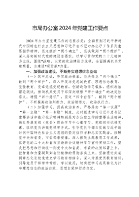 市局办公室2024年党建工作要点2024年办公室党建工作的总要求是:全面贯彻习近平新时代中国特色社会主义思想和习近平总书记对办公厅工作系列重要指示精神,坚定拥护两个确立、坚决做到两个维护,深入落实新时代党的建设总要求,以学习贯彻党的二十大精神为主线,围绕*战略,以党的政治建设为统领,全面提高机关党建质量,为建设*现贡献*力量。一、加强政治建设,不断夯实理想信念基础(一)筑牢忠诚,夯实政治根基。坚决捍卫两个确立做到两个维护,深入开展对党忠诚教育、理想信念教育、党性教育、党章党规党纪教育,创新政治学习载体,组织政治理论测试,推动机关党员干部深刻领悟两个确立的决定性意义,增强四个意识,坚定四个自信,做到两个维护,不断提高政治判断力、政治领悟力、政治执行力。(二)加强学习,提高政治素养。严格落实第一议题第一主题第一专题制度,及时跟进学习习近平总书记重要讲话和指示批示精神特别是对办公室工作的重要论述精神,通过开展党组(党委)理论学习中心组学习、党组织书记讲党课、组织党员讲微党课等方式,引导党员干部自觉做习近平新时代中国特色社会主义思想的坚定信仰者和忠实实践者。按照党中央和省委、市委部署安排,深入拓展主题教育工作成果,抓好党的二十大和省市县最新会议精神学习宣传贯彻工作,坚决把思想和行动统一到党中央和省委、市委的决策部署上来,把智慧和力量凝聚到会议精神的贯彻落实上来。坚持理论武装同常态化长效化党史学习教育相结合,深入开展党员教育培训,引导党员干部常学常新、学以致用,切实把学习成果转化为打牢理想信念的政治自觉、思想自觉和行动自觉。(三)坚定信仰,守好阵地。认真落实*工作责任制和*工作责任制,加强思想政治工作分析研判,做好重大突发事件和热点敏感问题的思想引导,防范各种错误思想和腐朽文化的侵蚀。加强文化建设,统筹做好全民阅读、法治、国家安全、国防教育等活动。结合主题党日活动等契机,深入学习宣传伟大建党精神和红笔宝精神,引导党员干部发扬斗争精神,增强斗争本领,守牢守好*防线。加强机关舆论阵地的建设管理,发挥好*公众号的作用,积极开展网上舆论引导工作,维护好意识形态安全。二、加强组织建设,不断巩固基层党建堡垒(一)强化政治责任,严格管党治党。全面落实《前面从严治党责任清单》要求,持续深化办公室主体责任、党委书记直接责任、党支部书记具体责任的机关党建三级责任制体系,层层压实机关党建责任,推动党建重点任务落实落地。坚持一把手亲自抓,加强对班子成员履行一岗双责情况的监督检查,全力支持配合机关党委高质量开展各项工作,推动党建工作落实见效。严格落实机关党委书记双向述职工作,抓好机关党支部书记年度述职工作并强化结果运用,推动机关党支部书记履职尽责,真正发挥好支部书记领头羊作用,更好建强支部堡垒。(二)强化组织建设,提升组织效能。认真贯彻落实《组织工作条例(试行)》,进一步优化机关党委配备设置,高标准配齐配强机关专职党务干部队伍。不断完善党委委员联系党支部制度,确保三会一课、主题党日活动、组织生活会和民主评议党员等党内政治生活规范落实。规范开展党员发展工作,持续优化党员队伍结构。以一线创优年活动为契机,围绕学习型、服务型、高效型、创新型、廉洁型机关建设,持续开展党建品牌创建活动,加强总结提炼和交流推广,扩大县委办机关党建影响力和示范带动效应,全面提升机关党建质量水平。(三)严格党员教育管理,提升党员先锋模范作用发挥。严格执行《组织工作条例》和《党员管理工作方案》,依托学习强国等APP,组织党员干部深入学习领会习近平新时代中国特色社会主义思想,认真落实政治理论教育、党章党规党纪教育、知识技能教育等七个方面基本任务。建立健全内部监督管理机制,严格落实党员领导干部双重组织生活、讲党课等制度,加强对党员领导干部和机关干部职工遵守党章党规党纪、贯彻执行党的路线方针政策情况的监督检查,强化年度述责述廉工作。三、强化责任担当,不断提升各项工作质效(一)建强干部队伍。严格落实领导班子理论学习中心组学习制度,采取集中深学、报告研学、党课讲学等形式,着力增强学习质效,全面提升班子理论素养。坚持以平时考核为抓手,深化*制度,全方位多角度总结工作、评判失误,确保机关各项工作有计划、高效率、零差错、落实处。组织开展干部作风整顿专项活动,着力解决办公室全体党员干部各项工作措施落实中存在的突出问题,教育引导督促全体干部职工作示范、勇争先,切实锻造委办过硬队伍。(二)办好党建活动。创新开展*活动,探索建立党员提、党支部议、党委定工作制度,鼓励党员干部对党建工作提意见、出点子、谋方法,为党组织创造性开展工作建强思想库。严格落实*等制度,组织年轻干部开展学习分享交流会,推动理论学习由软知识变成硬本领