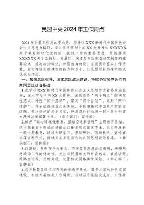 民盟中央2024年工作要点2024年全盟工作总的要求是:坚持以XXX新时代中国特色社会主义思想为指导,深入学习贯彻中共XX大精神和XXXXXX关于做好新时代党的统一战线工作的重要思想,贯彻落实XXXXXX关于坚持好、发展好、完善好中国新型政党制度的重要论述,提高政治站位,加强自身建设,全面提升盟务工作质量,着力增强资政建言的能力和水平,以民盟所长助推中国式现代化建设。一、加强思想引导,深化思想政治建设,持续夯实多党合作的共同思想政治基础1.把学习XXX新时代中国特色社会主义思想作为首要政治任务,深入学习中共XX大精神,深刻领悟两个确立的决定性意义,增强四个意识、坚定四个自信、做到两个维护,传承弘扬民盟优良传统,不断增强对中国共产党紧密追随、坚决拥护的历史自觉,把思想和行动统一到中共中央重大战略决策部署上来。(牵头部门:宣传部)2.做好凝心铸魂强根基、团结奋进新征程主题教育总结,把主题教育中形成的好做法以制度形式固定下来。扎实开展新一轮主题教育,通过专题学习、座谈研讨、现场教学、宣传宣讲等多种形式,持续夯实多党合作的共同思想政治基础。(牵头部门:宣传部)3.以高校、科研院所为重点,开展盟员思想动态调研,增强思想政治工作的针对性。关注与民盟相关的社会热点、敏感话题、网络言论等,及时发现、处置相关网络舆情风险。(牵头部门:宣传部)4.指导民盟各级组织开展传统教育基地、盟员之家和特色支部建设,积极开展相关工作调研,适时召开经验交流会、工作推进会,出台相关制度文件,进一步增强传统教育基地、盟员之家等载体的规范化建设水平。(牵头部门:宣传部)二、充分发挥民盟中央常委会、主席会和主席办公会的领导作用,推动盟务工作不断发展5.充分发挥民盟中央常委会、主席会、主席办公会的领导作用,把握新形势,明确新任务,围绕中共XX大确定的目标任务和民盟十三大的工作安排深入研究,做好规划,推动各项工作持续有效开展。(牵头部门:办公厅)6.今年常委会的主要工作是:重点研究全盟思想政治建设和宣传工作,加强对广大盟员的思想引导和教育培训,引导全盟上下坚定信念,凝聚共识,推动思想政治建设和宣传工作再上新台阶。(牵头部门:办公厅、宣传部)三、围绕中心服务大局,充分履行参政党职能7.做好服务政党协商工作。围绕经济社会发展重大问题,为民盟中央领导参加的党外人士座谈会、情况通报会等高层会议协商和书面协商提供意见建议。(牵头部门:参政议政部)8.提高政协协商工作质量。向全国政协十四届二次会议提交口头发言、书面发言和提案。围绕全国政协议政性常委会、专题协商会主题,做好发言准备工作。精心筹备与全国政协专委会联合举办的双周协商座谈会,部署安排好相关专题调研。协调盟员专家参加全国政协有关专委会组织的调研。(牵头部门:参政议政部)9.开展好调查研究工作。组织好中共中央委托的重点考察调研,形成调研报告,向中共中央、国务院提出有针对性的政策建议。做好民盟中央重点调研,以及与国家相关部门、民盟中央各专委会、省级盟组织、战略合作单位等联合开展的合作调研工作,提升调研成果质量。(牵头部门:参政议政部)10.继续提高反映社情民意信息质量。充分调动高水平盟员专家积极性,适时组织一次专委会委员信息工作座谈会。继续完善选题约稿机制,加强培训交流,提高信息稿件质量。(牵头部门:参政议政部)11.围绕中共中央关于长江生态环境保护的新部署和工作重点,发挥民盟智力优势,完善和用好三个系统,深入扎实开展调研,就民主监督工作中发现的重大体制机制性问题,向中共中央、国务院报送政策建议信,向云南省委、省政府提出意见建议。(牵头部门:参政议政部)12.召开2024年民盟中央参政议政工作会议。积极推动建设区域参政议政工作联盟,围绕区域重大问题和重点参政议政工作共同开展调查研究。(牵头部门:参政议政部)13.充分发挥论坛、智库平台作用。继续办好民盟经济、民生、法治、科技等论坛,提高论坛成果转化效能,形成有分量的建言议政成果。进一步发挥玉泉智库、启真智库、南山智库作用,适时成立新的智库,创新合作模式,拓宽合作调研范围,形成更多高质量建言成果。(牵头部门:参政议政部)14.完善专委会工作机制。通过调研、研讨和专委会工作会议等多种形式,发现培养人才,增强专委会的参政议政能力和水平。(牵头部门:参政议政部)15.推动参政议政调研基地建设。继续开展参政议政调研基地考察、批复等工作,新建一批基地。推动参政议政调研基地立足自身特色开展有关课题调研。制定民盟中央参政议政调研基地管理办法。(牵头部门:参政议政部) 四、调动盟内外资源,切实做好社会服务工作16.充分发挥全盟智力资源优势,以教育领域为重点,开展1+20+N地域+领域组团式帮扶,助推贵州毕节教育事业高质量发展。(牵头部门:社会服务部)17.针对广宗教育