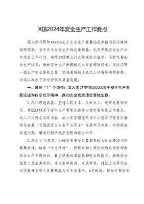 X镇2024年安全生产工作要点深入学习贯彻XXXXXX关于安全生产重要论述和指示批示精神按照国家、省市关于安全生产的决策部署,扎实开展安全生产治本攻坚三年行动,持续加强重点行业领域安全监管,不断完善安全生产体系,推动安全生产治理模式向事前预防转变,坚决压降一般生产安全事故总量,坚决遏制较大及以上和有影响的事故,切实以高水平安全护航高质量发展。一、聚焦1个统领:深入学习贯彻XXXXXX关于安全生产重要论述和指示批示精神,推动安全发展理念落地生根。1.深化理论武装。坚持人民至上、生命至上,统筹发展和安全,将XXXXXX关于安全生产重要论述作为镇党委宣传工作重点,纳入工作例会必学内容,纳入党委理论学习中心组学习重要内容深化拓展百团进百万企业千万员工专题学习宣讲,切实提高发现问题、解决问题的强烈意愿和能力水平。2.深入学习培训。加强负有安全监管职责的人员业务培训和履职考评,培育专业精神。积极参加上级组织的应急管理和安全生产专题培训,着力提高统筹发展和安全的能力。加强安全监管人员业务培训,通过集中轮训、考试考核、持证上岗等形式切实提升监管人员履职能力和专业水平。6月底前,组织专职安全员培训考核,换发安全生产检查证。3.深度宣传推广。加强全民安全生产宣传教育,创新安全生产月119消防宣传月等主题活动形式,组织参加中小学生和企业职工技能竞赛。利用新闻媒体、公交广告、电梯广告等载体,加大安全常识宣传力度,提升全社会安全意识。深化平安工程安康杯竞赛、青年安全生产示范岗等示范创建,强化示范引领作用。二、聚焦1条主线:深化全域风险辨识管控和事故隐患集中治理双防双标机制,一如既往筑牢安全生产基层基础4.强化全域风险辨识管控。针对季节特点、企业危险(有害)因素等实际,每季度开展一次风险辨识,形成一图一册一清单。5.强化重大风险精准治理。建立主要负责人带头包保较大以上风险和不放心点位的包保责任机制,强化清单管理、限期销号做到应查尽查、应改尽改。12月底前实现所有重大事故隐患动态清零。针对流动餐饮、光伏发电、电化学储能电站等新业态,常态推行新设市场主体安全准入,严控增量风险。针对极端天气带来的不利影响,及时修订应急响应操作手册,及时完善应急响应机制,严防变量风险。6.强化标准化标识化管理。深化安全生产标准化创建,推动单班作业10人以上劳动密集型企业开展三级标准化创建,其他中小型企业开展安全管理规范化建设。进一步完善小微企业、9+N小场所网格管理、清单管理、码上管理标准和规范,实行标识化管理。7.强化应急管理体系建设。加强镇应急指挥中心建设,拓宽应急指挥平台功能,应用数字化手段,提升安全监管效能,落实应急处置机制流程。镇财政设立应急救援专项资金,建立快速调拨机制,开辟应急救援绿色通道。定期开展应急演练,不断优化应急预案,提升突发事件处置能力。三、聚焦5项重点:抓好巡视巡查反馈问题整改、理顺安全管理机构体制机制、强化危化品全生命周期管理、放大本质安全提升工程质效、压实企业安全生产主体责任,切实提升发现问题、解决问题的强烈意愿和能力水平。8.抓好巡视巡查反馈问题整改。紧盯省委巡视和省安全生产巡查反馈问题,按照一个问题、一套措施、一个主体、一抓到底的原则,迅速研究制定整改方案,逐一细化整改措施,明确整改时限和整改责任,挂图作战、销号管理,坚决做到隐患不消除不放过、问题不解决不放过、整改不到位不放过,确保件件有着落、事事有回音、条条见成效。9.理顺安全管理机构体制机制。严格执行《地方党政领导干部安全生产责任制》,持续推行行政主要负责人分管安全生产工作制度和履职档案管理制度,深化党政领导挂钩化解重大(较大)风险隐患工作,推动公安派出所、应急、消防等监管力量整合到位。严格执行安全生产专业委员会工作规范,完善议事、协调、管理、决策工作规则,健全发文、会议、督查、考核等制度机制。严格执行《X镇局(办、中心)及驻镇有关单位安全生产工作职责任务清单》,各成员单位每季度至少召开一次安全生产工作会议。探索实施两项工作机制,即,消防重大问题双督办机制和安全生产不放心点位挂钩包保考评机制,提升发现问题、解决问题的能力水平和强烈意愿。10.强化危险化学品全生命周期管理。强化动火、检维修等高危作业现场管理,压降易燃易爆检维修现场的作业人员数量。开展工业气体充装企业专项整治,推动实现工业气体充装、运输、经营、储存等全链条管理。11.放大本质安全提升工程质效。对本质安全提升工程三年行动开展一次全面回头看,摸清短板弱项、不放心点位、不放心部位、不放心环节,形成一份画像精准的自我评估报告,完善一份不放心点位底数清单和责任清单,制定一份靠实的专项行动计划,一个任务一个任务抓落实,一个节点一个节点抓推进,12月底前,全面达成年度既