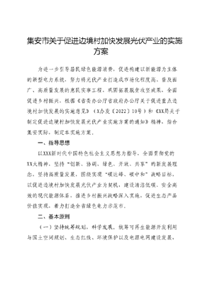 集安市关于促进边境村加快发展光伏产业的实施方案为进一步引导居民绿色能源消费,促进构建以新能源为主体的新型电力系统,努力将光伏产业打造成市场化程度高、普及面广、高质量发展的惠民实事工程,巩固拓展脱贫攻坚成果,全面促进乡村振兴,根据《省委办公厅省政府办公厅关于促进重点边境村加快发展的实施意见》(X办发〔2022〕10号)和《XX局关于制定促进边境村加快发展光伏产业实施方案的通知》精神,结合集安实际,制定本实施方案。一、指导思想以XXX新时代中国特色社会主义思想为指导,全面贯彻党的XX大精神,坚持创新、协调、绿色、开放、共享的新发展理念,坚持高质量发展,围绕实现碳达峰、碳中和战略目标,以促进边境村加快发展光伏产业为契机,建设清洁低碳、安全高效的现代能源体系,推进乡村振兴战略深入实施,促进生态产品价值实现,着力打造全省绿色电力示范市。二、基本原则(一)坚持统筹规划,科学发展。统筹可再生能源开发利用与国土空间规划、生态红线、环境保护以及电源电网建设发展,坚持规划引领、目标管控,坚持科学布局、有序推进,注重各乡镇的差异化协同发展,注重开发应用与电网接入消纳的有效衔接(二)坚持因地制宜,优化布局。根据不同乡镇资源禀赋,在充分考虑资源和环境承载能力的基础上,遵循宜建尽建、光储一体的原则,优化布局,有序开发太阳能资源,强化智能电网等配套服务体系建设,全面提升光伏发电消纳能力。(三)坚持创新驱动,产业带动。以建设全省绿色电力示范市为目标,结合新技术、新业态、新模式,拓展太阳能应用范围,通过产业示范,推动地方新旧动能转换,通过可再生能源产业带动周边其他行业,增加地方税收,打造集安市新的经济增长极。(四)坚持清洁高效,普惠民生。坚持可再生能源智慧融合多元化发展,着力推进太阳能多元化融合发展及配套服务体系建设,重点关注农村地区可再生能源的发展,推进提升农村居民基本用能条件、生活品质,促进居民增收。三、工作目标2024年开始,在全市28个边境村优先推进新能源乡村振兴工程,每个边境村建设200千瓦光伏发电项目,至2024年底前实现边境村光伏产业全面覆盖,每个村实现年收益约3万元-10万元。四、开展模式(一)推进模式结合我市实际情况,优先选择具备建设条件和接网条件的边境村启动光伏建设,并力争在2023年底前实现28个边境村全面覆盖的目标任务。相关乡镇(街道)可按照本方案要求,灵活选择投融资、建设、运维管理和收益分配模式。(二)投融资模式政府全资。采取整合涉农、涉贫、乡村振兴等政府专项资金或利用政府专项债券等模式投资建设。(三)建设模式由发展和改革局、乡村振兴服务中心牵头,相关部门和乡镇(街道)配合,根据各村资源条件,因地制宜建设光伏项目。统一规划、统一选址、统一建设、统一运维。省能源局将优先给予边境村光伏发电项目指标支持。(四)运维管理模式由市政府授权乡村振兴服务中心委托资质运维公司负责电站后期运行维护,保障电站安全平稳运行。(五)收益分配模式收益全部分配给村集体。按照光伏年发电时长1500小时测算建设200千瓦光伏发电项目,每个村集体每年收益约10万元,至少持续20年。(六)积极探索光伏+项目积极结合边境村优先推进新能源乡村振兴工程,根据不同环境、应用场景和用能需求,推动一批光伏+试点项目建设,突出示范引领作用,探索绿色能源与生态、环境、人文等协同融合发展的新路径。五、选址要求要严把三关质量关、安全关、景色关。在设计和建设的过程中,要按照全面安全、经济美观、统筹兼顾的原则,保障项目安全,打造集美观、环保、节能为一体的的光伏开发示范项目发挥应有的引领作用。1.无遮荫。周边无高大遮挡,如高层建筑、树木、电力杆塔等。2.接入条件好。临近电网设施条件优、消纳能力强。3.地面集中式宜选择村集体土地,土地性质适宜。地块相对完整、平坦,场地内无线路、河流沟渠、坟地等敏感因素的区域六、实施步骤(一)确定建设选址。组织相关乡镇(街道)对辖区内边境村开展光伏项目选址,对可利用资金、资源、电网接入等情况进行调查摸底,做好项目谋划和申报工作。(二)推动开工建设。每个边境村光伏电站建设规模为200千瓦,在具备建设条件并取得省能源局建设指标后,由乡村振兴服务中心正式印发建设计划通知,并将建设计划抄送省乡村振兴局,工程启动建设。鼓励相关乡镇(街道)突出地域特色,因地制宜开展光伏+农业、光伏+牧业光伏+旅游等复合型项目。(三)督导项目建设。对光伏电站建设情况实行旬调度制度不定期实地抽查检查建设进度,梳理项目推进过程中存在的困难及问题,对建设进展缓慢的乡镇(街道)和企业进行约谈提醒,督促指导按时完成项目建设。(四)综合考评验收。组织相关部门围绕建设工期、建设质量、收益分配、运行维护四个方面对光伏项目进行综合考核验收总结建设经验。七、保障措施(一)加强组织
