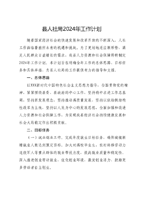 县人社局2024年工作计划随着国家经济社会的快速发展和改革开放的不断深入,人社工作面临着前所未有的机遇和挑战。为了更好地适应新形势,满足人民群众日益增长的需求,我县人力资源和社会保障局特制定2024年工作计划。本计划旨在明确全年工作的总体思路、目标任务和具体举措,为县人社局的工作提供有力的指导和支撑。一、总体思路以XXX新时代中国特色社会主义思想为指导,全面贯彻党的精神,紧紧围绕县委、县政府的中心工作,坚持稳中求进工作总基调,坚持新发展理念,坚持推动高质量发展,坚持以供给侧结构性改革为主线,坚持以人民为中心的发展思想,全面加强和改进人力资源和社会保障工作,为实现我县经济社会持续健康发展和社会大局稳定作出积极贡献。二、目标任务(一)就业创业工作。完成年度就业目标任务,确保城镇新增就业人数达到预定目标。加大对高校毕业生、农村转移劳动力退役军人等重点群体的就业帮扶力度,提高就业质量和稳定性。深入推进创业带动就业,优化创业环境,激发创业活力,鼓励更多劳动者自主创业。(二)人才队伍建设。加强高层次人才引进和培养,建立完善人才库,为县域经济社会发展提供强有力的人才支撑。深化职称制度改革,完善人才评价机制,激发人才创新创造活力。加强职业技能培训和鉴定工作,提高劳动者技能水平和职业素质。(三)社会保障体系建设。完善社会保险制度,提高社会保险参保率和保障水平,确保各项社会保险待遇按时足额发放。加强社会保险基金监管,保障基金安全有效运行,防范化解社保领域重大风险。完善社会救助体系,提高救助标准和救助效率,切实保障困难群众基本生活。(四)劳动关系和谐稳定。加强劳动法律法规宣传和培训,提高用人单位和劳动者的法律意识和维权能力。加强劳动争议调解和仲裁工作,及时妥善处理劳动争议案件,维护劳动关系和谐稳定。加强劳动保障监察执法力度,规范用人单位用工行为,保障劳动者合法权益。(五)自身建设和服务能力提升。加强党风廉政建设,落实全面从严治党要求,提高干部职工思想政治素质。加强业务学习和培训,提高干部职工业务能力和服务水平。推进信息化建设,提高工作效率和服务质量,为群众提供更加便捷高效的服务。三、工作措施(一)加强组织领导。成立以局长为组长的工作领导小组,明确各科室、各单位的工作职责和任务分工,确保各项工作有序开展。定期召开工作会议,及时研究解决工作中出现的问题和困难。(二)强化责任落实。将各项工作任务分解到具体科室和单位,明确责任人和完成时限,确保各项工作按时按质完成。建立健全考核评价机制,对工作完成情况进行定期检查和评估,激励先进、督促后进。(三)加强沟通协调。加强与相关部门和单位的沟通协调,形成工作合力,共同推进人力资源和社会保障工作。加强与上级部门的请示汇报,争取更多的政策支持和资金保障。加强与基层群众的联系沟通,了解群众需求,及时回应社会关切。(四)加强宣传引导。充分利用各种媒体和渠道,加强对人力资源和社会保障工作的宣传引导,提高群众对政策的知晓率和满意度。组织开展系列宣传活动,普及法律知识,增强群众的法律意识和维权能力。四、工作要求(一)提高政治站位。全县人社系统干部职工要深入学习贯彻XXX新时代中国特色社会主义思想,切实增强四个意识,坚定四个自信,做到两个维护,始终在思想上政治上行动上同以XXX同志为核心的党中央保持高度一致。要深刻认识做好人社工作的重要性和紧迫性,切实增强责任感和使命感,以更加饱满的热情、更加务实的作风、更加有效的措施,推动人社事业高质量发展。(二)强化担当作为。全县人社系统干部职工要敢于担当、勇于作为,以更加积极主动的态度推进各项工作。要敢于面对困难和挑战,勇于攻坚克难、破解难题。要敢于创新思路和方法,勇于探索实践、先行先试。要敢于承担责任和风险,勇于担当起推动人社事业发展的重任。(三)加强团队建设。全县人社系统干部职工要加强团结协作、密切配合,形成工作合力。要加强学习培训、提高素质能力不断提升专业水平和综合素质。要加强纪律约束、严明工作纪律确保政令畅通、令行禁止。要加强作风建设、树立良好形象,展示人社系统干部职工的良好风貌。2024年是全面贯彻落实党的XX大精神和推动人社事业高质量发展的关键之年。县人社局将紧紧围绕县委、县政府的中心工作以更加饱满的热情、更加务实的作风、更加有效的措施,全力推进人力资源和社会保障工作的发展。我们坚信,在全体干部职工的共同努力下,我们一定能够完成各项工作任务,为县域经济社会的稳定发展作出新的更大贡献。让我们携手共进、砥砺前行,共同书写人社事业发展的新篇章!
