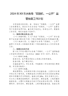 2024年XX市水务局双随机、一公开监管抽查工作计划为贯彻落实国务院、省、市有关双随机、一公开监管工作部署要求,推动全市水务系统双随机、一公开监管各项工作稳步有序开展,着力提升规范化、标准化水平,根据局工作实际,制定本抽查计划如下:一、抽查对象及执法人员(一)抽查对象:从《广东省双随机、一公开综合监管平台检查对象名录子库》中按比例随机抽取本年度抽查对象。(二)执法人员:从《XX市水务局双随机、一公开监管工作检查人员基础名录库》中随机抽取执法人员负责检查工作。二、抽查办法及内容按《关于印发<XX市水务局双随机、一公开监管抽查工作指引>的通知》(汕水执法〔2022〕9号)执行,具体为:(一)跨部门抽查。检查内容:生产建设项目水土保持工作落实情况。检查对象:生产建设单位。实施检查单位:市水务局、市城管局(市住房和城乡建设局、市交通运输局)。(二)本部门抽查。建设管理科:水利建设市场主体监督检查。主要针对在建市级水利工程项目,参建的各类水利建设单位执行国家法律法规和市场履约行为等情况。抽查比例20%,频次为每年2次;对水利工程建设基建程序、招标投标、建设监理、工程质量的监督检查。主要针对局做出行政许可的在建水利工程,开展基建程序、招标投标、建设监理、工程质量监督检查。抽查比例5%,频次为每年2次。水资源管理科:对单位或个人取用水行为的行政检查。检查是否按照有关规定办理取水许可证;是否按批准的取水许可规定条件取水,并按批准的用途用水;是否按规范定期开展取水计量检定或校准工作;是否按要求做好取用水档案管理工作。抽查比例5%,频次为每年4次。水旱灾害防御科:水利工程管理和保护范围内新建、扩建改建的工程建设项目方案审批。检查是否按照批准的建设方案进行建设;工程防护和补救措施的落实情况;其他违反水利相关法律法规及影响行洪、堤防安全的有关问题。抽查方式:现场检查;抽查比例20%,频次为每年2次。河长制工作科:在河道管理范围内建设项目(含河口滩涂开发利用工程)和有关活动的监督检查,抽查内容主要包括:是否按照批准的建设方案(含河口滩涂开发利用工程)进行建设;工程防护和补救措施的落实情况;防汛度汛落实情况;其他违反水利相关法律法规及影响行洪、堤防安全的有关问题。抽查方式:现场检查或书面检查;抽查比例10%,频次为每年2次。河道采砂的监督检查,抽查内容主要包括:是否按照批准的内容实施。抽查方式:现场检查或书面检查;抽查比例20%,频次为每年1次。执法监督科:生产建设项目水土保持监督检查,抽查比例5%,频次为每年3次。安全生产综合监管,水行政单位、生产经营单位执行安全生产法律法规和国家标准、行业标准;本部门安全生产工作监管情况。抽查比例10%,频次为每年2次。三、抽查时间2024年抽查工作应于11月10日前全部完成,具体时间由各科室根据实际工作情况自行安排。四、工作要求(一)提高思想认识。推行双随机、一公开监管工作,是贯彻落实党中央、国务院关于深化行政体制改革,加快政府职能转变,推进简政放权,优化服务决策部署的重要举措,列入省、市年度考核内容。各有关科室务必提高政治站位,高度重视,确保抽查工作落到实处、取得实效。(二)加强组织领导。在随机抽查工作中,各有关业务科室负责人要亲力亲为,加强对抽查工作的部署安排,明确分工,强化责任落实。科室之间要加强团结协作,密切配合,切实履行好法律赋予的监管职责。(三)做好宣传和公开工作。要充分利用多种形式,广泛开展双随机、一公开工作的宣传动员和教育引导,为随机抽查工作的顺利开展营造良好氛围。对随机抽查对象、检查结果要按照规定要求,及时向社会公开,自觉接受被检查单位、生产经营单位和社会各界的监督。(四)严肃抽查纪律。各职责部门要严格遵守法定程序和权限,依法依规开展抽查工作,不得妨碍生产经营单位正常的生产经营活动,不得索取、收受被检查对象及相关利益人的财物或其他利益,不得徇私枉法、营私舞弊,对随机抽查工作中失职渎职和违纪的,要依法依纪严肃处理。