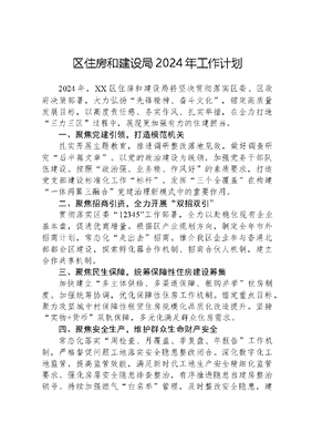 区住房和建设局2024年工作计划2024年,XX区住房和建设局将坚决贯彻落实区委、区政府决策部署,大力弘扬先锋精神、奋斗文化,锚定高质量发展目标,以高度责任感、务实作风、扎实举措,在全力打造三力三区过程中,展现更加强有力的住建担当。一、聚焦党建引领,打造模范机关扎实开展主题教育,推进调研整改落地见效,做好调查研究后半篇文章。以党的政治建设为统领,加强党务干部队伍建设。按照政治强、业务精、作风好的素质要求,打造党支部建设标准化工作标杆。发挥三个全覆盖在构建一体两翼三融合党建治理新模式中的重要作用。二、聚焦招商引资,全力开展双招双引贯彻落实区委12345工作部署,全力以赴稳住现有企业基本盘,促进优商增量。根据区产业规划方向,制定全年市外招商计划,常态化走出去招商。推介我区企业参与香港北部都会区建设,探索孵化器合作机制、招商合伙人机制,建立合作共享机制。三、聚焦民生保障,统筹保障性住房建设筹集加快建立多主体供给、多渠道保障、租购并举住房制度。加强统筹协调,优化保障性住房工作机制。锚定重点目标,聚力攻坚城中村保障性租赁住房规模化品质化改造提升。坚持实物+货币双轨保障,多元化满足群众住房需求。四、聚焦安全生产,维护群众生命财产安全常态化落实周检查、月覆盖、季复盘、年报告工作机制,严格督促问题工地落实安全隐患整改闭合。深化数字化工地监管,提高监管效能,满足新时代工地生产安全精细化监管要求。强化房屋安全隐患排查整治,有序推进隐患自建房整治销号。持续加强燃气白名单管理,及时整改安全隐患,建立风险管控和隐患排查双重预防机制。五、聚焦经济发展,促进建筑业和房地产稳增长做好重点企业服务工作,兑现落户扶持政策,助力企业扎根XX做大做强。强化纳统指导,确保颗粒归仓。开展房地产在售项目跟踪服务,搭建商办推介平台。联动区各产业部门招商引资,共同推介写字楼,促进存量去化。六、聚焦建筑科技,争创建筑工业化高地加强宣传教育,加快推广普及,稳步推进我区建筑节能、绿色建筑、装配式建筑发展。巩固第六立面试点工作经验,做好试点项目建设。推进BIM系统、CIM系统搭建,提高城区智慧化水平。引进建筑废弃物消纳企业在XX建立处置设施,提高建筑废弃物资源化利用水平。七、聚焦三大工程,推动城区建设新突破统筹推进城中村整治提升,建立基础信息台账,积极申报纳入全市整治提升类城中村改造年度计划并推动实施。加快建设配售型保障性住房,深挖项目潜力、全力推进项目落成。配合开展平急两用设施建设,助力辖区增强重大突发公共事件的应对能力和水平。