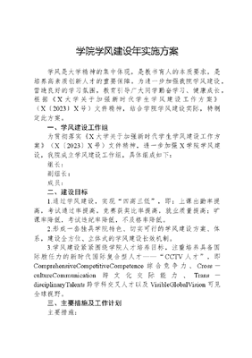 学院学风建设年实施方案学风是大学精神的集中体现,是教书育人的本质要求,是培养高素质创新人才的重要保障。为进一步加强我院学风建设,营造良好的学习氛围,教育引导广大同学勤奋学习、健康成长,根据《X大学关于加强新时代学生学风建设工作方案》(X〔2023〕X号)文件精神,结合学院学风建设实际,特制定此方案。一、学风建设工作组为贯彻落实《X大学关于加强新时代学生学风建设工作方案》(X〔2023〕X号)文件精神,进一步加强X学院学风建设,我院成立学风建设工作组,具体组成如下:组长:副组长:成员:二、建设目标1.通过学风建设,实现四高三低,即:上课出勤率提高,考试通过率提高,竞赛获奖比率提高,就业质量提高;旷课率降低,考试违纪率降低,不及格率降低。2.形成一套独具学院特色、切实可行的学风建设方案、体系,建设全方位、立体式的学风建设长效机制。3.学风建设紧紧围绕学院人才培养目标,注重培养具备国际胜任力的新时代国际复合型人才——CCTV人才,即ComprehensiveCompetitiveCompetence综合竞争力、Cross-cultureCommunication跨文化交际能力、Trans-disciplinaryTalents跨学科交叉人才以及VisibleGlobalVision可见全球视野。三、主要措施及工作计划主要措施:(一)全员育人,形成学风建设合力(负责人:院领导、系主任、班主任、教务老师、辅导员、学生骨干)构建学院领导-班主任-教务老师-辅导员-学生骨干五位一体学风建设常态化机制。院领导高度重视,召开学风建设专题工作会议,成立学风建设工作组。院领导带头开展调查研究,深入课堂与学生开展谈心谈话、学风调研,利用课间进行学风浸润,推动学风建设走深走实。班主任、辅导员召开学风主题班会、座谈会,了解学生学习之困、生活之难,关注学生个体差异,制定针对性的帮扶措施。教务老师要与任课教师、辅导员保持密切沟通,及时反馈学风建设的情况和问题,做好学困生、学业预警学生的反馈提醒机制。学生骨干要发挥示范引领作用,自觉遵守纪律,积极参与课堂,带动周围同学共同进步。通过这种五位一体的学风建设常态化机制,形成齐抓共管、多方联动的工作格局,推动学风建设不断向纵深发展。同时,要增强全体学生的主体意识和责任感,使他们在学风建设中既是受益者,也是参与者和推动者。(二)以教促学,以教风引领学风(系主任、任课教师)任课教师在学风建设中起着主导作用。任课教师要以身作则,自觉遵守教学纪律,严于律己,做到不迟到、不早退,认真组织课堂教育教学活动,以渊博的知识浇灌学生,以独特的人格魅力吸引学生,以良好的教风影响学生,努力营造积极向上、健康和谐的课堂教学氛围。教学是第一课堂,要充分发挥第一课堂在学风建设中的作用,任课教师要明确课堂纪律,完善考勤制度,掌握学生的出勤率,对无故旷课的学生高度重视及时处理。对于多次无故旷课(单门课旷课三次及以上)的学生,任课教师要主动联系辅导员,说明情况,并采取适当的措施进行教育和管理。任课教师要着眼学生发展,因材施教,结合课程特点形成多元化的考核评价体系,以过程性考核为引领,加强对学生学习过程和进步程度的关注。通过定期的课堂测验、作业检查和阶段性评估,及时发现学生在学习中的问题,并提供有针对性的指导和帮助。任课教师要充分利用班委的力量,形成教学与学生自治的有机结合,借助班委的力量开展学风建设活动。各系要高度重视学风建设,系主任牵头召开专题会议传达学院学风建设年实施方案,结合学院文件要求布置本系学风建设工作,要求各任课老师自觉做好学风建设相关工作。(三)学以致用,以实践强学风(院领导、系主任、辅导员、班主任、学生党员、团学骨干)立足专业特色,开展外语+志愿服务。依托院团委薜荔志愿者队伍多队并行的框架,充分利用我院外语专业资源,以正式党员、预备党员、发展对象、入党积极分子为主力,立足荔园、面向社会,开展薜荔支教、优格小课堂(包含党史+英语课、英语口语课、英语绘本课、英语配音课、西班牙语入门课等)、大学英语四六级助力课、学院大类平台课助教志愿服务项目、小语种入门课、校内大学英语视听说助教志愿服务项目等。鼓励学生发挥专业特长,参与外语外事、国际赛事、国际会议等国际化志愿实践,提高跨文化交流能力。与市国际交流合作基金会等开展深度合作,打造更多国际化志愿服务项目,为我院学生提供更多外语+志愿服务的实践平台,促进学生在学中用,在用中学。着眼专业发展,开展专业实践。为提高学生的专业认同感,加深对专业发展前景、职业发展方向的了解,学院通过走出去请进来相结合的方式,广泛联系用人单位,开展专业实习实践、访企拓岗、交流访学等系列活动。不断探索就业育人新模式,我院与人力资源机构、用人单位合作,开展就业供需育人对接项目,建立产教融