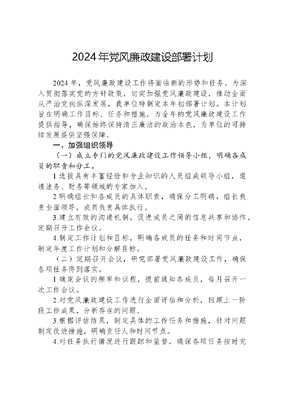 2024年党风廉政建设部署计划2024 年,党风廉政建设工作将面临新的形势和任务。为深入贯彻落实党的方针政策,切实加强党风廉政建设,推动全面从严治党向纵深发展,我单位特制定本年初部署计划。本计划旨在明确工作目标、任务和措施,为全年的党风廉政建设工作提供指导,确保始终保持清正廉洁的政治本色,为单位的可持续发展提供坚强保障。一、加强组织领导(一)成立专门的党风廉政建设工作领导小组,明确各成员的职责和分工。1.选拔具有丰富经验和专业知识的人员组成领导小组,邀请法务、财务等领域的专家加入。2.明确组长和各成员的具体职责,确保分工明确,组长负责全面领导,成员负责具体执行。3.建立有效的沟通机制,促进成员之间的信息共享和协作,定期召开工作会议。4.制定工作计划和目标,明确各成员的任务和时间节点,制定年度工作计划和分解目标。(二)定期召开会议,研究部署党风廉政建设工作,确保各项任务得到落实。1.确定会议的频率和议程,提前通知各成员,每月召开一次工作会议。2.对党风廉政建设工作进行全面评估和分析,回顾上一阶段工作成果,分析存在的问题。3.根据评估结果,制定具体的工作任务和措施,针对问题制定改进措施,明确责任人和时间节点。4.对任务执行情况进行跟踪和监督,确保各项任务按时完成,建立任务跟踪机制,定期汇报进展情况。(三)各部门之间要加强协作配合,形成工作合力。1.建立跨部门的工作机制和流程,明确协作的方式和流程,制定跨部门协作的规章制度。2.加强部门之间的信息交流和共享,定期组织部门间的交流会议。3.针对重大问题或项目,成立联合工作小组,共同推进工作,针对重要项目成立专项工作组。4.建立激励机制,鼓励各部门积极协作,对协作表现优秀的部门给予奖励。(四)加强对党风廉政建设工作的考核,将其纳入绩效评价体系。1.制定具体的考核指标和标准,党风廉政建设工作的完成情况、廉洁自律情况等。2.将考核结果与个人绩效挂钩,与奖金、晋升等挂钩,激励员工积极参与。3.定期进行考核评估,及时发现问题并进行整改,每季度进行一次考核。4.对考核结果进行公示和反馈,通过公司内部通告或会议进行公示。二、加强思想教育(一)加强思想教育日常工作的开展1.定期组织廉政教育培训,邀请专家学者或相关部门负责人进行授课,讲解党的纪律、法规以及单位的廉政制度等内容。2.开展案例分析与讨论活动,通过实际案例让员工深刻理解廉政的重要性,并引导员工讨论如何避免类似问题的发生。3.组织观看廉政教育片、参观廉政教育基地等活动,让员工亲身感受廉政文化的熏陶。4.举办廉政文化征文活动,鼓励员工撰写廉政主题文章,优秀作品可以在内刊、官网等平台发布。文可居文库——海量学习资料,手机电脑下载www.wenkeju.com5.开展廉政故事分享会,让员工分享自己身边的廉政故事,从中汲取正能量。(二)开展廉政主题特色活动1.举办廉政主题讲座,邀请业内权威人士或廉政模范进行经验分享,为员工提供实际指导。2.组织廉政展览,展示廉政文化的历史、现状和发展趋势,让员工更直观地了解廉政的重要性。3.开展廉政角色扮演活动,通过模拟真实场景,让员工体验不同角色在廉政问题上的决策和行为。4.组织廉政文艺表演,如小品、相声、歌舞等形式,增强活动的趣味性和感染力。5.开展廉政游戏活动,如廉政拼图、廉政谜语等,让员工在游戏中学习廉政知识。6.设立廉政文化角,展示与廉政相关的书籍、杂志、影视作品等,为员工提供自主学习的资源。(三)利用本单位内部媒体平台宣传廉政文化1.在本单位内刊上开设廉政专栏,定期发布廉政文章、案例分析、政策解读等内容。2.优化本单位官网的廉政板块,及时更新廉政动态、宣传视频等资料,方便员工随时查阅。3.利用微信群、企业微信等即时通讯工具,推送廉政资讯、提醒信息等,让廉政文化融入员工日常生活。4.制作廉政主题的短视频或动画,在单位内部电视屏幕、电梯等场所循环播放,提高廉政文化的曝光度。5.开展廉政文化线上互动活动,如在线答题、投票等,增加员工的参与度。6.设立廉政信箱或在线反馈渠道,鼓励员工提出对廉政工作的意见和建议。7.邀请员工参与廉政宣传素材的创作,如拍摄廉政照片、制作廉政表情包等,提高员工的积极性。文可居文库——海量学习资料,手机电脑下载www.wenkeju.com8.组织廉政文化宣传志愿者团队,通过他们在公司内部进行宣传和推广。(四)树立廉洁榜样1.评选公司内部的廉政先进个人或集体,给予表彰和奖励。2.邀请廉政先进典型进行经验分享,让其他员工学习他们的做法和精神。3.为廉政先进个人或集体制作宣传资料,如事迹展板、宣传视频等,在公司内广泛宣传。4.建立廉政榜样的培养机制,提供培训和发展机会,激励更多员工成为廉洁榜样。5.将廉洁榜样的事迹纳入公司的企业文化宣传中,让其成为公司价值观的一部分。6