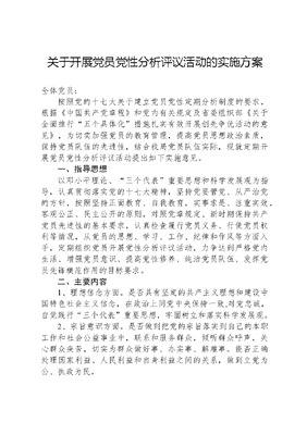 关于开展党员党性分析评议活动的实施方案全体党员:按照党的十七大关于建立党员党性定期分析制度的要求,根据《中国共产党章程》和党内有关规定及省委组织部《关于全面推行五个具体化措施扎实有效开展创先争优活动的意见》,为切实加强党员的教育管理,提高党员思想政治素质,保持党员队伍的先进性,结合我局党员队伍实际,现就定期开展党员党性分析评议活动提出如下实施意见。一、指导思想以邓小平理论、三个代表重要思想和科学发展观为指导,认真贯彻落实党的十七大精神,坚持党要管党、从严治党的方针,按照坚持正面教育、自我教育,实事求是、注重实效,客观公正、民主公开的原则,对照党章规定、新时期保持共产党员先进性的基本要求,认真检查履行党员义务、行使党员权利等情况,从党员的思想、学习、工作、纪律和作风等方面入手,定期组织党员开展党性分析评议活动,力争达到严格党内生活、增强党员意识、提高党性修养、纯洁党员队伍、发挥党员先锋模范作用的目标要求。二、主要内容1、理想信念方面。是否具有坚定的共产主义理想和建设中国特色社会主义信念,在政治上同党中央保持一致,对党忠诚,自觉践行三个代表重要思想,牢固树立和落实科学发展观。2、宗旨意识方面。是否做到把党的宗旨落实到自己的本职工作和社会公益事业中,联系和服务群众,倾听群众呼声,关心群众疾苦,切实为群众做好事、办实事、解难事。能否正确处理国家利益、人民利益和自身利益之间的关系,做到立党为公、执政为民。3、遵纪守法方面。是否遵守党的纪律,维护党的团结统一,以身作则、严于律己,清正廉洁、拒腐防变,带头维护党纪的严肃性;是否自觉贯彻依法治国的基本方略,遵守国家法律法规,自觉抵制不正之风和各种腐败现象,敢于同各种违法违纪行为作斗争。4、学习方面。是否自觉加强理论学习,做到真学、真懂、真信、真用,不断提高运用科学理论分析和解决实际问题的能力,增强贯彻落实科学发展观的自觉性和坚定性。是否勤奋学习科学文化等各方面的知识和技能,不断提高综合素质和工作能力。5、工作方面。是否具有强烈的事业心和责任感,是否坚持勤奋工作,认真履行岗位职责,在生产、工作中勇于创新、创造一流业绩,发挥先锋模范作用,在构建富裕文明和谐的白城和实现跨越式发展中贡献力量。党员领导干部还应对照党章规定的党员领导干部的基本要求,从坚持科学发展观和树立落实正确政绩观、权力观、地位观、利益观以及廉洁自律等方面深入剖析存在的问题及其根源。6、作风方面。是否坚持求真务实,讲实话、办实事;是否牢记两个务必,艰苦奋斗,谦虚谨慎;是否树立社会主义荣辱观,模范遵守社会公德,在精神文明建设和构建和谐社会中保持共产党人的政治本色。三、方法步骤党员党性定期分析评议在局党组统一领导下进行,以科室为单位开展分析评议活动,年中至少开展一次集中分析评议活动,每次活动不少于一周时间。具体应按以下步骤进行:1、思想动员。组织党员集中学习党章、科学发展观、十七大精神等、《廉政准则》,根据党员的实际情况采取自学、专题辅导、上党课等形式,明确开展党性分析子活动的重要意义,提高对党性分析评议的认识。2、征求意见。以科室为单位,通过发放征求意见表、设置文可居文库——海量学习资料,手机电脑下载www.wenkeju.com意见箱、召开座谈会等形式,广泛征求干部群众对党员的意见和建议,并认真归纳梳理,如实向党员本人反馈。3、谈心交心。党员领导干部与普通党员之间、领导班子成员之间、普通党员之间普遍开展谈心交心,沟通思想、找准问题、形成共识、增进团结。4、撰写党性分析材料。党员要对照党章的规定和党员保持先进性的具体要求,查找自身不足和存在的突出问题,结合征求意见的情况,认真撰写党性分析材料。党性分析材料的主要内容为:查摆存在的主要问题、剖析思想根源、明确努力方向。5、召开专题组织生活会,开展批评与自我批评。在专题组织生活会上,组织党员逐个进行党性分析,党员之间相互进行评议,开展批评。党员领导干部要带头以普通党员身份自觉参加专题组织生活会,带头进行党性分析。6、提出评议意见。专题组织生活会后,要召开支委会,根据党员的一贯表现、党性分析评议情况和群众意见,运用定性分析和定量分析相结合的方法,对每个党员提出初步的评议意见,征求本人意见后,形成正式的组织意见。肯定成绩,指出问题,指出整改方向。7、制定整改措施。党支部指导每个党员根据党性分析评议中查摆出来的突出问题,认真制定切合实际的整改措施,并督促落实。8、通报分析评议情况。党支部采取适当的方式,在一定范围内向党员和群众通报党性分析评议情况。通报的内容包括:专题组织生活会的基本情况,党员存在的主要问题、整改措施、整改期限等有关情况。9、上报党性分析评议情况报告。党性分析评议结束后,各科室要就组织开展党性分析评议的有关情况向上级党组织写出专题报告。文可居文库——海量