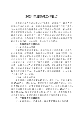 2024年县商务工作要点今年是中华人民共和国成立75周年,是实现十四五规划目标任务的关键一年,做好全年的商务和旅游工作意义重大。为加快推进我县传统服务业向现代服务业转型升级,着力构建现代商贸流通新体系,大力推动旅游产业发展,积极推进电子商务进农村,全面完成十四五规划关键之年的商贸业旅游业目标任务,为加快建设丘区经济文化生态强县和幸福美丽X做出更大的贡献,结合实际,提出如下工作要点。一、总体思路及主要目标(一)工作总体思路认真贯彻落实省市商务、旅游工作会议以及县委十二届九次全会精神,按照县委、县政府的决策部署,以规划引领、环境改善、特色培育和载体建设为重点,以优化商业网点布局和业态结构为主线,通过改造、新建、完善商业基础设施,培育大型流通主体,逐步形成城内大商场、城区特色街、城郊大市场、全域大物流的商贸服务新格局;深化普及电子商务应用,推动电子商务产业集聚发展;有效整合旅游资源,搭建投融资和开发建设平台,强力推进重大旅游项目建设,大力发展十全十美乡村旅游。(二)主要目标任务全年实现社消零总额150.47亿元,增长11%,服务业增加值87.66亿元,增长9.4%;实现外贸进出口3200万美元,到位外资200万美元;电商交易额突破60亿元,力争达到65亿元,其中网络零售额达到18亿元以上;实现旅游收入45.02亿元,增长23.01%;固定资产投资达到4.5亿元,对上争取项目资金力争增长20%;全面完成电子商务进农村示范县建设任务。二、工作重点及主要措施(一)优化环境,完善体系,推动商贸服务业持续发展1、努力营造发展氛围。积极引导商贸服务业企业调结构、促发展,积极适应经济新常态。建立服务业发展促进机制,出台促进社消零发展的配套政策,全面落实《X县进一步促进商贸企业发展办法》,鼓励扶持县内商贸企业和个体经营户做大做强,吸引知名企业到X投资。加大对限额以上企业及个体经营户跟踪服务力度,不断改善企业发展环境。落实部门责任分工,强化目标绩效考核,实现新增规上企业3-5家,服务业增加值增长9.4%以上,社消零总额增长11%以上。2、全力做好社消零工作。抓好奖励政策宣传执行,成立限上单位经济运行监测工作机构,加大对限额以上企业及个体经营户跟踪服务力度,定期监测各行业、各单位消费品零售额完成情况,把限上单位数据上报工作落实到X乡和社区,形成多部门协作、上下联动的工作机制,确保社消零增长水平符合X实际。狠抓限上规上商贸服务企业的入库工作,积极引导在库个体工商户转变为法人企业。鼓励有条件的X乡整合资源,发展批零住餐法人单位申报入库。3、保障市场供应安全。加强市场监测检查和应急物资监管工作,督促监测样本企业数据上报及审核工作,每月监测数据上报率达到100%。保障监测系统正常运转,加强市场检查,引导市场运行平稳有序,营造放心、舒心的市场环境。做好生活必需品、应急物资日常监管和月度检查,按照制度完善、管理严格、运行高效的储备要求,确保有效应对突发自然灾害和其他突发事件引发的生活必需品市场异常波动,保障市场平稳运行。4、营造法制化营商环境。完善县双打工作领导小组,按照省、市打击侵权假冒工作领导小组的工作部署,督促领导小组成员单位按职能职责抓好双打工作。规范单用途商务预付卡发放和使用,健全监管机制,促进商业预付卡健康发展,确保群众便利消费和市场繁荣。5、推动重点商贸项目建设。以城乡商业网点规划为指导,文可居文库——海量学习资料,手机电脑均可下载www.wenkeju.com完善商业网点支撑。抓好X黄金商业圈、梓锦新城片区商业中心、台北国际商业广场建设;启动城北新区城市商业综合体招商工作,构建集商务办公、会议、餐饮、住宿、购物等功能于一体的城北新区商业中心;继续推进大成国际建材装饰城、昌德商业广场项目建设,打造X专业商贸市场;积极引导佳桥、四通等汽车销售服务公司上档升级,逐步形成汇聚销售、租赁、配件、维修、美容等功能完备的的汽车城;推动五里梁片区农副产品交易中心建设,持续抓好42个乡X中心农贸市场和20个社区农贸市场建设;加快推进百惠通物流园和龙聚仓储物流项目建设进程。(二)加强协调,主动服务,推动对外贸易稳定发展1、加强沟通协调。加强同上级部门、县财政和县内企业的联系,对重点企业定期沟通,及时了解企业动态,协调解决企业在外贸方面的困难和问题。努力培植自营出口企业,壮大外贸出口队伍。力争全年新引进外资企业1家,新增进出口实绩企业1家,进出口额达到3200万美元。2、强化帮扶服务。积极争取县本级和上级外经贸财政扶持政策,保持对外贸易稳定增长。加大出口信用保险支持力度,鼓励保险公司扩大短期出口信用保险业务,为企业扩大出口提供支撑。3、提升服务意识。继续做好促进我县对外贸易稳定增长工作,进一步抓好对有订单、有效益的外贸企业特别