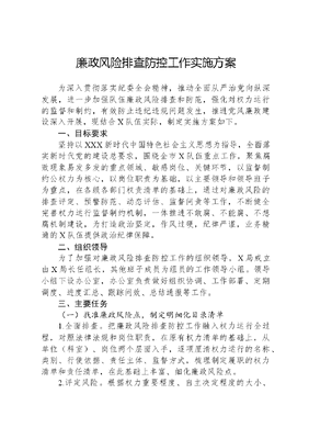 廉政风险排查防控工作实施方案为深入贯彻落实纪委全会精神,推动全面从严治党向纵深发展,进一步加强队伍廉政风险排查和防范,强化对权力运行的监督和制约,有效防止违纪违规问题发生,推进党风廉政建设深入开展,现结合X队伍实际,制定实施方案如下。一、目标要求坚持以XXX新时代中国特色社会主义思想为指导,全面落实新时代党的建设总要求,围绕全市X队伍重点工作,聚焦腐败现象易发多发的重点领域、敏感岗位、关键环节,以监督制约公权力为核心,以岗位职责为基础,以主要领导和领导班子为重点,在各级各部门权责清单的基础上,通过对廉政风险的排查评定、预警防范、动态评估、监督问责等工作,不断健全完善权力运行监督制约机制,一体推进不敢腐、不能腐、不想腐机制建设,为打造政治坚定,作风过硬,纪律严谨,业务精通的X队伍提供政治纪律保障。二、组织领导为了加强对廉政风险排查防控工作的组织领导,X局成立由X局长任组长,其他班子成员为组员的工作领导小组。领导小组下设办公室,办公室负责做好组织协调、工作部署、定期调度、进度汇总、跟踪问效、总结通报等工作。三、主要任务(一)找准廉政风险点,制定明细化目录清单1.全面排查。把廉政风险排查防控工作融入权力运行全过程,对照法律法规和岗位职责,在原有权力清单的基础上,从单位(科室)、岗位两个层面入手,逐项厘清权力运行的名称、类别、行使依据、责任主体、监督方式,梳理制定履职的权力清单和责任清单,在此基础上丰富、细化廉政风险点。2.评定风险。根据权力重要程度、自主决定程度的大小、腐败现象发生的概率和危害程度等因素,按照高、中、低三个类别评定廉政风险等级。3.细化清单。在风险排查、评定等级的基础上,形成初步的单位(科室)廉政风险等级目录清单。(二)完善防控措施,健全防控机制1.岗位定措施。对照廉政风险点,将防控责任层层分解落实到岗位,结合岗位职责,提出针对性的防控措施。2.强化内部风险管控。要坚持以问题为导向,对现有的工作程序、业务流程、管理方式进行认真梳理,细化内控措施,落实防控责任,健全完善内控机制。(三)加强排查评估,实时预警处置1.动态调整清单。通过上级党委巡视巡察、纪检监督检查、审计监督、舆情信访、民主评议等渠道,全面收集廉政风险信息,不断动态完善廉政风险等级目录清单。2.定期开展评估。对于廉政风险排查、防控措施、防控机制实施运行等情况,每三年要开展一次分析、研判和评估,及时校正偏差、改进不足,不断完善廉政风险排查防控机制。3.实时预警处置。对于指战员存在的苗头性、倾向性问题,要深化运用第一种形态,通过提醒谈话、批评教育、限期改正等措施,让咬耳扯袖、红脸出汗成为常态。避免廉政风险管控失效,苗头性、倾向性问题发展成违纪违法问题。四、工作步骤(一)动员部署、深入排查廉政风险点阶段。按照X局党委廉政风险排查防控工作要求,及时召开单位(科室)会议,细化工作方案,明确职责分工,迅速开展廉政风险点排查工作。一是岗位排查。组织指战员根据岗位职责,认真梳理行使职权过程中可能存在的廉政风险,确定个人岗位廉政风险点。二是单位(科室)排查。在岗位自查的基础上,对本单位(科室)权力运行的重点环节、关键部位可能存在的廉政风险进行排查,并根据权力重要程度、自主决定程度的大小、腐败现象发生的文可居文库——海量学习资料,手机电脑均可下载www.wenkeju.com概率和危害程度等因素,按照高、中、低三个类别评定廉政风险等级,明确防范责任和措施,形成单位(科室)权力廉政风险等级目录清单。三是追溯排查。在自查自摆的基础上,从人、财、物三个角度纵向摸排本单位可能存在的历史遗留廉政风险,包括可能存在的指战员违纪违法问题线索,可能引发信访举报的潜在人员矛盾冲突、长期拖欠的财务欠款,可能导致资产流失的装备外借及可能导致安全事故的车辆器材故障及营区安全隐患,形成单位(科室)历史遗留廉政风险汇总表。(二)动态防控、健全内控制度机制阶段。一是健全内控机制。针对查找出的廉政风险点和问题,认真进行研究分析,分别制定防范风险的具体措施、工作制度,形成严密的内控机制。二是落实防控责任制。按照权责一致、错责相当的原则,对排查出的每一个廉政风险点逐个明确防控责任,做到岗位责任明确、领导责任明确,防控责任明确。三是建立排查机制。各科室(单位)要结合廉政风险提示等制度,建立符合本科室(单位)实际的定期廉政风险动态排查防控机制,及时纠正工作中的失误和偏差,化解廉政风险,堵塞制度漏洞,避免苗头性、倾向性问题演化为违纪违法问题。四是制定防范措施。根据不同廉政风险等级,分别制定相应的防范措施。重点防范等级较高的廉政风险点,对属于集中度较高的权力要进行合理分解和科学配置,建立权力运行不同环节之间的有效监控、制约机制。五、工作要求(一)强化领导,压实责任。各级党组织要认真履行从严治党主