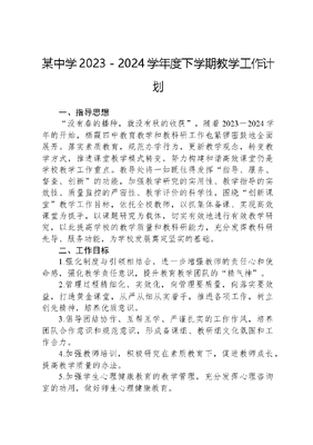 某中学2023-2024学年度下学期教学工作计划一、指导思想没有春的播种,就没有秋的收获,随着2023-2024学年的开始,栖霞四中教育教学和教科研工作也紧锣密鼓地全面展开。落实素质教育,规范办学行为,更新教学观念,转变教学方式,推进课堂教学模式转变,努力构建和谐高效课堂仍是学校教学工作重点。教导处将一如既往得发挥指导、服务、督查、创新的功能,加强教学研究的实用性、教学指导的实效性、质量监控的严密性、教学评价的科学性,围绕创新课堂教学工作目标,依托全校教师,以抓集体备课、实现高效课堂为抓手,以课题研究为载体,切实有效地进行有效教学研究,以此提高学校的教学质量和教科研能力,充分发挥教科研先导、服务功能,为学校发展奠定坚实的基础。二、工作目标1.强化制度与引领相结合,进一步增强教师的责任心和使命感,强化教学责任意识,提升教育教学团队的精气神。2.管理过程精细化、实效化,向管理要质量,向落实要效益,打造黄金课堂,从严从细从实着手,推进各项工作,树立创先精神,培养优质意识。3.倡导团结协作、互帮互学、严谨扎实的工作作风,培养团队合作意识和规范意识,形成备课组、教研组文化氛围和工作合力。4.加强教师培训,积极研究在素质教育下,促进教师成长,提高教学质量的办法。5.加强学生心理健康教育的教学管理,充分发挥心理咨询室的功用,做好师生心理健康教育。三、工作措施(一)细化各项管理,提高工作质量1.规范课程实施。(1)进一步规范办学行为,认真贯彻《普通高中课程方案》等文件的有关精神,规范课程建设、课时计划、作息时间和学生课后作业。严格执行国家新课程计划,开足开齐国家课程,开发校本课程和地方课程,深入开展研究性学习课程。(2)抓好三表的制定和管理。作息时间表、教学计划表和课程表的贯彻落实是教学秩序稳定的关键。严格按照山东省素质教育要求,制定作息时间表,并认真执行;抓好教研组、备课组、教师的教学计划的制定,各阶段教学活动有计划、有措施、有总结;维护课程表的严肃性和权威性,教师必须严格按课程表上课,不迟到、不早退,不擅自调课。2.重视组室建设。继续加强教研组、备课组建设,开展项目化教科改实验,深化精研真学课堂教学研究,发挥学科组、备课组教学先锋队作用。教研组长、备课组长要强化责任意识、质量意识,以身作则,肯吃苦、肯学习、肯钻研。以教学现场为载体,加强调研,细化随堂听课要求,做到及时看、经常听、随时查、认真评,发现问题及时解决。备课组长要根据学生实际,抓好集体备课环节,认真指导编写好高质量的教学案,依据大纲、考纲,精选习题。3.严格学籍管理。搞好学籍注册工作,严格执行学籍管理的有关规定,抓好学生档案、转学、退学、休学、毕业的相关资料,并妥善保管。按上级要求,及时上传上报相关表册或数据,使学籍管理制度化,规范化。每学期对各年级组织一次学生成长记录的填写培训工作,督促班主任如实填写学生所修各科学分,充分发挥基础素养评价对学生的促进作用。按时填写学生发展报告,并妥善地专人保管好。4.加强服务保障。督促文印室和各级部严格执行印刷制度,加强对印刷数量、质量的监控和管理,保证印刷质量,控制印刷数量,节约开支。每学期末文印室管理员统计各年级印刷情文可居文库——海量学习资料,手机电脑均可下载www.wenkeju.com况上报教导处。5.改进质量监测。认真组织好模块测试、学业水平考试,加强考试期间的管理工作,做好考试前的各项准备,如编排布置考场、编印监考表,做到每次考试都有专人负责,对学生进行考风考纪教育,杜绝作弊行为。做好各年级的质量分析,认真研究分析教与学,做出正确的客观评价,召开师生座谈会,开展学生问卷调查,分析教学情况,提出针对性的改进措施,将质量分析落到实处。(二)抓实常规要求,改进工作效率加强和优化教学过程管理,是深化教学改革,提高教学质量的保证,要根据新课程改革和素质教育的要求,对教学过程的各个环节,进行分析研究,狠抓教学常规的落实,做到精细化管理。1.提升教研品质。创新开展学校项目化教科研研究,继续推进我校《学科教学与美育教育》的课题研究,巩固《读辟蹊径》阅读教学在全校的深入广泛开展,持续强化常规教研活动,改进集体备课方式,细化集体备课效果要求,提高教师课堂教学质量。搭建教师成长平台,开展校内教学大比武、示范课展示等活动,引进学科网、高考备考网等的丰富资源,开展青蓝工程,推进骨干教师发光发热,发挥体育教师的师资能量,利用青年教师的青春活力和业余特长,丰富学生学习生活,拓展学校办学思路,提升师生教学活力,为学生成才、教师发展、社会满意闯出特色之路。2.抓牢教学规范。开学初,教导处组织教研组、备课组、任课教师做好学期计划,督促各年级落实《烟台市普通高中办学水平评估方案》工作要点,并在工作中做好对教学常规、集备、课堂纪律和课