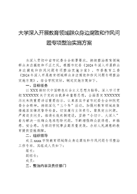 大学深入开展教育领域群众身边腐败和作风问题专项整治实施方案为深入贯彻中省市纪委全会部署要求,持续整治教育领域群众身边腐败和不正之风,根据市纪委《2024年深入开展群众身边腐败和作风问题专项整治实施方案》,市委教育工委《2024年深入开展教育领域群众身边腐败和作风问题专项整治实施方案》,结合学院实际,制定实施方案如下。一、目标任务以XXX新时代中国特色社会主义思想为指导,深入学习贯彻XXXXXX关于党的自我革命重要思想,全面落实XXXXXX历次来陕重要讲话重要指示,认真落实中省市纪委全会和院党委全会精神,持续深化三个年活动,加强对教育领域政策措施落实情况督导检查,切实履行主体责任,聚焦突出问题,严肃追责问责,推进长效机制建设,坚持小切口、大深入着力解决一批群众急难愁盼问题,不断增强群众获得感、幸福感、安全感,为推动学院事业高质量发展,办好人民满意的教育提供坚强保障。二、组织领导成立xxxx学院教育领域群众身边腐败和作风问题专项整治工作专班,其组成人员如下:组长:副组长:成员:三、整治内容及责任部门(一)强制学生购买教材教具、违规收取补课费问题整治措施:1.加强督导检查,重点排查是否存在强制或变相强制学生和家长购买教材教具、违规收取补课费等问题;2.加强学院收费政策宣传,完善收费信息公示公开制度。3.畅通群众反映问题渠道,客观准确运用政策规定,及时调查核实群众反映的问题;4.对以权谋私、搞利益输送的线索及时移送相关学院纪委、组织人事处处置。牵头部门:教务处责任部门:各二级学院、纪委、组织人事处、学生处、计财处、继续教育学院(二)教职工有偿补课、违规收取礼品礼金问题整治措施:1.通过院内巡察、监督检查等方式,拉网式排查个别教职工是否存在违规有偿补课、违规收受礼品礼金、违反新时代高校教师职业行为十项准则等问题;2.畅通监督举报渠道,加大教职工违纪违规问题的曝光处罚力度,强化震慑效应;3.持续完善师德师风建设机制,加强师德师风教育培训,表彰一批最美教师、优秀教师、优秀辅导员;4.健全师德师风档案及考评机制,实行失德失范一票否决制。牵头部门:组织人事处责任部门:各二级学院、学院办公室、纪委、学生处(三)校园食品安全管理不规范问题整治措施:1.健全食品安全管理制度,落实日管控、周排查、月调度要求,定期组织开展食品安全隐患排查和有害生物防治;2.加大对学校食堂、学校食堂承包经营企业监督检查力度,规范进货查验、从业人员健康管理、食品贮存加工、餐饮具清洗消毒、食品留样等重点环节;3.加强与公安、城管,食药监等部门的协调配合,努力做好校园周边食品小作坊和移动摊贩的监督管理,努力净化校园周边食品安全环境;4.加大互联网文可居文库——海量学习资料,手机电脑均可下载www.wenkeju.com+明厨亮灶建设,有效运用信息化手段抓好校园食品安全管理;5.开展校园爱国卫生运动主题宣传,加强环境卫生综合治理,对师生进行健康教育,提高师生防病意识和自我保护能力。牵头部门:后勤处责任部门:各二级学院、学生处、保卫处(四)财务管理不规范、私设小金库、滥发津补问题整治措施:1.加强财务管理,严格落实大项支出财经委员会预审、专项资金项目库管理等制度,严把财务关口;2.配合上级纪检、财政、审计部门,做好财务审计服务工作;3.加强基建、国资、后勤等重点敏感领域财务内控建设,推动源头预防,规范业务流程,紧盯业务风险点,不断完善相应制度机制;4.加强资金预算、票据审核、资金支付、账务登记、学费收取等各环节的日常监督和检查,及时通报检查结果并及时纠正,以有效问责强化管理;5.综合运用院内巡察、监督检查、财务审计等手段,加强对二级部门的督导排查,严查私设小金库、滥发津补问题。牵头部门:计财处责任部门:各二级学院、纪委、审计处、学院办公室、基建处、国资处、后勤处四、步骤安排专项整治从2024年4月份开始,至12月底结束,此后转入常态化。1.全面动员部署。4月底之前,各牵头、责任部门要及时对专项整治工作进行安排部署,制定方案,明确任务、夯实责任,确保工作落实。2.深入整改纠治。6月底前,各牵头、责任部门要结合工作实际,深入排查整治内容,对查摆出的问题,建立清单,制定具体举措,精准有序整治,形成自查报告。3.加强监督检查。学院不定期对各部门自查自纠情况进行督导检查,督促各部门抓好问题整改。学院纪委每月定期对各文可居文库——海量学习资料,手机电脑均可下载www.wenkeju.com部门开展专项整治情况进行监督检查,重点检查各部门安排部署、全面排查、台账建立和整改落实情况。各牵头部门要向学院教育领域专项整治工作专班定期报送工作进展情况。4.完成健全制度。注重在问题中查找工作短板,制度漏洞和廉政风险点,把摸排自查、解决问题、建立完善制度贯