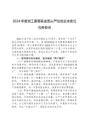 2024年度党工委落实全面从严治党主体责任任务安排2024年是中华人民共和国成立75周年,是实现十四五规划目标任务的关键一年,是XXXXXX亲自擘画新福建宏伟蓝图10周年。党工委要坚持以XXX新时代中国特色社会主义思想为指导,全面贯彻落实党的XXX和二十届二中全会精神,巩固拓展主题教育成果,深化全面从严治党,为助力中国式现代化X实践贡献力量。一、坚持强化政治建设,坚决做到两个维护(一)坚持和加强党的全面领导。严格执行关于坚决维护党中央集中统一领导的若干规定,坚决贯彻执行XXXXXX重要讲话重要指示批示精神和上级决策部署,坚定拥护两个确立、坚决做到两个维护。(二)深化拓展深学争优、敢为争先、实干争效行动聚焦全市主旋律,以一批重点专项工作为抓手,推动机关高效协同、一体联动、滚动实施、压茬推进,确保上级决策部署在党工委率先贯彻、深化落实。积极培育选树深化拓展三争行动典型案例,进一步营造担当敢为、奋勇争先的浓厚氛围。(三)严肃开展党内政治生活。按照新形势下党内政治生活若干准则,严格执行三重一大集体决议,落实重大事项报告制度,切实提高党内政治生活质量。从严从实开展民主生活会和组织生活会,深刻查摆问题,深入剖析原因,明确改进方向,以正视问题的自觉和刀刃向内的勇气,开展批评与自我批评,形成红脸出汗、团结队伍的正向作用。二、坚持深化理论武装,凝心铸魂筑牢根基(一)深化党的创新理论武装。坚持不懈用党的创新理论铸魂育人,把学习贯彻党的XXX精神作为首要政治任务,把XXXXXX重要讲话和重要指示批示精神作为第一议题来学习、第一遵循抓贯彻、第一政治要件抓落实。实施五学联动体系,对照年度党工委理论学习中心组学习计划,深化学习交流,提升学习质效。积极用好学习强国等载体平台,引导党员干部深学细悟党的创新理论。以管委会青年理论学习小组为重要载体,聚焦政治理论、专业知识、党章党规党纪等主题经常性开展集体学习活动,常态化办好X讲堂,打造青年干部理论武装阵地。(二)巩固拓展主题教育成果。认真贯彻落实中央关于巩固拓展主题教育成果《意见》和省、市《实施意见》,持续巩固深化主题教育成果,建立健全长效机制,推动党员干部做XXX新时代中国特色社会主义思想的坚定信仰者和忠实实践者。按照党中央部署,组织开展集中性纪律教育,通过开展专题学习、警示教育等,引导党员干部学纪、知纪、明纪、守纪。(三)筑牢意识形态阵地。认真学习贯彻《党委(党组)意识形态工作责任制实施办法》《关于新时代加强和改进思想政治工作的意见》等文件精神,明确意识形态工作职责所在,确保各项工作体现意识形态工作的要求,有效维护好意识形态安全。三、坚持贯彻组织路线,建设过硬干部队伍(一)夯实组织规范化标准化建设。严格落实党内政治制度,党工委、管委会领导班子成员自觉落实双重组织生活制度,党支部切实抓好三会一课、主题党日等各项制度的落实,不断提升组织生活质量。(二)打造高素质专业化干部队伍。围绕增强七种能力、提升八项本领,积极组织党员干部参加上级举办的各类培训班,不断提高党员干部综合素质和履职能力。继续抓文可居文库——海量学习资料,手机电脑均可下载www.wenkeju.com好干部交流轮岗,加强年轻干部的培养管理,通过互动交流、专项行动等方式进行递进式培养,让干部在一线创业打拼、墩苗历练。四、坚持突出从严基调,纵深推进正风反腐(一)抓好作风建设。大力弘扬四下基层马上就办、真抓实干优良作风,着力提升工作状态、转变工作作风,坚决克服形式主义、官僚主义做法,把时间和精力放在抓工作推进和解决问题上来。推动党员干部经常性下到一线,亮身份、树形象,激发党员队伍对标先锋,推动作风建设持续创优。(二)打造廉洁文化阵地。认真学习贯彻新修订的《中国共产党纪律处分条例》,开展党性专题教育培训、警示教育、廉政党课等活动,实现反腐倡廉宣传教育常态化。五、坚持压实主体责任,从严从实监督管理(一)压紧压实主体责任。坚持将全面从严治党工作与业务工作同谋划、同部署、同推进、同考核,每半年研究一次从严治党工作,健全执行有力、上下贯通的责任体系。党工委书记履行好第一责任人责任,管好班子、带好队伍、抓好落实,支持、指导和督促班子其他成员履行全面从严治党责任。领导班子成员严格落实一岗双责要求,具体抓好分管科室全面从严治党工作。(二)有力提升监督质效。强化对一把手和领导班子的监督,支持市纪委监委驻市政府办纪检监察组开展监督工作,推动领导干部在践行两个维护、正确行使权力、自身作风建设上当好表率。综合运用谈话函询、提醒批评等方式,做好对党员干部特别是年轻干部的全方位教育、管理、监督。紧盯重点岗位、关键环节、重要节点,动态开展廉政风险排查防控。文可居文库——海量学习资料
