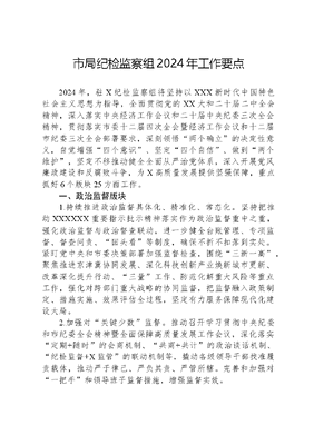 市局纪检监察组2024年工作要点2024年,驻X纪检监察组将坚持以XXX新时代中国特色社会主义思想为指导,全面贯彻党的XX大和二十届二中全会精神,深入落实中央经济工作会议和二十届中央纪委三次全会精神,贯彻落实市委十二届四次全会暨经济工作会议和十二届市纪委三次全会部署要求,深刻领悟两个确立的决定性意义,自觉增强四个意识、坚定四个自信、做到两个维护,坚定不移推动健全全面从严治党体系,深入开展党风廉政建设和反腐败斗争,为X高质量发展提供坚强保障,重点抓好6个版块25方面工作。一、政治监督版块1.持续推进政治监督具体化、精准化、常态化。坚持把推动XXXXXX重要指示批示精神落实作为政治监督重中之重,强化政治监督与政治督查联动,进一步健全台账管理、专项监督、督查问责、回头看等制度,确保不折不扣落到实处。紧盯党中央和市委决策部署加强监督检查,围绕三新一高,聚焦推进京津冀协同发展、深化科技创新产业焕新城市更新、改革深化提升行动、三量工作、防范化解重大风险等重点工作,强化对跨部门重大战略的协同监督,把监督融入政策制定、措施实施、效果评估全过程,坚定有力服务保障现代化建设大局。2.加强对关键少数监督。推动召开学习贯彻中央纪委和市纪委全会精神暨全面保障高质量发展工作会议,深化落实定期+随时的会商机制、共商+共计的政治谈话机制、纪检监督+X监管的联动机制等,撬动各级领导干部找准履责载体,推动严于律己、严负其责、严管所辖。完善和加强对一把手和领导班子监督措施,增强监督实效。3.严明政治纪律和政治规矩。及时发现、着力解决七个有之问题,坚决纠治低级红高级黑。加强选人用人监督,建好用好廉政档案,坚决破除圈子文化、码头文化和好人主义,聚焦政治忠诚、政治安全、政治责任、政治立场、党内政治生活,坚决纠正政治偏差,及时消除政治隐患。4.加强对巡视和审计整改情况监督。压实党委主体责任,推动落实好巡视反馈问题三级递进整改要求,对集中整改事项继续调整补充、巩固深化,对举一反三整改事项和推动改革促进发展整改事项进一步拓展深入、久久为功,在堵塞漏洞、源头治理、推动改革、促进发展上取得实效。持续加大巡视移交、审计移送等问题线索办理力度。5.加强各类专项监督。持续推动对医药领域专项整治,督促将问题整改与建章立制、改革发展有机结合。推动将纪检监察监督、审计监督、X监管统一起来,深化发现问题、反馈提醒、举一反三、专项治理的联动机制。紧盯影响高质量发展的突出问题,选择矛盾问题多、群众反映强烈的领域开展专项整治,严肃纠治背后存在的为政不勤、为政不公、为政不廉等行为。二、政治生态版块6.做好信访举报受理办理。及时处置检举控告,提高初次检举控告的办理质效,严格执行实名检举控告的受理、办理和办结反馈等工作程序,落实四访、领导包案要求,定期做好信访举报统计分析。总结运用重复举报治理工作经验,创新方式方法,形成化解重复举报长效机制。7.加大线索处置核查力度。持实事求是、精准安全原则,规范核查程序,强化核查力度,提高处置终结率和处理结服率,更加有力遏制增量,更加有效清除存量。统筹调配资源力量,及时办理上级专项工作中转办督办问题线索,并按时反馈。8.保持惩治腐败的高压态势。持续发力、纵深推进反腐败工作,坚持把严惩政商勾连腐败作为反腐败斗争重中之重,深入查处金融、国企、能源、医药、基建工程和招投标领域的腐败问题。紧盯党的XX大后新提任领导干部、重点岗位领导干部、年轻领导干部,重点查处不收敛不收手、胆大妄为的腐败分子。运用好大数据资源提升执纪执法效能,坚决惩治影子公司、期权腐败、政商旋转门等新型腐败、隐性腐败问题。坚守执纪办案安全底线。9.健全防治腐败滋生蔓延的体制机制。认真落实持续净化政治生态的意见,加强政治生态分析研判,分类施策推进问题整改。常态化做实查办案件后半篇文章,加强类案分析,规范精准适用提示函、纪检监察建议书进行超前提示,促进更好从个案清除、重点惩治向系统整治、全域治理提升转变。加强廉洁风险隐患动态监测,推动健全制度、执行制度,完善权力配置和运行制约机制,规范自由裁量权,减少设租寻租空间。10.深化清廉建设。推动用中华优秀传统文化、革命文化、社会主义先进文化铸魂育人,大力弘扬忠诚老实、公道正派、实事求是、清正廉洁等价值观。巩固深化十廉行动,用好线上线下各类载体阵地,常态推出独具特色的廉洁套餐。推动把廉洁文化建设融入宣传思想文化工作,利用中心组学习、党校课堂等积极宣传廉洁理念、廉洁典型,营造崇廉拒腐良好风尚。三、作风建设版块11.突出常态长效深化落实中央八项规定精神。在节日节点推动下发廉洁过节通知,编辑廉洁小视频,不断浓厚严的氛围。加强对机关和日常联系单位公车管理、财务报销、收送礼品礼金、违规