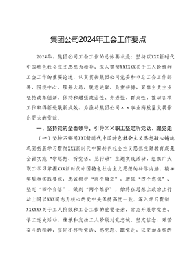 集团公司2024年工会工作要点2024年,集团公司工会工作的总体要求是:坚持以XXX新时代中国特色社会主义思想为指导,深入贯彻XXXXXX关于工人阶级和工会工作的重要论述,认真贯彻集团公司党委和市总工会工作部署,围绕中心、服务大局,锐意进取、负重拼搏,聚焦主责主业坚持改革创新,保持和增强政治性、先进性、群众性,推动各项工作取得新进展新成效,为推动集团公司××事业高质量发展作出更大的贡献。一、坚持党的全面领导,引导××职工坚定听党话、跟党走(一)坚持不懈用XXX新时代中国特色社会主义思想凝心铸魂巩固拓展学习贯彻XXX新时代中国特色社会主义思想主题教育成果全面实施学思想、听党话、见行动主题实践活动,组织广大职工学习掌握XXX新时代中国特色社会主义思想的科学内涵、精神实质和实践要求,忠诚拥护两个确立,增强四个意识、坚定四个自信、做到两个维护,始终在思想上政治上行动上同以XXX同志为核心的党中央保持高度一致。深入学习贯彻XXXXXX关于工人阶级和工会工作的重要论述,常态开展学党史、学工运史活动,继承和发扬工人阶级对党忠诚、坚定信念、艰苦奋斗的精神,坚定不移听党话、感党恩、跟党走,以更加昂扬的精神状态和奋斗姿态为集团公司建设贡献智慧和力量。(二)不断强化职工思想政治引领。坚持用党的创新理论武装职工,弘扬新时代××精神,广泛开展理想信念、社会主义核心价值观、四史、大国工匠、中国梦·劳动美——建功新时代奋进新征程劳模工匠宣讲党的创新理论等系列教育和活动,不断增进广大职工对党的创新理论的政治认同、思想认同、理论认同、情感认同,筑牢团结奋斗的思想基础。(三)加强企业精神文明建设。牢固职工文化阵地建设,精心组织开展篮球赛、羽毛球赛、乒乓球赛、摄影比赛、歌咏比赛企业品牌事故展演等文化体育赛事,积极参与市总工会和行业工会组织的各项文体活动,通过开展丰富多彩、喜闻乐见的职工文体活动,打造健康文明、昂扬向上、全员参与的职工文化,不断满足广大职工精神文化需求。二、聚焦高质量发展首要任务,凝聚职工建功立业、创新创造的合力。(一)充分发挥典型示范引领作用。大力弘扬劳模精神、劳动精神、工匠精神,开展劳模工匠事迹宣讲、劳模工匠助企行等活动,加大劳模宣传力度,发挥劳模示范引领作用。建立完善关心关爱劳模工匠和技能人才的常态化机制,推动落实劳模工匠待遇,提升劳模工匠地位,让劳动光荣、技能宝贵、创造伟大在全集团蔚然成风。(二)深入开展劳动和技能竞赛。贯彻落实《关于开展双才双助行动实施意见》,确保思想引领和服务大局两项重点工作落实落细。突出行业特点,以技术创新为导向,深入开展岗位有我、保障放心主题劳动和技能竞赛,着力提升职工技能素质,加强专业人才队伍建设。积极选拔优秀业务技能代表,参与市总工会和市农林产业工会组织的技能比武大赛,扩大集团公司在产业内影响力和知名度。(三)广泛组织职工创新活动。持续组织职工参加技术革新技术协作、小发明小创造、金点子建议、网上练兵等群众性创新创造活动,推动形成建功新时代、比学赶帮超的新风尚。持续打造职工创新工作室、劳模创新工作室等职工创新引领平台,完善《集团群众性技术创新活动奖励办法(试行)》,引导职工群众立足岗位、深入钻研、敢为人先,持续点燃创新创造激情,助力集团公司奋力实现××发展目标。三、坚持以人为本思想,加大职工关爱帮扶力度(一)精心做好职工关爱慰问工作。持续组织开展冬送温暖夏送清凉活动,落实春节、十一等重大节日走访慰问职工制度,送上组织的关怀,送去节日的祝福,积极建设和谐温暖的企业大家庭。做好对一线岗位员工的关心、关爱,为偏远艰苦地区班组配发生活设施,扩大送温暖活动的覆盖面。(二)重视加强困难职工帮扶工作。健全完善集团公司困难职工帮扶制度,建立重病、因病致贫返贫、工伤职工帮扶台账,靶向施策、精准帮扶,坚持量力而行与尽力而为统一,坚持思想疏导与物质帮扶同步,切实解决困难职工实际生活困难。(三)切实维护好女职工特殊权益。认真落实《妇女权益保障法》等政策法规,持续开展庆祝三八妇女节、女职工特殊关爱行动等系列活动,充分保障女职工特殊权益,促进女职工全面发展。大力开展巾帼建功新时代女职工素质提升工程等活动,积极引导女职工把个人聪明才智用在企业发展、干事创业上来。提高女职工劳动安全健康意识和能力,升级女职工特殊关爱室、组织两癌免费筛查、申请关爱金。参加××区妇联组织沟通协调,积极开展未婚女职工线上、线下交友活动,加强对青年女职工在婚恋方面的关心关爱。四、用心用情做好维权工作,保障维护好职工根本利益(一)加强民主管理制度建设。通过职工代表大会基本形式推动民主管理制度落地落实,召开集团公司二届×次职代会暨工会二届×次会员代表大会,审议《集团公司工作报告》《集团公司工