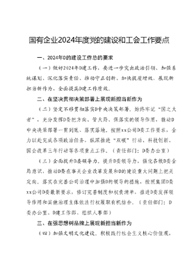 国有企业2024年度党的建设和工会工作要点一、2024年D的建设工作总的要求(一)做好2024年D建工作,要进一步突出政治引领、加强系统谋划、深化落实责任、推动守正创新、加快提质增效,展现新担当新作为,全面提高D建工作质效。二、在坚决贯彻决策部署上展现新担当新作为(二)坚定不移贯彻落实D中央决策部署。始终牢记国之大者,充分发挥D委把方向、管大局、保落实的领导作用,推动D中央决策部署一贯到底、落实落地。按照xx公司D委工作要求,全力以赴完成各项政治任务,纵深推进双碳行动、科技创新、国企改革三年行动等各项重点工作。(责任部门:D委办公室)(三)全面提升D委领导力。提升D委领导力,强化各级D委全局意识,推动D委在事关企业改革发展和D的建设重大问题上把关定向。落实在完善公司治理中加强D的领导的措施,按照集团D委xx公司D委最新要求,修订完善制度和权责清单,推进D委发挥领导作用和其他治理主体依法行权履职有机结合。(责任部门:D委办公室、D建工作部、组织人事部)三、在强思想树品牌上展现新担当新作为(四)加强文明文化建设。积极践行社会主义核心价值观,加强集团企业文化核心理念宣传,推进公司企业文化建设。落实集团思想政治工作会议精神,加强和改进新时代思想政治工作。加强精神文明建设,积极参与评选。推进企业文化基层行,开展主题宣讲、文化展演等一系列宣传推广活动。(责任部门:D建工作部)(五)打造基层D建创新品牌。深入开展基层D建创新工程三年行动,鼓励基层首创精神,选树推广基层D建典型经验,构建D建品牌矩阵,扩大D建品牌效应,形成一支部一特色的生动局面。加强智慧D建平台使用,提升D建数字化管理水平。坚决反对抓D建形式主义,纠正督查检查过多过频、过度留痕,纠治纸上D建墙上D建。大兴调查研究之风,牢固树立D的一切工作到基层的鲜明导向,坚持问题导向,狠抓基层基础,切实帮助基层解决实际问题,推动大D建格局向基层延伸。(责任部门:D建工作部)四、在抓队伍促融合上展现新担当新作为(六)加强组织体系建设。持续优化组织设置,健全车间班组、工程项目基层D组织,在重大工程、重要任务、重点项目中建立D组织。持续夯实基层基础,开展基层组织换届专项督查。落实集团支部与班组融合联创百千计划。建强D建工作队伍,培养推荐D建内训师。(责任部门:D建工作部、组织人事部)(七)全面提升支部战斗力。聚焦生产经营重点、改革发展难点、职工关心热点,着力提升D支部建设和中心任务落实的一体推进力、攻坚克难的组织力、团结群众的凝聚力。大力开展社会主义是干出来的岗位建功行动,评选表彰先进个人和优秀团队。大力推进奋进十四五D员先锋队、D员示范岗建设,开展创建评估。丰富基层D建活动载体,开展双创双融、D员先锋队系列攻坚活动。(责任部门:D建工作部)(八)增强统战工作质效。完善D外人士发挥作用长效机制,创新建言献策方式和载体,助力治企兴企。选树民族团结、D外知识分子先进典型。积极开展D建助力乡村振兴,深化企地支部结对共建,完善日常性帮扶措施。(责任部门:D建工作部、组织人事部)(九)坚持依靠职工办企业。健全我为群众办实事常态化、长效化机制。持续推进绿色发展劳动竞赛和智能建设技能大赛,不断提高竞赛质量。健全工会组织,加强工会建设,在抓基础、建机制、强功能、求实效上下功夫,努力建设六有工会进一步改善一线职工生产生活条件,增强企业向心力凝聚力。大力开展创建工人先锋号和争当工人标兵活动,积极培养先进模范(责任部门:D建工作部、D委办公室)五、在优化政治生态上展现新担当新作为(十)巩固巡视巡察成效。坚持上下联动,做好巡视整改。坚持四个不放松工作要求,落实三个一工作机制,抓紧抓牢未完成巡视反馈问题整改,确保高质量完成一年期各项整改任务。推动巡视整改四个融入,切实把抓好巡视反馈问题整改和深化标本兼治有机结合起来。组织开展巡察整改回头看对对未整改到位的问题再传压,推动解决制约公司发展的系统性深层次问题。(责任部门:纪委办公司室、D委办公室、D建工作部)(十一)毫不松懈治四风、树新风。锲而不舍落实八项规定精神和集团46条措施,坚持治四风、树新风并举,进一步整治形式主义、官僚主义,健全作风建设长效机制。综合运用D内谈话等方式,落实同级监督,聚焦关键少数加强对班子监督,促进班子带头营造风清气正的政治生态,形成鼓励D员干部干事创业的良好氛围。(责任部门:纪委办公室,D委办公室)六、在明责履责考责上展现新担当新作为(十二)强化责任落实。完善D建责任体系,督促D组织书记履行第一责任人职责、专职副书记履行直接责任、纪委书记履行监督责任、其他班子成员履行一岗双责。强化D建工作部门责任落实,形成抓D建整体合力。(责任部门:D建工作部)(十三)严格责任考核。用好考核评价