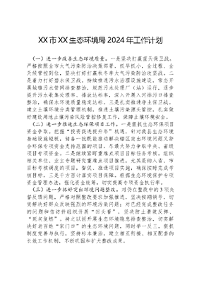 XX市XX生态环境局2024年工作计划(一)进一步改善生态环境质量。一是坚决打赢蓝天保卫战。严格按照全市大气污染防治决策部署,抓早抓小,全过程、全天候管控到位,坚决打好打赢秋冬季大气污染防治攻坚战。二是着力打好碧水保卫战。持续推进污水治理设施建设,常态开展城镇污水管网排查整治,规范污水处理厂(站)运行,逐步提升污水收集处理率、排放达标率,深入开展入河排污口排查整治,确保水环境质量稳定达标。三是扎实推进净土保卫战。建立土壤环境分类管理机制,推进土壤污染源头管控,扎实做好建设用地土壤污染风险管控修复工作,保障土壤环境安全。(二)进一步推进生态环保项目工作。一是狠抓生态环保项目资金争取。把握投资促进提升年机遇,针对我县生态环境基础设施短板,储备一批既能推动解决辖区突出环境问题又符合环保专项资金支持范围的项目,尽最大努力争取中央、省级项目专项资金。二是继续紧盯重难点项目目标任务考核。组织相关单位、业主专题研究重难点项目推进,尤其是纳入省、市目标考核调度的项目,督促、推进项目实施,确保按时完成考核目标。三是千方百计落实项目保障。根据生态环境保护专项资金管理办法,强化资金统筹,切实提高专项资金执行率。(三)进一步抓好突出环境问题整改。对仍在整改中的3项央督反馈问题,严格对照整改要求加强推进,坚决按期销号,切实解决好群众反映强烈的环境污染问题;对已经完成整改任务的问题和信访件组织开展回头看,坚决防止滑坡反弹、死灰复燃。持之以恒开展生态环境隐患排查整治,切实解决好老百姓家门口的生态环境问题,同时举一反三,狠抓制度完善与执行,坚持标本兼治,建立相互衔接、相互配套的长效工作机制,不断巩固和扩大整改成果。(四)进一步提升环境执法监管效能。贯彻落实省、市生态环境执法工作要点,加强排污许可证后监督管理,严厉打击生态环境违法行为,针对各类污染源开展双随机日常执法,针对各类突出问题开展专项执法,在不断加大对环境违法行为打击力度的同时,提高人员业务水平,落实正面清单管理,开展差异化、说理式柔性执法,全面提高生态环境执法效能。加强环境信访管理和环境矛盾纠纷化解,梳理解决群众重复反映的生态环境问题,严格执法,全力维护群众合法环境权益。持续做好全市医疗废物废水环境监管,确保医疗废物废水100%安全处置,坚决守好环境安全底线。