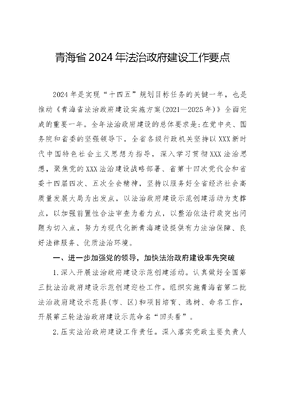 青海省2024年法治政府建设工作要点2024年是实现十四五规划目标任务的关键一年,也是推动《青海省法治政府建设实施方案(2021—2025年)》全面完成的重要一年。全年法治政府建设的总体要求是:在党中央、国务院和省委的坚强领导下,全省各级行政机关坚持以XXX新时代中国特色社会主义思想为指导,深入学习贯彻XXX法治思想,聚焦党的XXX法治建设战略部署、省第十四次党代会和省委十四届四次、五次全会精神,坚持以服务好全省经济社会高质量发展大局为出发点,以法治政府建设示范创建活动为支撑点,以加强前置性合法审查为着力点,以整治依法行政突出问题为切入点,努力为现代化新青海建设提供有力法治保障、良好法律服务、优质法治环境。一、进一步加强党的领导,加快法治政府建设率先突破1.深入开展法治政府建设示范创建活动。认真做好全国第三批法治政府建设示范创建迎检工作。组织实施青海省第二批法治政府建设示范县(市、区)和项目培育、选树、命名工作,开展第三轮法治政府建设示范命名回头看。2.压实法治政府建设工作责任。深入落实党政主要负责人履行法治建设第一责任人职责,制定法治政府建设重点任务完成情况对照检查清单,扎实开展法治政府建设督察,推广专题述法+书记点评模式,层层压实工作责任,确保法治政府建设实现率先突破。3.加强依法行政意识和能力。推进领导干部深入学习应知应会党内法规和国家法律。落实领导班子定期学法制度,每年至少举办2次以上法治专题讲座。国家工作人员学法用法考试不少于5次,行政执法人员集中培训不少于1次。二、完善政府治理体系,推动政府行为全面纳入法治轨道4.及时调整完善权责清单。结合新一轮机构改革,全面加强行政许可事项清单管理,及时优化政府部门权责清单,严格执行市场准入负面清单,完善职责明确、依法行政的政府治理体系。5.全面加强行政合法性审查工作。抓好行政规范性文件、重大行政决策、重大行政执法决定、行政协议等事项合法性审查,确保政府行为沿着法治轨道运行,持续提升行政机关依法行政成效,保障公民、法人的合法权益。6.持续优化法治化营商环境。推动有为政府和有效市场紧密结合,全面落实公平竞争审查制度。聚焦与市场主体和群众生产生活密切相关的高频事项,进一步提高政务服务办理时文可居文库——海量学习资料,手机电脑均可下载www.wenkeju.com效。强化公共政策兑现和履约践诺工作,对违法强拆、招商引资失约违约等问题进行集中整治,维护市场主体正当权益和良好市场秩序,提升政府公信力。7.强化民营经济发展法治保障。优化涉民营企业法律服务,培育壮大市场经营主体。依法加大对行政诉讼中涉及的程序意识不强、重复检查等行政违法行为监督力度,保障民营企业财产权和经营权。严格落实知识产权侵权惩罚性赔偿、行为保全等制度,建立完善侵权和行政非诉执行快速处理机制。三、顺应高质量发展要求,健全依法行政工作制度体系8.突出特色推动行政立法提质增效。认真编制和组织实施省政府2024年立法工作计划,加强与省人大的立法协调沟通,积极推进生态环境保护、新兴产业发展、民生保障、平安青海建设等领域立法,持续增进民生福祉。9.指导市州加强立法工作。加强对下立法业务指导,推动设区的市、自治州健全立法工作机制,注重通过小切口立法填补本地区制度空白。充分发挥基层立法联系点作用,拓宽公众参与政府立法工作渠道。10.进一步加强行政规范性文件监管。开展地方性法规和政府规章、行政规范性文件专项清理。升级改造行政规范性文件监督管理系统,实现全省行政规范性文件监管工作信息化。文可居文库——海量学习资料,手机电脑均可下载www.wenkeju.com四、严格落实工作制度,提高重大行政决策公信力执行力11.强化行政决策程序规定实施。严格执行《青海省人民政府重大行政决策程序暂行规定》,研究制定青海省重大行政决策事项目录管理办法,县级以上政府及其组成部门要制定年度重大行政决策事项目录并向社会公开。健全政府法律顾问实质性参与决策制度,列席政府有关会议,提高行政决策的科学性合法性有效性。12.全面推行重大行政决策风险评估。对涉及生态环境保护、自然资源、教育培训、食品安全、公共卫生、劳动保障、城市管理、金融服务、网络安全、民族团结进步等领域重大事项,实行决策风险评估全覆盖。引入行业专家、法律顾问参与风险评估。五、聚焦整治突出问题,全面提升行政执法工作质量13.持续深化行政执法体制改革。压实各级政府部门的行政执法主体责任,能由机关执法的不另设行政执法队伍。实行以县(市、区)为主的行政执法体制,鼓励对现有执法队伍进行更大范围整合。推动县级综合行政执法队伍向乡镇(街道)延伸,采取派驻等方式实现力量向一线下沉。14.推进行政执法规范化建设。严格落实我省贯彻落实《提升行政执法质量三年行动计划(2023—2025年
