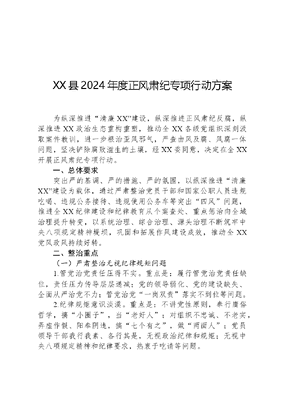 XX县2024年度正风肃纪专项行动方案为纵深推进清廉XX建设,纵深推进正风肃纪反腐,纵深推进XX政治生态重构重塑,推动全XX各级党组织深刻汲取案件教训,进一步根治歪风邪气,严查由风及腐、风腐一体问题,坚决铲除腐败滋生的土壤,经XX委同意,决定在全XX开展正风肃纪专项行动。一、总体要求突出严的基调、严的措施、严的氛围,以纵深推进清廉XX建设为载体,通过严肃整治党员干部和国家公职人员违规吃喝、违规公务接待、违规使用公务车等突出四风问题,推进全XX纪律建设和纪律教育从个案查处、重点惩治向全域治理提升转变,以系统治理、综合治理、源头治理不断筑牢中央八项规定精神堤坝,巩固和拓展作风建设成效,推动全XX党风政风持续好转。二、整治重点(一)严肃整治无视纪律规矩问题1.管党治党责任压得不实。重点是:履行管党治党责任缺位,责任压力传导层层递减;党的领导弱化、党的建设缺失、全面从严治党不力;管党治党一岗双责落实不到位等问题。2.纪律规矩意识淡漠。重点是:不讲党性原则,奉行庸俗哲学,搞小圈子,当老好人;对组织不忠诚、不老实,弄虚作假、阳奉阴违,搞七个有之,做两面人;党员领导干部我行我素、各行其是,无视政治纪律和规矩;无视中央八项规定精神和纪律要求,热衷于吃请等问题。3.工作作风不实。重点是:不遵守工作纪律和工作制度,不履行请示报告制度,该请示的不请示、该报告的不报告,个人主义、自由主义严重等问题。(二)严肃整治违规吃喝问题1.领导干部之间违规相互吃请,搞小圈子、相互请托办事等问题。重点是:组织、参加以老乡会、同学会、战友会、球友会、牌友会等以拉关系、请托办事、相互牟利为目的,带有小圈子性质的相互吃请;组织、参加以婚丧喜庆、生日祝寿、乔迁升学等为由,超出亲属范围,带有小圈子性质的相互吃请。2.违规公款吃喝问题。重点是:公务接待中,一函多餐,伪造接待公函、虚列接待事项、虚增接待人数等方式公款吃喝;变相安排公务接待;公款报销或者支付应当由个人负担的吃喝费用;无实质性公务行为使用公款吃喝行为。3.隐形变异违规吃喝问题。重点是:以各种名义违规接受管理服务对象(包含学生及学生家长,以下简称管理服务对象)的宴请;虚列办公费、会议费、差旅费、印刷费等名目隐匿违规吃喝费用;化整为零,拆分开具用餐发票报账;向下级单位及其他单位、企业、个人转嫁违规吃喝费用;指使、授意管理服务对象安排违规吃喝活动;出入私人会所或在私人会所性质的场所吃请。4.国家公职人员工作日期间违规饮酒问题。(三)严肃整治违规公务接待问题1.超标准、超范围接待。重点是:公务接待中,无公函接待;或者没有严格控制陪餐人数;或者安排与接待任务无关的其他人员参与陪餐。2.借公务接待之机大吃大喝。重点是:超过接待的标准或范围,安排消费高档食材和上酒水;公务接待中使用私人会所、高消费餐饮场所等。3.其他违反公务接待管理规定的行为。重点是:在公务接文可居文库——海量学习资料,手机电脑均可下载www.wenkeju.com待中,违反《党政机关国内公务接待管理规定》行为等。(四)严肃整治违规使用公务车问题1.公务用车制度不健全。重点是:没有建立健全公务用车使用管理制度;公务出行没有做到严格审批和加强公务用车监督,降低运行成本。2.公务车管理不严。重点是:没有严格执行公务用车使用时间、事由、地点、里程、油耗、费用等信息登记和公示制度;公车私用;公油私加等。三、工作部署专项行动从2024年3月开始至2024年12月底,在全XX各级党组织中开展,重点是各级领导班子和党员领导干部。(一)召开一次警示教育。XX纪委监委将以案件为镜鉴,拍摄警示教育片,作为全XX各级各部门开展警示教育的重要教材。全XX各级党组织要在2024年4月底以前,召开一次警示教育大会或支部党员大会,组织全XX党员干部和公职人员以党支部为单位深入学习研讨,通过观看警示教育片、开展案件剖析、党员干部交流发言、一把手讲廉政党课等系列活动,教育引导广大党员干部以案为鉴、对镜反思,提高党性觉悟,增强拒腐防变能力,形成崇清尚廉的思想氛围,切实守住清正廉洁为政之本。(二)组织一次全员学习。全XX各级党组织切实担负起纪律建设的主体责任,以中心组学习、三会一课、主题党日等形式,年内组织党员干部认真学习党章党规党纪不少于2次。要结合清廉XX强基行动,常态化组织深入学习XXXXXX关于加强作风建设重要论述和重要批示指示精神,深入学习新修订的纪律处分条例,深入学习相关法律法规、党纪条规,进一步深化党员干部对党章党规党纪的认识,厘清言行举止界限,增强纪律规矩意识,切实做到知敬畏、存戒惧、守底线。(三)开展一次专项督查