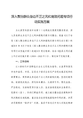 深入整治群众身边不正之风和腐败问题专项行动实施方案为认真贯彻落实中央第十二巡视组反馈意见整改要求,深入开展群众身边不正之风和腐败问题专项整治,根据《关于印发〈深入整治群众身边不正之风和腐败问题专项行动方案〉的通知》和《关于印发〈深入整治群众身边不正之风和腐败问题专项行动实施方案〉的通知》有关精神,结合《基层正风反腐三年行动实施方案(2018—2022年)》,制定如下实施方案。一、工作目标以A新时代中国特色社会主义思想为指导,认真贯彻落实中央和省委、市委、区委关于推动全面从严治党向基层延伸的部署要求,聚焦群众身边的不正之风和腐败问题,坚持问题导向、铁面执纪执法、深化标本兼治,从教育引导、强化监督、严厉惩处、完善制度等方面入手,压实各级党组织主体责任,发挥村(居)、各部门职能作用,建立健全整治基层腐败和作风问题的长效机制,重点惩治扶贫领域腐败和作风问题、涉黑涉恶腐败和保护伞问题、基层干部违反中央八项规定精神问题、农村集体三资领域腐败和作风问题、行政执法领域为官不为问题、公共服务行业吃拿卡要问题、村(居)两委换届中的拉票贿选问题和其他损害群众利益的突出问题等8个方面问题。通过三年(2018年-2022年)不懈努力,实现基层腐败和作风问题得到全面遏制,各项惠民政策落到实处,不断提升人民群众的获得感和幸福感,为开创改革发展新局面,在全区率先全面建成小康社会营造风清气正的政治生态。二、整治措施(一)加强思想教育1.加强作风纪律教育。认真组织学习党的十九大精神和党章党规党纪、宪法法律,重点学习新修订的党章和新颁布实施的国家监察法,增强法纪观念,做到心有所畏、言有所戒、行有所止。深入开展警示教育,坚持用身边事教育身边人,利用查处的基层干部违纪违法典型案例,采取通报曝光等方式,引导广大党员干部认清腐败的危害和代价,增强教育效果。〔责任单位:党政办、镇纪委、各村(居)支委及两新组织〕文可居文库——海量学习资料,手机电脑均可下载www.wenkeju.com2.净化基层政治生态。各村(居)两委、两新党组织及镇属部门要深入分析专项整治工作中发现的本地本部门责任落实、监督管理、制度执行、作风建设等方面的突出问题,及时整改落实。基层党组织和党员干部要积极参加党的主题教育活动,筑牢拒腐防变的防线。在省定贫困村党组织中开展脱贫攻坚作风建设年活动,坚持以党支部为单位开展纪律教育学习月活动,促进农村干部群众戒奢拒侈、移风易俗。〔责任单位:镇党委、镇纪委、组织办、宣传办、各村(居)支委及农办(扶贫办)〕(二)整饬基层作风3.定期约谈村(居)两委干部和村民小组长。坚持问题导向,针对村(居)两委干部和村民小组长中出现的苗头性、倾向性问题,由镇党委或纪委对其进行谈话提醒教育,帮助村(居)两委干部和村民小组长及时认清问题、纠正错误,避免小问题演变成大错误。〔责任单位:各村(居)支委及两新组织〕4.开展作风问题明察暗访。通过专题暗访、入户核查、交文可居文库——海量学习资料,手机电脑均可下载www.wenkeju.com叉复核、随机抽查等方式,不定期对各单位工作人员遵守工作纪律、服务态度、工作效能等情况进行明察暗访,着力发现和解决庸懒散松、不作为、乱作为、慢作为等问题。(责任单位:组织办、党政办、镇纪委)5.加强对落实中央八项规定及实施细则精神的监督检查。紧盯享乐主义和奢靡之风新动向,坚决查处基层三公消费、人情往来、津补贴发放等领域的顶风违纪行为。整治基层形式主义和官僚主义,坚决纠正贯彻落实中央和省市区重大决策部署表态多调门高、行动少落实差,庸懒无为、冷硬横推,脱离群众、耍特权等问题。〔责任单位:镇纪委、党政办、组织办、财政所、各村(居)支委〕6.开展扶贫驻镇驻村干部作风问题专项检查。由组织办、纪委、农办(扶贫办)等单位联合开展扶贫驻镇驻村干部作风问题专项检查,把帮扶成效和群众满意度作为衡量驻镇驻村干部工作成效的标准,把村民评议、村两委干部评议作为驻镇驻村干部综合评价、评先评优、提拔使用的重要依据。〔责任单位:组织办、镇纪委、农办(扶贫办)〕文可居文库——海量学习资料,手机电脑均可下载www.wenkeju.com7.开展全域农村人居环境整治专项检查。重点围绕三清三拆进度、发动群众效果、村庄规划质量、资金使用进度、集体资产管理等5个方面开展全域农村人居环境整治专项检查。对检查过程中发现的问题要求立即整改,对发现的涉嫌违纪违法问题线索及时移送纪检监察机关查处。〔责任单位:农办(扶贫办)、财政所、城建办〕8.落实容错免责制度。严格按照容错免责条件和办理程序,认真处理基层党员干部在工作中出现的问题,旗帜鲜明地保护作风正派、敢做敢为、锐意进取的干部,大力营造干事创业良好氛围。(责任单位:镇纪委、镇