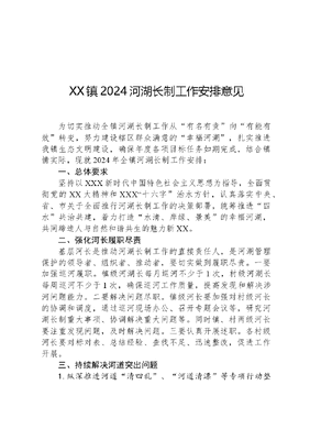 XX镇2024河湖长制工作安排意见为切实推动全镇河湖长制工作从有名有责向有能有效转变,努力建设辖区群众满意的幸福河湖,扎实推进我镇生态文明建设,确保年度各项目标任务如期完成,结合镇情实际,现就2024年全镇河湖长制工作安排:一、总体要求坚持以XXX新时代中国特色社会主义思想为指导,全面贯彻党的XX大精神和XXX十六字治水方针,认真落实中央、省、市关于全面推行河湖长制工作的决策部署,统筹推进四水共治共建,着力打造水清、岸绿、景美的幸福河湖,共同缔造人与自然和谐共生的魅力新XX。二、强化河长履职尽责基层河长是推动河湖长制工作的直接责任人,是河湖管理保护的领导者、组织者、推动者,要切实做到履职尽责。一要加强巡河履职。镇级河湖长每月巡河不少于1次,村级河湖长每周巡河不少于1次,确保巡河工作质量,提高发现和解决涉河问题能力。二要解决问题尽职。镇级河长要加强对村级河长的协调和调度,通过巡河现场办公、召开专题会议等,研究河湖长制重大事项、协调解决重大问题等。同时镇、村两级河长要注重发现问题,及时解决问题。三要认真开展述职。各村级河长要对标对表、总结经验、查找不足、迅速整改,促进工作开展。三、持续解决河道突出问题1.纵深推进河道清四乱、河道清漂等专项行动整治常态化规范化。一是要全方位排查问题。要加大河湖问题排查力度,利用日常巡查、现场抽查、随机排查、实地督查等方法,拉网式、地毯式排查河道问题,确保问题排查全方位、无死角。常态化开展河湖问题清四乱、河湖清漂等专项行动。对非法侵占水域,种植阻碍行洪的林木及高秆作物等乱占问题;乱采问题;乱扔乱堆垃圾、堆放阻碍行洪的物体等乱堆问题;河道管理范围内修建阻碍行洪的建构筑物(如临时厕所、猪圈、鸡舍、鸭棚等)等乱建问题;破坏水生态行为采取零容忍。同时要加强对河湖水面漂浮物及沿岸生产生活垃圾的清理整治工作,全面清除河道白色垃圾及河面漂浮物(如死家禽、树枝、生活、建筑垃圾等);全面清除河道、排水沟道内的阻水设施;全面清除河湖坡岸上乱扔乱弃的杂物、乱垦乱种的庄稼。二是要常态化整改问题。镇内河道清四乱、河湖清漂等专项整治工作常态化,镇、村河长要形成合力,由集中整治向常态化规范化转变,建立长效机制转变。以河道及其两岸环境整治为重点,两河市区监管部门持续开展河道定期巡查执法。三是要动态化清零问题。要坚持问题排查日常化、问题整改常态化,建立问题台账,做到迅速整改,坚决遏增量、清存量,对相关责任人员要及时进行问题交办、跟踪督办,按时销号,动态清零,确保问题整改到位、不反弹。2.继续实施辖区两河六沟流域网格化及监管机制。2024年XX镇将继续实施辖区两河六沟流域网格化及监管机制。对颉河、小芦河两条干流及闫沟、丁家沟、东沟、火龙沟、刘家山沟、普陀沟6条沟道,进一步建全完善辖区两河六沟网格化管理体系,构建责任明确、协调有序、监管严格、保护有力的河道管理保护机制,为建设美丽XX提供坚实保障。四、工作要求(一)切实提高政治站位。全面推行河湖长制是贯彻落实XXX生态文明思想的重要工文可居文库——海量学习资料,手机电脑均可下载www.wenkeju.com作,镇河长制办公室要做好组织、协调、分办、督办工作,落实河长确定的事项,负责专项行动的实施;加强公安、水利、国土、农业等相关监管部门的配合,强化责任担当,共同推进,要敢于负责、勇于碰硬,针对问题短板要以钉钉子的精神,抓铁留痕、踏石留印的作风,进一步推深做实河湖长制工作,切实把河湖长制工作抓实抓细抓出成效。(二)强化督查考核。要加强对河湖长制工作任务的督导检查。一是明察暗访发现问题,要定期不定期开展明察暗访,确保深入实地、到达一线发现问题。二是清单交办整改问题。对发现的问题实行进行整改交办,确保整改一处销号一处。三是举一反三不出问题。对已完成整改销号的问题,要加强督查检查回头看,确保问题不反弹。镇河湖长制办公室也将组织人员不定期、不定时对河道进行抽查,并通报检查结果。(三)加强宣传和社会监督。要充分利用多种宣传手段,深入宣传实施河湖长制的重大意义,普及河湖保护知识,增强群众保护水环境的意识,并通过魅力XX公众号向社会公告河湖长名单,在河湖岸边显著位置增设河湖长公示牌,明确河湖长职责、河湖概况、管护目标、监督电话等内容,接受社会监督,进一步做好宣传舆论引导、河湖保护科普教育,提高辖区群众对河湖保护工作的责任意识和参与意识,使人民群众真正了解并参与支持河道整治工作,逐步形成全社会共同关心河道环境整治、建设生态文明的良好氛围,变政府治水为全民治水,形成全社会共建共治共享的水生态保护新格局。文可居文库——海量学习资料,手机电脑均可下载www.wenkeju.com