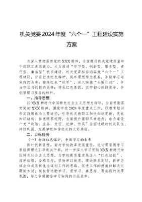 机关党委2024年度六个一工程建设实施方案为深入贯彻落实党的XXX精神,全面提升机关党建质量和干部职工素质能力,大力推进学习型、创新型、服务型、责任型、廉洁型机关建设,机关党委拟启动实施六个一工程建设,旨在打造红色熔炉,筑牢理想信念根基,争做学习与实践的表率;锤炼红色铁军,深入实施头雁行动,争当守正与创新的先锋;传承红色基因,坚守初心担纲使命,争创管理与服务的标杆。一、指导思想以XXX新时代中国特色社会主义思想为指导,全面贯彻落实党的XXX精神,围绕学校2024年度重点工作,以教育培训和实践锻炼为主要途径,引导机关教职工加快知识更新、优化知识结构、拓宽眼界视野,全面提升履职尽责能力,着力建设一支政治、业务、责任、纪律、作风全面过硬的机关队伍,持续巩固、发展学校和谐稳定的大好局面。二、目标任务(一)打造红色熔炉,争做学习的表率新时代新征程,面对学校改革发展重任,迫切需要用学习型组织理论引导机关干部,进一步深入学习贯彻XXX新时代中国特色社会主义思想,为学校高质量发展注入红色动能,深学细悟,奋楫笃行,坚持学以致用,理论联系实际,将学习体会和成果转化为谋划工作的思路、促进工作的措施和解决问题的本领,积极营造勤学习、爱学习、善思考、勇实践的浓厚氛围,努力争做勤奋学习实践的示范表率。(二)锤炼红色铁军,争当改革的先锋围绕建设现代化医科大学目标,锻造红色铁军,始终坚持高的政治站位、好的思想品德、精的业务能力、优的工作作风和严的工作纪律,大兴调查研究之风,干字当头,敢字为先,冲破思想束缚,放开手脚、大胆尝试,着力解决学校改革中面临的难点、堵点问题和急难愁盼问题,在改革浪潮中,敢闯敢拼、敢抓敢管、竭尽全力克服一切艰难险阻,争当积极进取、守正创新、敢于担当、善于作为的改革先锋。(三)传承红色基因,争创管理的标杆管理是服务的手段,服务是管理的目的,在服务中实施管理,牢固树立为学校中心工作服务、为全体师生服务的理念,激发红色基因,积极投身到更名大学、全面深化改革、教学科研管理、后勤服务保障等学校各项事业中;树立科学管理和人文管理的理念,充分利用现代化信息技术,采取科学化、人性化的管理模式,将科学管理和人文管理有机融合、协调发展,全力把机关创建成让党委放心、让师生满意的模范标杆。三、具体措施(一)构建一个学习阵地建立机关政治理论学习小组,由机关党委委员、各支部支委组成,切实发挥机关党委委员、党支部委员领头雁作用,带动全体机关职工针对党建热点、重点、难点问题深入学习、分类研究,先行先试,不断推动学习成果转化,不断提高机关职工的综合素养和履职能力。(二)组织一次实践教学适时组织机关党员到红色场馆开展现场实践教学,开展机关职工能力素质提升讲座培训和积极向上的文体活动,自觉加强思想淬炼、赓续红色血脉、强化使命担当,将所思所学所悟所得转化为推动工作的前进力量。(三)打造一支坚强队伍文可居文库——海量学习资料,手机电脑均可下载www.wenkeju.com全面推进省级和校级样板党支部创建工作,年终根据创建情况评选出优秀(先进或者五星)党支部,推进支部建设标准化、规范化、制度化,推动党员干部示范引领、担当作为,进一步形成传帮带的良好局面。(四)开展一次改革体验勇作改革的先锋,大力宣传并推行机关事务首问负责制、一次性告知制、限时结办制等系列改革新举措,并深入基层开展一次改革亲身体验,以身临其境的方式,主动下沉,严格履行岗位职责,为师生提供更加便捷、高效、舒心的办事环境。(五)设立一个监督平台强化规范化管理,定期开展机关作风专题调研,听取师生对机关作风的意见建议,开设机关作风监督平台,努力营造爱岗敬业、担当实干、风清气正、廉洁自律的机关政治生态。(六)制定一份暖心清单充分发挥机关党委的向心力和凝聚力,履行机关工会的维护职能,聚焦机关干部职工实际需求,带领各个支部落实精准帮扶,形成暖心工程帮扶清单,及时将组织的温暖送到职工的心坎上。四、方法步骤六个一工程建设工作按照集中攻坚、深化推广、分步实施要求,精准施策,有序推进。共分三步走:第一步,准备阶段(2024年4月至5月)。机关各党支部立足自身业务特点,结合具体措施,实事求是制订实施方案,不断创新工作方式方法,作好实施前准备。第二步,集中攻坚阶段(2024年6月至10月)。结合校、省级样板党支部创建、清廉机关建设等工作,机关各党支部有步骤、有计划地抓好各项任务落实,确保取得实效。第三步,深化总结阶段(2024年11月至12月)。机关各党支部在12月中下旬对巩固提升行动开展自查验收,查漏补缺,进一步夯实工作实效。同时,做好总结经验、巩固成果等工作,文可居文库——海量学习资料,手机电脑均可下载www.wenkeju.com力争探索形