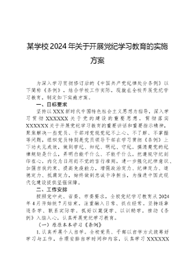 某学校2024年关于开展党纪学习教育的实施方案为深入学习贯彻修订后的《中国共产党纪律处分条例》以下简称《条例》,结合学校工作实际,现就在全校开展党纪学习教育,制定如下实施方案。一、目标要求坚持以XXX新时代中国特色社会主义思想为指导,深入学习贯彻XXXXXX关于党的建设的重要思想,贯彻落实XXXXXX关于开展党纪学习教育的重要讲话和重要指示精神,聚焦解决一些党员、干部对党规党纪不上心、不了解、不掌握等问题,组织党员特别是党员领导干部在学习贯彻《条例》上下功夫见成效,做到学纪、知纪、明纪、守纪,搞清楚党的纪律规矩是什么,弄明白能干什么、不能干什么,把遵规守纪刻印在心,内化为日用而不觉的言行准则,进一步强化纪律意识、加强自我约束、提高免疫能力,增强政治定力、纪律定力、道德定力、抵腐定力,始终做到忠诚干净担当,为推进中国式现代化建设提供坚强保障。二、工作安排按照党中央、省委、市委要求,全校党纪学习教育从2024年4月开始统7月结束,注重融入日常、抓在经常。坚持逐章逐条学、联系实际学,抓好以案促学、以训助学,推动《条例》入脑入心,认真开展党纪学习教育。(一)原原本本学习《条例》1.认真开展个人自学。全校党员、干部以自学方式统筹好学习与工作,合理安排自学时间和内容,认真学习XXXXXX关于开展党纪学习教育的重要讲话和重要指示精神,逐章逐条、原原本本学习《条例》原文,跟进学习中央媒体学习解读文章,全面准确掌握其主旨要义和规定要求。统筹做好XXXXXX关于党的建设的重要思想、关于党的自我革命的重要思想的学习领会,跟进学习XXXXXX关于加强党的纪律建设的重要论述。进一步明确日常言行的衡量标尺,把遵规守纪刻印在心。注重联系实际学,对照《条例》深入反思,查找本职工作和自身存在的薄弱点和风险点,做到警醒、知止,自觉用党规党纪校正思想和行动,使学习党纪的过程成为增强纪律意识、提高党性修养的过程。2.办好读书班。党纪学习教育启动后,党委班子以学习《条例》为主要内容,举办读书班,采取专题辅导、个人自学和集体研讨相结合的方式,组织领导班子成员认认真真读,逐段逐句悟,认真开展研讨交流,时间不少于2天。3.开展理论学习中心组专题研讨。学校党委理论学习中心组要围绕学习贯彻《条例》,紧扣党的政治纪律、组织纪律、廉洁纪律、群众纪律、工作纪律、生活纪律,列出专题,在党纪学习教育期间至少开展2次专题学习研讨。专题研讨要联系思想、结合工作,交流学习体会,提升学习质效。4.抓好党支部学习。党支部三会一课、主题党日以学习《条例》为主题,通过专题辅导、交流研讨、视频教学、案例教学等方式,组织全体党员认真学习;对流动党员、年老体弱党员的学习要用好学习强国、中国干部网络学院等平台。通过视频讲座、情景课堂、推送学习资料等方式开展在线学习。党委班子成员要以普通党员身份,积极参加所在党支部学习。5.讲好纪律党课。党支部书记在认真学习《条例》的基础上,结合学习体会和工作实际讲1次纪律党课,增强党课的针对性和实效性,为党员、干部领学导学。党委班子成员结合党支部联系点工作,到所联系党支部围绕学习贯彻《条例》开展1次学习辅导。文可居文库——海量学习资料,手机电脑均可下载www.wenkeju.com(二)开展警示教育1.召开警示教育会。召开全校警示教育会,用好*、*、*等案件以及省纪委省监委、市纪委市监委查处的教育系统典型案件,开展以案说德、以案说纪、以案说法、以案说责,教育引导全校党员干部警钟长鸣、引以为戒。2.深化各级党组织警示教育。组织结合实际,挖掘警示教育资源,用好《持续发力纵深推进》《贪欲之害》等警示教育片,《*省严重违纪违法省管干部忏悔书》《*省查处违纪违法省管干部案件警示录》《*省年轻干部严重违纪违法案件警示录》《镜鉴——*市严重违纪违法典型案例警示教育读本》等,协调警示教育基地等开展警示教育,深刻剖析违纪违法典型案例,注重用身边事教育身边人。突出抓好对权力集中、资金密集、资源富集领域和关键岗位党员、干部的警示教育,引导党员、干部举一反三、引以为戒,切实做到知敬畏、存戒惧、守底线。3.强化以案促改促治。用好违纪典型案件查办成果,做深做实以案促改、以案促治,着力发现解决案件背后体制机制问题,针对症结和根源靶向施治、综合施策,推动从个案清除、重点惩治向系统整治、全域治理提升,持续净化学校政治生态。(三)加强解读培训1.跟进学习《条例》解读文章。充分利用学校微信公众号,及时转载对《条例》的权威学习解读文章、视频,组织党员、干部依托共产党员网、中国干部网络学院等平台,认真学习相关解读文章、视频,深化学习理解运用。2.抓好纪律培训。根据上级安排,组织学校党委班子参加市委党校(行政学院)党纪学习教育培训,自觉对照《条例》各项规定,检视学校在纪律教育、从严执纪方面存在的不足,检