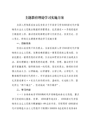 主题教育理论学习实施方案为深入贯彻落实自治区党委关于开展学习贯彻XXX新时代中国特色社会主义思想主题教育部署要求,扎实推进××各级党组织主题教育工作,推动党的创新理论学习往深里走、往实里走、往心里走,特制定主题教育理论学习实施方案一、目标任务坚持以县处级干部为重点,全面系统深入学习XXX新时代中国特绝社会主义思想,完整准确掌握这一重要思想的主要内容,全面把握这一重要思想的世界观、方法论和贯穿其中的立场观点方法,深刻理解这一重要思想的道理、学理、哲理,推动党员干部真学真懂真用,始终保持统一的思想、坚定的意志、协调的行动强大的战斗力,以学铸魂、以学增智、以学正风、以学促干。完整准确贯彻新时代党的×,牢牢扭住社会稳定和长治久安总目标扎实推进事关××长治久安的根本性、基础性、长远性工作,坚定捍卫两个确立、坚决做到两个维护。二、学习内容(一)全面系统学习XXX新时代中国特色社会主义思想。重点学习党的XX大报告、党章、《XXX著作选读》、《XXX新时代中国特色社会主义思想专题摘编》4种必读书目,学好用好《XXX新时代中国特色社会主义思想学习纲要》XXXXXX《论党的自我革命》《XXX新时代中国特色社会主义思想的世界观和方法论专题摘编》《XXX关于调查研究论述摘编》,学习《XXX谈治国理政》(第一二、三、四卷)等读本,以及XXX经济思想、法治思想、生态文明思想、外交思想、强军思想等学习纲要,全面领会XXX新时代中国特色社会主义思想的科学体系、精髓要义、实践要求,做到整体把握、融会贯通。(二)联系实际学习新时代党的治×方略。重点学习XXXXXX关于××工作的重要讲话和重要指示批示精神,学习XXXXXX关于××维护稳定、民族宗教、意识形态、涉外斗争、高质量发展等方面的重要论述,学习第二次、第三次重要××工作座谈会精神结合自治区党委十届三次、五次、六次、七次全会精神,深刻领悟领会全面准确把握新时代党的治×方略,做到知其言更知其义知其然更知其所以然。(三)立足岗位学习XXXXXX重要论述。坚持干什么学什么、缺什么补什么的原则,注重学习XXXXXX关于××工作的重要论述进一步深刻理解和把握本职工作做什么、怎么做等理论和实践问题,把XXXXXX的重要论述转化为抓工作的具体思路和行动纲领,切实提高运用党的创新理论分析解决问题、推动事业发展的能力水平。(四)持续跟进学习XXXXXX最新重要讲话和重要指示批示精神。重点学习XXXXXX在学习贯彻XXX新时代中国特色社会主义思想主题教育工作会议上的重要讲话精神、XXXXXX在中共中央政治局第四次集体学习时的重要讲话精神,跟进学习XXXXXX最新重要讲话重要文章、重要指示批示、重要贺信回信精神,常学常新、常思常悟。三、学习安排把理论学习贯穿主题教育全过程,全面系统深入学习XXX新时代中国特色社会主义思想,大力弘扬马克思主义学风,坚持全面系统及时跟进,坚持多思多想、学深悟透。坚持联系实际、立足岗位,把学习成效体现到提高理论素养、坚定理想信念、升华觉悟境界、增强能力本领上,夯实坚定拥护两个确立、坚决做到两个维护的思想根基。(一)加强领导班子学习。注重发挥各级领导班子带头示范作用以上率下、层层带动,持续在学懂弄通做实上下功夫,推动学习走深走实。X月底前,举办不少于一周的读书班,采取集体自学、交流研讨、个人自学相结合的方式开展学习。组织领导干部静下心、坐下来、钻进去集中学习,读原著、学原文、悟原理,确保人员、时间、内容、效果四落实。按照有计划、有主题有研讨的要求,在年度理论学习中心组既定计划基础上,围绕主题教育部署安排,列出若干专题,每月至少再开展1次理论学习中心组学习,做到学深悟透、笃信笃行。X月底前,党员领导干部在深入学习理论、调查研究基础上,结合个人学习体会和岗位工作实际,到分管领域、部门等基层单位或组织关系所在的党支部,至少讲1次学习贯彻XXX新时代中国特色社会主义思想专题党课。县处级以上领导干部要发挥表率作用,原原本本、逐字逐句学习中央规定的4种必读学习材料采取灵活形式学习4种选读材料,带头交流研讨、反思不足。(二)抓实基层党组织学习。基层党组织要认真制定学习计划,强化日常学习和集中学习,组织基层党员重点学习党的XX大报告、党章和《XXX新时代中国特色社会主义思想专题摘编》。基层党支部每周安排半天,结合三会一课、党旗映天山主题党日、五个好标准化规范化党支部创建,通过交流研讨、宣讲阐释、案例教学、线上培训等方式,组织党员集中学习,谈认识、讲收获、找差距,推动党的创新理论学习抓在经常、融入日常、严在平常。党支部每次集中学习要安排部分党员做重点发言,其他党员交流讨论,主题教育结束前做到党员重点研讨发言全覆盖。基层党支部书记要紧扣学习贯彻XXX新时代中国特色社会主义思想至少为支部党员作1