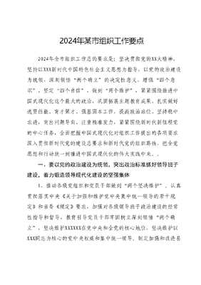 2024年某市组织工作要点2024年全市组织工作总的要求是:坚决贯彻党的XX大精神,坚持以XXX新时代中国特色社会主义思想为指导,以党的政治建设为统领,深刻领悟两个确立的决定性意义,增强四个意识、坚定四个自信、做到两个维护,紧紧围绕推进中国式现代化这个最大的政治,巩固拓展主题教育成果、扎实做好选贤任能、育才聚才、强基固本工作,提高政治站位、坚持稳中求进,突出问题导向、注重精准发力,紧紧围绕新时代新征程党的中心任务,全面把握中国式现代化对组织工作提出的各项要求深入贯彻新时代党的建设总要求和新时代党的组织路线,把全党思想和行动统一到推进中国式现代化的伟大实践中来。。一、要以党的政治建设为统领,突出政治标准抓好领导班子建设,着力锻造领导现代化建设的坚强集体1、推动各级党组织和党员干部做到两个坚决维护。认真贯彻落实中央《关于加强和维护党中央集中统一领导的若干规定》和省委《规定》要求,加强对各级领导班子政治建设的经常性指导和督导,教育引导党员干部牢固树立深刻领悟两个确立,坚决维护XXXXXX在党中央和全党的核心地位,坚决维护以XXX同志为核心的党中央权威和集中统一领导。制定加强和改进县乡领导班子思想政治建设实施意见,加强对民主集中制贯彻落实情况的督导,完善请示报告制度等相关规则,进一步提升干部政治意识、政治责任和政治能力。2、进一步严肃党内政治生活。严格执行新形势下党内政治生活若干准则,抓好各级领导班子民主生活会、组织生活会的组织实施,加强会前指导、会中督导、会后整改,切实提高党内政治生活质量。巩固万名党员进党校锤炼党性铸忠诚行动成果,深化落实党员活动日、政治生日提醒等制度,让党员参加组织生活、锤炼党性成为习惯。持续深入纠正四风,力戒形式主义官僚主义。积极倡导共产党人价值观,及时纠正污染党内政治文化的苗头性倾向性问题,推动形成正气充盈的政治生态。二、坚持不懈深化党的创新理论武装,巩固拓展主题教育成果,不断夯实推进中国式现代化的思想政治基础3、持续抓好党的XX大精神教育培训。做好全市县处级领导干部和各单位学习贯彻党的XX大精神集中轮训,高标准办好县处级干部、科级干部和中青年干部春秋两季研修班。举办两期党务骨干XX大精神和党章学习示范培训班,分类做好基层党支部书记全员轮训,扎实开展基层党务工作者系统培训。4、全面提升干部教育培训质量水平。制定干部部教育培训五年规划,开发干部教育培训信息化管理系统,建立健全培训班次审核报批、调训审报、培训需求反馈、培训质量评估等机制,增强干部培训的针对性和实效性,杜绝多头调训、重复培训、长期不训等问题。提升干部专业精神、专业素养。加强市县两级党校建设,打造具有特色的红色教育场所。与全国优质院校进行深度合作,打造一批高质量培训教学基地。三、坚持把从严管理监督和鼓励担当作为高度统一起来,坚持以正确用人导向引领干事创业导向,激励广大干部在推进中国式现代化中奋发进取、建功立业5、倡树鲜鲜明的用人导向。坚持党管干部原则,坚持新时期好干部标准,突出政治标准要求,树立事业为上理念,尊重干部成长规律,大力选拔政治过硬、敬业奉献、负责担当的干部,注重在年度考核和综合工作考核等重点工作考核中发现优秀干部,注重选用在改革创新、攻坚克难和艰苦环境中表现突出的干部,选优配强各级领导班子。建立专业化考察人员队伍,提高考察专业水平。强化党组织的领导和把关作用,严格落实凡提五必和党委书记、纪委书记在人选廉洁自律结论性意见上双签字等措施。制定干部选任纪实办法。推进干部档案信息化建设。6、实施优秀年轻干部、专业干部储备培养工程。着眼未来长远发展需要,制定年轻干部储备培养的实施意见。开展年轻干部储备工作专项调研,发现储备一批有专长、有潜质的好苗子建立完善年轻干部成长档案。实施培优工程,从各个领领择优堿选派40岁左右副县级干部、35岁左右正科级干部,强化集中培训适时选派到全市急难险重岗位或沿海发达地区进行实践历练、素能提升。实施选调生精准滴灌工程,研究制定选调生服务管理办法,建立部领导联系、所在单位主要负责同志一对一。指导帮带制度,畅通选调生机关与基层双向流动渠道。深入研判专业型干部的需求类型和需求数量,分领域分行业建立专业干部数据库7、加强干部管理监督。拓展监管内容,突出政治纪律和政治规矩、贯彻执行中央和省市委决策部署情况的监督。开展风险岗位排查,对权力集中、资金密集、资源富集的重点部门和关岗鍵位,列出重点监督对象名单,做到关键岗位重点监督。抓实领导干部个人有关事项报告的集中填报、随机抽查和重点核等工作査规范领导干部因私出国境监管,加大对领导干部的提醒、函询和诚勉力度,防止小毛病演化成大问题。巩固三超两乱整治成果,开展选人用人工作专项检和突出间题专项整治,进一步纯査洁选人用人风气。四、全