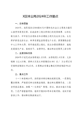 X区林业局2024年工作要点一、总体思路2024年,我局坚持以XXX新时代中国特色社会主义思想为指引认真贯彻落实区委、区政府和上级主管部门的决策部署,以林长制为抓手,牢牢抓住治理体系和治理能力现代化这条主线、生态保护修复这份主业、林草资源监督管理这个主责,紧紧围绕全区中心工作和大局,科学推进国土绿化,依法加强资源保护,高效发展绿色产业,真抓实干,奋勇争先,推动林业发展再上新台阶二、主要目标任务2024年计划完成油茶新造1.2万亩、油茶低改3.0万亩、义务植树 112.6万株。森林火灾发生率控制在0.045 次/ 万公顷以内受害率控制在0.9‰以内。主要林业有害生物成灾率控制在9‰以内。三、重点工作(一)林长制工作。持续推动林长制向纵深发展。一是强化服务保障,严格落实林长制配套制度,推动林长履职尽责。二是夯实基层基础,加强一长四员管理、培训,推动末端工作落实。三是严格督查考核,组织开展2024年林长制考核,适时开展督查工作,推动林长制高效运行。(二)国土绿化工作。坚持绿色发展,科学开展国土绿化。一是抓好泉南高速省级生态廊道建设,高质量完成1000亩的建设任务;开展乡村绿化,推进森林乡村建设。二是广泛开展全民义务植树活动,组织开展好3·12义务植树系列活动,确保全民义务植树尽责率达90%以上。三是加强林木种苗质量监管,严把种苗质量关,开展林业双打行动,规范种苗生产经营秩序。(三)森林防火工作。常态化开展森林防火宣传教育,加强野外火源管控和风险隐患排查,强化巡山护林和督查督导,杜绝重特大森林火灾和人员伤亡事故发生。建立完善的森林防火阻隔系统,加强X国家森林公园、X国有林场和集体林地连片面积5000亩以上林区的森林防火隔离带建设,全年计划完成生物防火林带建设1000亩、防火线20千米。在自然保护地、国有林场、省级以上公益林区林缘,市县区行政界线山脊等重要地段建设主生物防火林带,在人口集中居住区、重要设施处建设副生物防火林带。在不宜建设生物防火林带的地段修建防火线,在山区村与林区交界区域,将居民出行、林区道路与农村公路建设相结合,按照实现森林火灾扑救队伍徒步3公里半径作业圈的标准实施建设,修建和改善林区道路,实现工程隔离,形成网格化隔离。(四)产业发展工作。大力发展油茶、特色花木等林业产业扶持、培育和壮大一批具有带动和辐射作用的林业产业化龙头企业,带动辐射林业产业发展,形成产、供、销一体化的良性循环经济模式。重点抓好油茶产业发展,完成年度油茶新造林1.2万亩油茶低产林改造3.0万亩。积极争取国家、省、市项目资金,支持X生物科技有限公司推广应用油茶高效超临界二氧化碳低温萃取生产线列入中央油茶产业奖补项目建设,支持湖南天沃科技有限公司提升茶油精炼、包装生产线,提升本地茶油产品品质,打造一个区级茶油公用品牌。(五)林业碳汇和国储林项目开发工作。按照国家相关政策法规和技术要求,积极策划开发林业碳汇和国储林项目,引进碳汇、国储林项目开发公司,开发利用全区森林资源。(六)森林资源保护工作。一是保护森林资源,坚决筑牢生态屏障。开展好森林督查工作,加强野生动植物保护、公益林、天然林和古树名木保护管理,开展对林、草和湿地资源的调查、监测,严厉打击破坏林、草和湿地资源的行为,做好林、草和湿地保护修复。二是加强腾云岭国家森林公园和湘江省级湿地公园2处自然保护地管理,开展自然保护地监督工作,切实加强公园森林资源和景观资源保护。三是进一步加大安全生产、森林火灾和地质灾害隐患排查整治力度,加大宣传教育力度,组织开展安全生产月森林防火宣传月等活动,提高人民群众安全防范意识。四是加强林业有害生物防治。完善林业有害生物监测预警机制,确保监测覆盖率达100%;做好松材线虫病、松毛虫等林业有害生综合防治,拔除松材线虫病曲河疫点;高质量完成2023-2024年度松材线虫病除治工作,除治面积约1.96万亩,疫情小班292个,枯死松树10000株。五是加强野生动植物保护,开展保护千年鸟道安全专项行动,持续加强候鸟等野生动物保护,加强生物多样性保护。(七)林业发展基础保障工作。一是加强项目资金申报管理积极主动向省、市上级林业部门汇报,争取林业项目落地我区。主要从油茶产业发展和生态保护修复两大类项目进行谋划,向上级争取财政项目资金。全年计划争取省级生态廊道建设项目(X万元)、造林补助(X万元)、森林质量精准提升(X万元)、油茶产业发展项目(X万元),在市林业局统一安排下申报国家油茶产业发展示范项目(X万元)等财政项目资金X万元。在区政府统一布署下积极包装申请增发国债森林防火应急道路建设工程。加强项目资金使用管理,保障资金安全高效运行,发挥资金使用效益。二是加强林业宣传。扎实推进林业宣传,利用3.12植树节湿地保护日世界野生动植物日爱鸟周森林防