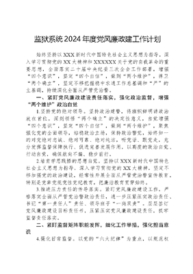监狱系统2024年度党风廉政建工作计划始终坚持以XXX新时代中国特色社会主义思想为指导,深入学习贯彻党的XX大精神和XXXXXX关于党的自我革命的重要思想,全面落实二十届中央纪委三次全会工作部署,增强四个意识,坚定四个自信,做到两个维护,捍卫两个确立,坚定不移把握稳中求进工作总基调和严的主基调,持续深化全面从严管党治警。一、紧盯党风廉政建设责任落实,强化政治监督,增强两个维护政治自觉1.坚持党的绝对领导。坚持政治建警,将旗帜鲜明讲政治放在首位,深刻领悟两个确立的决定性意义,自觉增强四个意识,坚定四个自信,做到两个维护,聚焦强化党的全面领导,站稳政治立场,保持政治警觉,始终如一的对党绝对忠诚、绝对可靠、绝对纯洁,听党话、跟党走,充分发挥监督保障执行、促进完善发展作用,以高度的政治自觉、行动自觉,确保航向不偏、稳步前行。2.培育学思践悟的思想自觉。坚持以XXX新时代中国特色社会主义思想为指导,深入学习贯彻党的XX大精神,坚定不移加强党的政治建设,经常性开展全面从严管党治警宣传教育,特别是党章党规党性党纪教育,把廉洁教育贯穿始终。3.推进压力责任的传导落实。紧盯党风廉政建设工作,严格落实全面从严管党治警政治责任,进一步压紧压实政治责任、书记第一责任人责任、领导班子一岗双责。层层签订党风廉政建设目标责任书,压紧压实党风廉政建设责任,抓牢监督责任落实。二、紧盯监督矩阵职能发挥,细化工作举措,强化担当意识4.强化日常监督。以党的六大纪律为重点,以规范权力运行为核心,以制度执行力为抓手,突出监督重大决策落实、重点领域权力运行、各项纪律落实、履职担当等内容,持续提升执行力,打通执行的最后一公里。坚持关口前移,充分发挥监督探头作用,综合运用听看谈谏查研等形式做细做实日常监督,推动监督下沉、监督落地,增强监督实效。5.抓牢专项监督。以上级巡察、专项检查反馈问题为问题导向,聚焦权力集中的部门以及选人用人、项目建设等重点领域,有效开展点穴式专项监督,集中力量解决重点领域关键环节在一定时期内的突出问题、苗头性问题,综合分析问题成因、性质、后果,打通堵点、消除痛点,解决难点,充分发挥监督在综合治理中的基础性、保障性作用。6.抓好审计监督。立足审计监督首先是经济监督定位,做好常态化经济体检工作。坚持依法审计、客观公正,既查病又治已病。紧盯时间节点,根据内控要求,把好审计关口,加强对审计建议的跟踪问效,推动审计成果运用,及时进行内部审计,做到一事一审计、事毕即审计。7.拓宽社会监督。更加注重家庭助廉作用,持续完善廉洁互助圈建设,真正达到家访说廉、电话问廉、座谈醒廉的目的,督促各支部加强与家属的交流沟通,此项作为党风廉政建设的考核内容,要及时掌握有无不良反映,提前介入教育提醒,做实全过程、无死角八小时以外监督。三、紧盯执纪问责和跟踪问效机制,强化正风肃纪,持续做好后半篇文章8.注重激励担当作为。更加注重严管厚爱结合,激励约束并重,落实三个区分开来要求,在坚持严管和约束的基础上,对受处分干部加强教育引导关心,配合支部做好后半篇文章,激励担当作为,既体现监督执纪的力度,又体现组织关爱的温度。加强规范执法教育,督促依规依纪依法开展工作,持之以恒推进严格规范公正文明执法。用好容错纠错机制,让担当作为者心无旁骛。9.用好用活四种形态。坚持纪严于法、纪在法前、执纪执法贯通,综合运用监督执纪四种形态,深化第一种形态运用机制,区分苗头倾向、一般违纪、严重违纪、涉嫌违法问题界限,建立批评教育、组织处理、纪律处分、立案审查四道防线,通过加大监督检查、教育引导、追责问责,既让铁纪带电长牙,又让干部醒悟、知止,坚决制止小问题演变成大问题、小隐患发展成大事故,坚决防止由违规走向破纪、由破纪走向违法、由违法走向犯罪。10.做深做实后半篇文章。综合各类监督,对发现的问题建立健全台账管理、动态跟踪、限期办结、督查问责、回头看等措施,实施一台账(整改台账)、两清单(问题清单、责任清单)、双责任(直接责任、领导责任)、双问责(一案双查)监督机制,推进发现问题、严明纪法、整改纠偏、深化治理的监督闭环机制。同时,建立健全处分决定执行宣布、回访教育、情况报告和专项检查等制度,加强与相关党组织及职能部门的协作沟通,确保处分决定得到严格执行,努力实现政治效果、纪法效果、社会效果相统一。四、紧盯作风成效,强化教育引导,持续抓好作风建设11.纠治并举筑牢堤坝。持之以恒抓好中央八项规定精神实施细则的落实,时刻防范四风问题隐形变异。把落实中央八项规定精神作为一项政治纪律和政治规矩。坚决纠治打折扣、搞变通、各行其是,急功近利、脱离实际,机械执行、消极应付等问题。强化监督