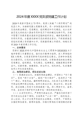 2024年度XXXX党支部党建工作计划2024年是新中国成立75周年,是深入实施十四五规划的攻坚之年。为持续巩固主题教育成果,进一步加强党的领导以及党的政治建设、思想建设、组织建设和作风建设,充分发挥基层党支部的战斗堡垒作用和党员干部的模范先锋作用,为城市管理工作高质量发展提供坚强的组织保证,确保党的建设工作顺利开展,全面落实新时代党的建设总要求,不断提高基层党组织党建工作质量和水平,现根据党建工作要求,特制定支部2024年度党建工作计划。一、总体要求坚持以XXX新时代中国特色社会主义思想和XXXXXX关于城市管理工作重要论述、指示批示精神为指导,深入贯彻党的XX大精神,全面落实新时代党的建设总要求,坚持和加强党的全面领导,以党的政治建设为统领,全面推进党的政治建设、思想建设、组织建设、作风建设、纪律建设,把制度建设贯穿其中,创新举措、拼搏进取、担当作为、创先争优,扎实推进各项工作任务落地落实。二、加强政治建设,理论武装头脑(一)提高政治站位,加强思想政治建设。牢固树立四个意识,坚定四个自信,做到两个维护,坚决悍卫两个确立。对党忠诚,旗帜鲜明讲政治,大队班子成员带头遵守政治纪律和政治规矩,始终在政治立场、政治方向、政治原则、政治道路上同党中央保持高度一致,深入贯彻中央、省委、市委、县委关于维护党中央集中统一领导的有关规定。(二)以身作则带头,严肃党内政治生活。严格执行新形势下党内政治生活若干准则,全面落实三会一课、组织生活、谈心谈话、民主评议党员等组织生活制度,对党员、干部职工加强经常性教育、管理和监督。加强对贯彻执行准则情况的督促检查,层层传导压力责任,领导干部率先垂范、以上率下,增强党内政治生活的政治性、时代性、原则性、战斗性。加强党内政治文化建设,善于在优秀传统文化中汲取营养,倡导简单上下级关系,积极营造风清气正的政治生态。(三)加强党性锻炼,煅造忠诚品格。经常开展党性教育和党性分析,利用七一建党节等节日活动,参观红色教育基地,利用好红色资源,传承红色文化基因;开展党课开讲啦等教育活动,树立正确的世界观、价值观、人生观,引领支部全体党员、干部职工自觉把对党忠诚、为党分忧、为党尽职、为民造福作为根本政治担当。三、加强思想建设,筑牢思想基础(一)加强学习教育,提升党员队伍整体素质。巩固拓展主题教育成果,总结运用好的经验做法,紧扣学习贯彻XXX新时代中国特色社会主义思想,围绕加强理想信念教育和对党忠诚教育,通过三会一课、主题党日等活动认真学,不断开展党员学习教育活动,充分发挥基层党组织的思想政治工作优势,引导支部全体党员、干部职工听党话、感党恩、跟党走。(二)创新活动载体,加强意识形态工作。有效利用学习强国APP、共产党员网等网络平台,加强意识形态(含网络意识形态)工作,履行意识形态工作责任制。加强政治理论学习,不断提高政治觉悟和政治能力,努力提高党员、干部职工的政治素质。通过组织开展党员双报到,深化皖美红色物业建设推进执法力量下沉,抓住红根本,突出红元素,汇聚多方力量,着力破解小区治理难点堵点痛点,不断提升群众生活幸福感和基层社会治理参与感。(三)认真组织开展,做好组织生活会和民主评议工作。严格按照县直工委和局党建办相关要求,开展好组织生活会和党员民主双评议工作,积极开展批评与自我批评,针对反映出来的问题,列出整改清单,全面及时整改到位。要善于总结经验,不断提高思想认识。四、加强组织建设,夯实基层堡垒(一)严格审查规范程序,做好换届选举工作。按照《中国共产党章程》《中国共产党基层组织选举工作条例》等有关规定,精心部署促落实,严格审查强标准,做好党支部换届选举工作,不断提升党支部书记和支委班子的履职能力,全力推进城市管理工作高质量发展。(二)加强党员队伍建设,擦亮支部党建品牌。坚持把抓好党建作为最大政绩,围绕中心抓党建,抓好党建促发展,在突出政治引领、夯实基础保障上持续发力,积极创建城市管理绣花针党建品牌,以品牌提品质,促进党建与城市管理业务工作融合发展。加强党员队伍建设,提高队伍凝聚力、战斗力,充分发挥党组织的战斗堡垒作用。严格标准规范,把好党员入口关,严格审查,提升党员队伍先进性和纯洁性。重视党员干部培训,提高党员干部履职能力,为加强党的建设提供组织保障。(三)落实工作制度,充分发挥组织功能。按照党组织建设明确要求和规定,全面抓好党支部每月的主题党日活动,落实三会一课制度。按要求每月及时全额上缴党费,并对缴纳党费情况进行公示。五、加强作风建设,树牢纪律规矩意识(一)履行主体责任,强化党员干部管理。充分发挥党组织理论创新和实践相结合的优良作风,坚持从严治党的原则,严格遵守中央八项规定,着力克服形式主义、官僚主义,纠正四风;全面履行落实党风廉政建设主体责任和监