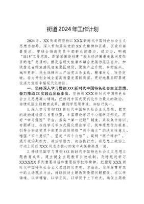 街道2024年工作计划2024年,XX街道将坚持以XXX新时代中国特色社会主义思想为指导,深入贯彻落实党的XX大精神和区委、区政府部署要求,带领全街道党员干部群众挖潜力、提实力,明确1115工作思路,即紧紧围绕创建胶东经济圈最美休闲度假目的地总目标,擦亮省级文旅康养融合发展示范区名片,加快推进省级旅游民宿集聚区建设,聚焦产业升级、乡村振兴、城市更新、民生保障和从严治党五条主线,精准发力、攻坚突破,奋力开创全域全面高质量发展新局面,更好地服务即墨建设活力宜居幸福现代化新区。一、坚持深入学习贯彻XXX新时代中国特色社会主义思想,奋力推动XX实践迈出新步伐。坚持用XXX新时代中国特色社会主义思想凝心铸魂,把推进中国式现代化作为最大的政治,持续巩固主题教育成果,做到学思用贯通、知信行统一。1.深入学习贯彻XXX新时代中国特色社会主义思想。把党的政治建设摆在首要位置,丰富理论学习中心组学习形式,用好学习强国平台,落实第一议题制度,采取集中培训、专题研讨、在线学习等方式强化理论学习,筑牢理想信念根基。引导全街道党员干部更加深刻领悟两个确立的决定性意义,增强四个意识、坚定四个自信、做到两个维护,提升政治判断力、政治领悟力、政治执行力,在思想上政治上行动上同以XXX同志为核心的党中央保持高度一致。2.持续巩固学习贯彻XXX新时代中国特色社会主义思想主题教育成果。建立健全主题教育长效机制,及时跟进学习XXXXXX系列重要讲话和重要指示批示精神,把握好XXX新时代中国特色社会主义思想的世界观、方法论,运用好贯穿其中的立场观点方法,持续抓好主题教育查摆问题整改,在以学铸魂、以学增智、以学正风、以学促干上下功夫,确保主题教育走深走实。3.坚持在服务市区发展大局中争创一流业绩。锚定走在前、开新局,按照市委建设新时代社会主义现代化国际大都市和区委建设活力宜居幸福现代化新区系列部署,扛牢文旅产业、海洋经济发展重任,更好地服务融入建设引领型现代海洋城市、现代产业先行城市、活力宜居幸福现代化新区等市区发展大局,围绕党工委总体发展思路目标,在转方式、提质量、增效益上勇于担当、加压奋进,持续推动产业发展实现质的有效提升和量的合理增长,增进民生福祉,保持社会和谐稳定,推进XX实践迈出坚实步伐。二、聚焦产业升级,奋力在推动文旅康养产业融合发展上实现新突破。依托省级文旅康养融合发展示范区和省级旅游民宿集聚区创建叠加优势,紧抓经济指标全面提增,推动老项目提档升级,在建项目加快运营,新项目招引再创新高,加速集聚优质产业要素,力促产业融合发展,聚力打造胶东经济圈最美休闲度假目的地。4.加强经济运行调度分析。盯紧年度主要经济指标,加强经济运行研判分析和措施应对,集中力量补短板、强弱项,重点抓好固定资产投资、规上工业、社会消费品零售总额、货物进出口、外资到账等关键指标调度分析,推动青岛酒店管理职业技术学院、新建XX卫生院等项目尽快开工纳统,确保在季度和全年考核中争取主动、争先进位。争取落户一批批零餐饮企业,保持服务业、批零住餐业增长态势。高质量完成第五次经济普查任务。5.帮助建成项目提档升级。引导天泰集团等本土龙头企业升级老旧设施,面向不同群体开发新服务,全方位提升游客餐饮、住宿、游玩体验。完善海XX文旅联盟运营机制,推动XX主题酒店互惠共赢、一体发展。拓展XX+影视发展模式,依托青岛国际博览中心、天泰综合度假区打造影视基地,导入人气、带动发展。帮助XX建设集团、海燕化工有限公司和裕顺隆木业有限公司等企业申报高新技术企业。6.力促在建项目加快进度。做好全过程跟踪服务,确保7个省市区重点项目按时推进,保障青岛蓝谷膜天科技产业园完工运营,国际竹藤组织青岛科技基地工程材料实验室竣工启用,青岛海洋中药质量研究与评价重点实验室顺利入驻,千里新材高性能氮化硅制品产业化及总部基地加快建设,海洋新能源产业园一期、青岛酒店管理职业技术学院即墨校区一期和天泰山艺术中心实现开工。7.创新文旅业态激发活力。做好全域产业规划,深挖皋虞古城、琅琊王氏等文化资源,打造文化创意产业;结合美谷产品、美食美景发展美丽产业,引进大型商业综合体和儿童游乐场所,布局康养服务;围绕四季不同主题,积极筹办摄影骑行等赛事,以及XX节、音乐节等活动,推动文旅业态由单一的泡汤住宿向更加多元、更加时尚的方向发展。三、聚焦乡村振兴,奋力在打造乡村振兴示范样板上实现新突破。按照党建统领、产业支撑、生态宜居、城乡融合、共同富裕思路,整合各类涉农资源,确保做到面子里子并重、颜值内涵齐抓,为全域振兴与高质量发展提速加码。8.加速推进文旅汤上乡村振兴示范片区建设。实施山里民宿配套、皋虞文化建设、示范片区重要节点提升三大工程,尽快凸显示范片区形象。压茬推进美丽乡村建设,将麻戈庄、东皋虞自然村打造