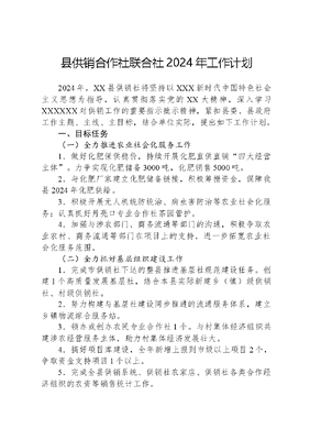 县供销合作社联合社2024年工作计划2024年,XX县供销社将坚持以XXX新时代中国特色社会主义思想为指导,认真贯彻落实党的XX大精神,深入学习XXXXXX对供销工作的重要指示批示精神,紧扣县委、县政府工作主题、主线、主目标,结合单位实际,提出如下工作计划。一、目标任务(一)全力推进农业社会化服务工作1.做好化肥保供稳价,持续开展化肥直供直销四大经营主体。力争实现化肥储备3000吨,化肥销售5000吨。2.与化肥厂家建立化肥储备链接,积极筹措资金,保障我县2024年化肥供给。3.积极开展无人机统防统治、病虫害防治等农业社会化服务;认真抓好月亮口专业合作社茶园管护。4.加强与涉农部门、商务流通等部门的沟通,积极争取农业农村、商务流通等部门在项目上的支持,进一步拓宽农业社会化服务范围。(二)全力抓好基层组织建设工作1.完成市供销社下达的整县推进基层社规范建设任务。创建1个高质量发展基层社,结合本县实际新建乡(镇)级供销社、村级供销社。2.努力构建与基层社建设同步推进的流通服务体系,建立乡镇物流综合服务站。3.领办或创办农民专业合作社1个。与村集体经济组织共建涉农经营服务主体,助力村集体经济发展壮大。4.搞好项目库建设,全年新增上报到市级以上项目2个,争取资金支持项目1个以上。5.完成全县供销系统、供销社农家店、供销社各类合作经济组织的农资等销售统计工作。6.积极通过资产置换、战略联盟等方式,强化社有资产的管理和运营,确保社有资产保值增值。(三)全力抓好农村合作金融发展服务工作1.力争完成利民投资公司、股金服务部调剂端资金清收工作。2.以农村产权交易一平台五中心为载体,强化管理运营,加大与第三方服务合作机构合作,强化政策宣传、信息收集、交易服务、资产评估、融资咨询服务等工作,努力提高交易服务水平。3.加强与贵州阳光交易所合作,继续推进贵州省阳光产权交易所XX会员单位各项业务,扎实开展一系列积极有效地探索,努力创收。(四)全力抓好农村电子商务工作1.加强与贵电商的协作对接,持续完善城乡流通服务网络,促进城乡商品双向流通。2.推进库存商品的销售减量工作。与电商企业建立合作关系,依托第三方电商平台,将供销社的优质农产品供应给电商平台进行销售,促进线上线下融合发展;运营好西望山团圆山息农等品牌,依托加工厂做好招商合作及蜂蜜代加工工作。(五)切实加强财务管理,强化内部管理1.严格执行财经纪律,按规定程序完成各项财务工作。加强各项工作中的资金监管和审计,聚集重点领域和重要环节,对全系统相关项目资金进行有效监管。2.加强财会联网直报工作,确保上报数据及时、准确、全面。3.做好各种款项的清收、催缴工作。4.做好全系统固定资产管理台账统计工作。5.抓好三降二清一扭工作。(六)切实加强自身建设,强化制度执行1.进一步制定完善《XX县供销合作社联合社机关财务管理办法》《XX县供销合作发展基金管理暂行办法》《XX县供销社出资人权责清单》等制度,不断规范社有资产管理,持续推进内部监督管理机制。2.逐步完善内部薪酬制度改革,建立符合市场化需求的人才聘用和内部考核评价机制。3.持续深入开展庸、懒、散、软、浮、推作风整肃,积极营造干事创业、担当作为的浓厚氛围。4.强化《贵阳市供销合作社系统监事会工作规则》执行力度,持续推进监事会监督、审计监督、财务监督机制。(七)坚持党建引领,加强党的政治建设1.认真抓好党的建设和党风廉政建设工作,严守政治纪律和政治规矩,深入实施筑固工程。2.按照县委的统一部署,持续抓好系统内宣传思想和意识形态工作,确保不发生意识形态领域风险事件。3.认真抓好巩固拓展脱贫攻坚成果同乡村振兴有效衔接工作。(八)强化风险防控,认真抓好安全生产1.落实安全生产一岗双责和企业主体责任,加强烟花爆竹仓库和社有资产点的管理和排查整治,确保全年不发生安全生产事故。2.扎实做好信访维稳工作,畅通信访渠道、积极化解矛盾,确保系统和谐稳定。(九)完成市供销社和县委、县政府安排的其他工作。二、保障措施(一)加强组织领导。及时组织召开会议进行研究部署,细化工作措施,明确领导职责及各科室各企业工作任务和完成时限,确保思想统一、行动一致。按照任务分工,认真抓好工作的督促指导,强化贯彻落实。(二)加大资金投入。加强与行业部门沟通对接,积极争取各级的助农政策及项目支持。加强与金融机构的合作,解决在生产经营过程中的资金需求。积极探索土地、产权作价出资入股、合作开发等方式,积极引入社会资本投入。加大与涉农经济组织的合作,形成良性循环的合作机制。(三)强化督促检查。充分发挥监事会监督作用,逐步建立健全过程服务的监管机制,加强对服务质量和效果的监督和评估,确保服务的规范和可持续发展。加强对农产品生产、加工、销售等环节的监管,保障农产品的质量和安全