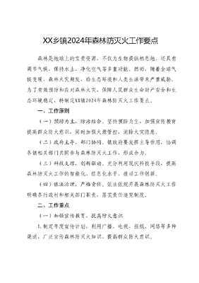 XX乡镇2024年森林防灭火工作要点森林是地球上的宝贵资源,不仅为生物提供栖息地,还具有调节气候、保持水土、净化空气等多重功能。然而,随着全球气候变暖,森林火灾频发,给生态环境和人类生活带来严重威胁。为了有效预防和应对森林火灾,保障人民群众生命财产安全和生态环境稳定,特制定XX镇2024年森林防灭火工作要点。一、工作原则(一)预防为主,防治结合。坚持预防为主,加强宣传教育提高群众防火意识,同时加强火源管控,消除火灾隐患。(二)政府主导,部门协同。镇政府要发挥主导作用,协调各镇相关部门共同参与森林防灭火工作,形成合力。(三)科技支撑,创新驱动。充分利用现代科技手段,提高森林防灭火工作的智能化、信息化水平,推动工作创新。(四)依法治理,严格责任。依法依规开展森林防灭火工作明确各行政村和相关部门职责,落实责任追究制度。二、工作重点(一)加强宣传教育,提高防火意识1.制定年度宣传计划,利用广播、电视、报纸、网络等多种渠道,广泛宣传森林防灭火知识,提高群众防火意识。2.在重点时段(如春季、秋季等)和重点区域(如林区、景区等)开展集中宣传活动,增强宣传效果。3.加强对学生、各村农民等群体的宣传教育,组织开展森林防灭火知识竞赛、演讲比赛等活动,提高群众参与度。(二)加强火源管控,消除火灾隐患1.严格执行野外用火审批制度,加强对野外用火行为的监管和处罚力度。2.加强对林区、景区等重点区域的巡逻检查,及时发现和消除火灾隐患。3.加强对电力、通信等基础设施的维护和管理,防止因设备故障引发火灾。(三)完善应急体系,提高处置能力1.修订完善森林火灾应急预案,明确各行政村和相关镇部门职责分工,确保预案的科学性和可操作性。2.加强应急队伍建设,提高扑火队员的素质和能力,确保在火灾发生时能够迅速响应、有效处置。3.加强应急物资储备和设施建设,确保在火灾发生时能够及时提供必要的扑火装备和物资。(四)加强监测预警,提高防控水平1.加强气象监测和预警,及时掌握天气变化和林区火险等级信息,为火灾防控提供科学依据。2.加强视频监控和无人机巡航等技术应用,提高森林火灾监测和预警能力。3.加强与相邻乡镇的沟通协调,建立跨区域森林防灭火联动机制,共同应对森林火灾。(五)加强监督检查,落实责任追究1.加强对森林防灭火工作的监督检查,定期对相关部门和单位的工作情况进行检查和评估。2.对工作中存在的问题和不足及时进行整改和纠正,确保各项工作落到实处。3.对因工作不力导致森林火灾发生的单位和个人依法依规追究责任,严肃处理相关责任人。三、保障措施(一)加强组织领导,明确工作职责。镇政府要成立专门的森林防灭火工作领导小组,明确各行政村和相关部门的工作职责和任务分工,确保工作有序开展。(二)加大投入力度,保障工作经费。镇政府要加大对森林防灭火工作的投入力度,确保工作经费的落实和使用效益。(三)加强队伍建设,提高人员素质。加强扑火队伍建设和管理,提高扑火队员的素质和能力水平,确保在火灾发生时能够迅速响应、有效处置。(四)加强科技创新,提升智能化水平。充分利用现代科技手段,加强森林防灭火工作的智能化、信息化水平建设,提高工作效率和质量。本乡镇2024年森林防灭火工作要点的制定和实施,对于有效预防和应对森林火灾、保障人民群众生命财产安全和生态环境稳定具有重要意义。XX镇各部门需继续加强宣传教育、火源管控、应急体系建设、监测预警和监督检查等方面的工作,不断提高森林防灭火工作的水平和能力。同时,积极争取县直相关部门和各乡镇能够给予更多的支持和帮助,共同推动XX镇森林防灭火工作取得更大的成效。