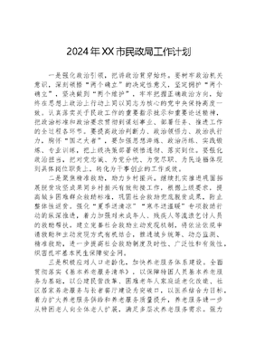 2024年XX市民政局工作计划一是强化政治引领,把讲政治贯穿始终。要树牢政治机关意识,深刻领悟两个确立的决定性意义,坚定拥护两个确立,坚决做到两个维护,牢牢把握正确政治方向,始终在思想上政治上行动上同以同志为核心的党中央保持高度一致。认真落实关于民政工作的重要指示批示和重要论述精神,把政治标准和政治要求贯彻到谋划事业、部署任务、推进工作的全过程各环节。要提高政治判断力、政治领悟力、政治执行力,胸怀国之大者,要加强思想淬炼、政治历练、实践锻炼、专业训练,把上级决策部署领悟透彻、落实到位。要强化政治担当,把对党忠诚、为党分忧、为党尽职、为民造福体现到具体岗位职责上,转化为干事创业的工作成效。二是聚焦精准救助,助力乡村振兴。继续扎实推进巩固拓展脱贫攻坚成果同乡村振兴有效衔接工作,根据上级要求,提高城乡困难群众救助标准,巩固社会救助兜底脱贫成果,防止整体性返贫。强化夏季送清凉寒冬送温暖专项救助行动的纵深推进,着力加强对未成年人、残疾人等流浪乞讨人员的救助帮扶。建立完善社会救助主动发现机制,将依法依规申请救助和主动发现方式有机结合,推进城乡统筹、动态监测、精准救助,进一步提高社会救助制度及时性、广泛性和有效性,织密扎牢基本民生保障安全网。三是积极应对人口老龄化,加快养老服务体系建设。全面贯彻落实《基本养老服务清单》,以保障特困人员基本养老服务为基础,以公建民营改革、困难老年人家庭适老化改造、社区居家养老服务与长者餐厅建设为突破口,以医养结合为目标,着力扩大养老服务供给和养老服务质量提升,养老服务进一步从特困老人向全体老人扩展,满足多层次养老服务需求。强力推进养老及其他民政服务机构安全生产治本攻坚三年行动,全面落实安全生产15条硬措施,确保全市民政服务机构安全有序运行。配合做好积极应对人口老龄化重点联系城市试点第一阶段评估工作。四是加大未成年人关爱保护力度。进一步健全儿童关爱保护机制,加强13个乡镇(街道)未成年人保护中心运行,推动全市未成年人保护工作向深度广度发展,强化留守儿童关爱保护措施,落实定期探访制度。加强儿童福利政策宣讲,落实儿童福利政策最后一百米行动,儿童福利要进一步从孤残儿童、事实无人抚养儿童向所有需要帮助的困境儿童、流动儿童扩展,确保散居孤儿生活标准不低于1100元/月。五是坚持强基层打基础。持续深化基层民主自治,完善民主决策、议事协商、民主公开、述职评议等机制,推动与指导村(居)规民约落地生效,有效推进五百行动和四类乡村建设。牵头完成XX市与汝城县的边界年检工作,配合XX市与宜章县完成边界年检工作,有效推进XX与汝城、宜章平安边界建设活动。持续推进XX爱心积分基层社会治理创新模式的推广运用,营造共建共治共享的良好社会氛围,力争打造新亮点。充分发挥乡镇社会工作服务站基层治理作用。配合做好机构改革相关工作。六是坚持强化专项社会事务管理工作。持续做好做实慈善幸福家园村社互助工程,助力乡村振兴。全市福利彩票销售以完成4460万任务为目标、以线上+线下发力数字新营销为抓手,着力招募和培养新生代站点业主,全市新增5家以上新人新店;打造XX福彩新的旗舰型体验店,整体翻新改造新区剧院销售站点等老旧销售站点;大胆尝试直播引流,全力打造XX福彩官方抖音号、资鑫联盟许姐聊三弟等特色专栏;制定奖励激励措施,力争打造一家以上销售千万级头雁站点、特色营销站点,并予以奖励。配合做好婚姻登记全国通办相关工作,持续推进婚俗改革和婚育一件事一次办工作。持续完善困难重度残疾人集中照护中心的建设,推进残疾人福利工作制度化规范化,困难残疾人生活补贴和重度残疾人护理补贴均提高到每人每月不低于90元。配合做好殡葬改革综合试点验收工作,深化我市殡葬改革。