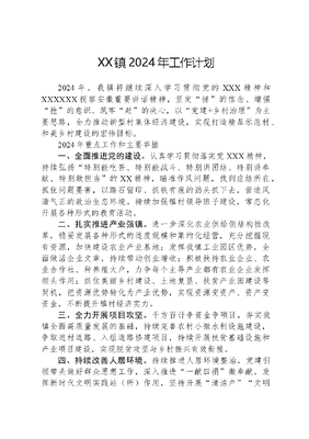 XX镇2024年工作计划2024年,我镇将继续深入学习贯彻党的XXX精神和XXXXXX视察安徽重要讲话精神,坚定拼的信念、增强抢的意识、筑牢赶的决心,以党建+乡村治理为主要思路,全力推动新型村集体经济建设,实现打造精品示范村、和美乡村建设的宏伟目标。2024年重点工作和主要举措一、全面推进党的建设。认真学习贯彻落实党XXX精神,持续弘扬特别能吃苦、特别能战斗、特别讲团结、特别讲奉献、特别敢担当的XX精神,瞄准作风问题,找到症结所在,抓住问题要害,以踏石留印、抓铁有痕的劲头抓下去,营造风清气正的政治生态环境。持续加强镇村领导班子建设,常态化开展各种形式的教育活动。二、扎实推进产业强镇。进一步深化农业供给侧结构性改革,稳妥发展各种形式的适度规模和集约化经营,充分挖掘现有资源,加快建设农业产业基地;发挥我镇工业园区优势,全面做活企业文章,持续带动创业增收;积极扶持农业企业、农业合作社、种养殖大户,力争每个主导产业都有农业企业发挥领头作用;抓住美丽乡村建设、土地复垦、扶贫产业园建设等契机,把资源优势转化为产业优势,实现资源变资产、资产变资金,不断提升镇村经济实力。三、全力开展项目攻坚。千方百计争资金争项目,夯实我镇全面高质量发展的基础,持续完善农村小微水利设施建设,争取进村道路、入组道路修建项目,持续开展扶贫基础设施和产业项目建设,实现脱贫攻坚与乡村振兴有效衔接。四、持续改善人居环境。持续推进人居环境整治,党建引领带头做好群众思想工作,深入推进一献四捐微奉献,发挥新时代文明实践站(所)作用,坚持开展清洁户文明户美丽庭院平安家庭等评选活动,常态化开展文明实践活动和理论宣讲,持续推进农村移风易俗,治理婚丧陋习,为改善人居环境提供精神保障。五、持之以恒改善民生。着力保障和改善民生,不断提高群众的幸福指数,进一步完善公共服务体系,严格落实各项惠民和救助政策,加快建设完善农村公共文化设施,继续提升教育办学水平。加强和创新平安建设,落实信访制度,完善调解联动工作体系,做到小事不出村、大事不出镇,全面提升群众安全感和满意度。加强基层应急管理能力建设,持之以恒抓好安全生产工作。六、全面推进乡村振兴。坚持党建引领各项中心工作,构建党建+乡村振兴工作机制,促进乡村全面振兴,持续巩固脱贫攻坚成果,严格落实脱贫户、监测户各项帮扶措施。积极抓好本地特色产业,实现以产业振兴为基础的五大振兴,不断丰富完善乡村治理试点示范工作,发挥我镇资源及地理优势,不断增加村集体收入。
