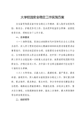 大学校园安全稳定工作实施方案为全面贯彻落实省市安全稳定工作精神,深入做好当前防风险、保安全、护稳定各项工作,坚决筑牢校园安全屏障,按照院党委安排,现制定如下工作方案。一、总体要求(一)指导思想。坚持以xXXX新时代中国特色社会主义思想为指导,深入学习贯彻党的XX大精神和XXXXXX来陕考察重要讲话重要指示,坚持总体国家安全观,全面落实全省校园安全工作会议、全市维稳安保工作会议部署要求,把中国—中亚峰会维稳安保工作作为当前压倒一切的重大政治任务,统筹抓好校园防风险保安全、护稳定各项工作,为中国—中亚峰会圆满举行打造坚不可摧的安全屏障。(二)工作目标。以最大决心、最高标准、最严要求、最实举措、最硬作风,深入做好当前校园安全稳定工作,紧盯重点群体、重点场所、重点物品、重点时段,争分夺秒排查化解各类安全隐患,确保政治类敏感事件、聚集性疫情、涉校涉生案件、重大安全事故、大规模群体性事件、集体上访事件、重大舆情事件等全部实现零发生。二、组织领导学院安全稳定工作由学院党政主要领导全面负责,各分管院级领导按职责分工分头落实,情况汇总、统筹协调等日常工作由学院安全稳定工作领导小组办公室具体负责,各职能部门各负其责、密切协作,形成齐抓共管合力。同时,成立政治安全、校园安全、生产安全、信访稳定、疫情防控5个工作专班,负责深入做好当前校园安全稳定工作。(一)政治安全工作专班(二)校园安全工作专班(三)生产安全工作专班(四)信访稳定工作专班(五)疫情防控工作专班三、主要任务(一)坚决捍卫政治安全,确保政治类敏感事件、重大舆情事件零发生(政治安全工作专班负责)。1.强化反恐维稳工作。牢牢把握内防风险、外防渗透工作要求,健全完善学院安全稳定形势分析研判制度,在xxx、xxxx等重大敏感节点启动日研判、日调度、日报告机制,提高涉稳情报信息的搜集、研判、处置水平。加强校园内部防范、灵通情报信息,及时掌握敌对势力煽动蛊惑学生的苗头动向,有针对性地做好工作。加强《反恐怖主义法》宣传教育,会同公安部门积极开展反恐专题讲座、演练,严防各类邪教组织向校园渗透。做好统一战线工作,加强民族学生和有宗教信仰学生管理。2.强化意识形态管理。严格落实xx形态工作责任制,牢牢把握党对意识形态的绝对领导权。强化正面宣传,加强爱国主义教育、世情、国情和省情教育、总体国家安全观教育,引导学生正确认识国际国内大事件、热点问题,坚决防止出现危害国家政治安全的言论和行动。加强各类报告会、研讨会、讲座、论坛、读书会、学术沙龙等管理,杜绝有损国家利益和不利于学生健康成长的言行。稳妥摸排学院涉政治敏感问题的微信群、QQ群等网络群组,严密防范和坚决打击任何政治类网络社团滋长蔓延。3.强化舆情监测防控。加强网络安全,坚持源头清网、依法治网、技术护网并举,强化硬件设施、网络安全教育、网安人才队伍建设。畅通和学生沟通渠道,通过设立信息平台、投诉电话投诉信箱等,及时收集学生意见建议,做到件件有落实,事事有回音,真正把问题隐患解决在萌芽状态,杜绝舆情发生。做好热点问题舆论引导和宣传教育工作,紧盯涉陕、涉咸、涉峰会、涉学院各类舆论热点,加强网站、融媒体账号动态筛查,对任何负面舆情和不实信息,第一时间封堵删除、依法处理。(二)全力维护校园安全,确保涉校涉生案件、学生非正常死亡案件零发生(校园安全工作专班负责)。4.强化平安校园创建。加强人身财产安全,深入开展校园周边综合环境治理和校园内野生动物清理,严厉打击涉校涉生违法行为。加强消防安全,定期排查消防设施、耐火材料、用电安全燃气管道、压力容器等,排除安全隐患。加强校园车辆安全,严格校内机动车管理,实行校园道路高峰时段交通管制,确保校内交通安全。完善心理危机预防、筛查、干预和治疗工作制度,密切关注学生思想动态,特别是身体疾患、心理异常、家庭困难等特殊学生群体,及时发现并解决学生遇到的困难和心理健康等问题。5.强化安全隐患排查。加强校内安全隐患排查,紧盯餐厅、公寓、教学楼、图书馆、车库、工地、地下空间、实验实训室、物资仓库、配电室、水电气设施、消防汞房等重点场所,按照管理职责,开展全方位、立体化、地毯式和多轮次排查,找准找深找透各方面风险隐患。坚持清单制+责任制+销号制,对发现的问题分领域建立健全问题清单、措施清单、责任清单,即知即改、立行立改,将不稳定、不安全因素消除在未起之时,迅速提升校园安全稳定系数。6.强化应急指挥机制。完善应急预案,严格值班备勤,构建统一指挥、专常兼备、反应灵敏、上下联动的应急管理体系。在5.12全国防灾减灾日等时节加强应急演练,提升师生安全意识和自救互救能力,确保遇有情况能够快速反应、高效运转,第一时间处置问题。加强人防、物防、技防,建强班级安全信息员队伍,落实净空保护区域低慢小升空物禁飞要求,定期补充完善安全设备,对重要设施