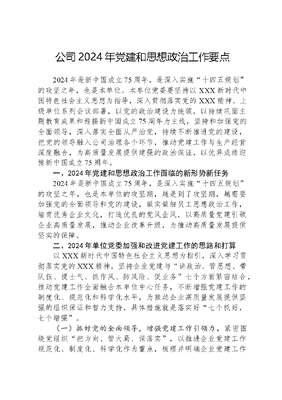 公司2024年党建和思想政治工作要点2024年是新中国成立75周年,是深入实施十四五规划的攻坚之年,也是本单位。本单位党委要坚持以XXX新时代中国特色社会主义思想为指导,深入贯彻落实党的XXX精神、上级单位系列会议部署,以党的政治建设为统领,以持续巩固主题教育成果和迎接新中国成立75周年为主线,坚持和加强党的全面领导,深入落实全面从严治党,持续不断推进党的建设,把党的领导融入公司治理各个环节,推动党建工作与生产经营深度融合,为高质量发展提供建强的政治保证,以优异成绩迎接新中国成立75周年。一、2024年党建和思想政治工作面临的新形势新任务2024年是新中国成立75周年,是深入实施十四五规划的攻坚之年,也是本单位的攻坚期,越是到了攻坚期,越需要加强党的全面领导和党的建设,做实做细员工思想政治工作,培育优秀企业文化,打造优良的党风企风,以高质量党建引领企业高质量发展,推动企业改革升级,为推动高质量发展提供坚实的保障。二、2024年单位党委加强和改进党建工作的思路和打算以XXX新时代中国特色社会主义思想为指引,深入学习贯彻落实党的XXX精神,坚持企业党建与讲政治、管思想、带队伍、提士气、抓作风、防风险、促业务七个方面紧密结合,推动党建工作全面融合本单位中心任务,不断增强党建工作的制度化、规范化和科学化水平,为推动企业高质量发展提供坚强的组织保证和智力支持。具体措施就是落实好七个抓好,七个增强。(一)抓好党的全面领导,增强党建工作引领力。紧密围绕党组织把方向、管大局、保落实,以推进企业党建工作规范化、制度化、科学化作为重点,梳理并明确企业党建工作责任内容,使党建工作目标、内容和责任与企业中心工作紧密融合。通过做实党员考核评价管理办法,严肃政治规矩,严肃党内生活,贯彻新发展理念,构建新发展格局,坚定做到两个维护的政治自觉、思想自觉和行动自觉。(二)抓好融入中心工作,增强党建工作影响力。建立党委抓、书记抓、各有关部门抓、一级抓一级、层层抓落实的党建工作责任体系,改变党建工作责任制上下一般粗、与管理实际脱节的现象,达到让党建工作考核严起来、硬起来的效果。落实党建工作联系点制度,建立党委班子成员基层党组织建立联系点,全方位帮助和指导联系点的党建工作,做到联系一个点,带动一大片。落实支部书记抓党建工作述职评议制度,突出书记抓党建工作,既要述创新亮点,更要突出问题导向,增加现场提问、考核组人员单独交谈交流,确保平移质量。不断总结提升党员考克评价制度在党员管理教育中的好做法,推出好经验,打造好典型,以点带面,发挥示范引领作用。(三)抓好党建到支部,增强党建工作凝聚力。坚持一切党建工作到支部,把党建工作重心放在基层、基础、基本功上。一是抓好三会一课,强化基层党支部的凝聚力。通过进一步规范程序,在坚持、加强、创新上下功夫,实现三会一课规范化、制度化、常态化,使三会一课成为党员自我提升的大课堂、自我淬炼的大熔炉,和党支部宣传党的主张、贯彻党的决定、领导基层治理、团结动员群众、推动改革发展的加油站;二是抓好主题党日,增强基层党支部的感染力,发挥志愿者服务、勇于奉献、服务群众的作用,增强党员的使命感、责任感和荣誉感;三是抓好党员教育,增强基层党支部的向心力。坚持集中教育和经常性教育相结合,集体培训和个人自学相结合,采取集中轮训、理论宣讲、组织生活、在线教育培训等方式,强化党章党规党纪教育,强化党的宗旨教育,进行红色教育,开展形势任务教育,注重知识技能教育,引导党员学以致用,知行合一,提高政治站位,强化责任担当,增强过硬本领,做好本职工作,发挥示范带动作用。 (四)抓好干部人才队伍建设,增强党建工作战斗力。一是切实加强领导班子建设,以争创四好班子为目标,对标行业标杆单位,努力提升领导班子的政治素养、党性修养和管理才能,为企业实现更高质量发展打下坚实的基础;二是严格干部选任用,以竞聘上岗和轮岗交流为重点,做好选人用人源头管理,进一步激发干部队伍整体活力,提升履职创新效能。加强党员干部的政治理论学习和技能培训,提高专业化水平,打造一支有格局、有视野、有目标、有办法的干部队伍。坚持能者上、庸者下、劣者汰的选用导向,注重培养选拔政治强、懂专业、善管理、敢担当、作风正的优秀年轻干部,持续优化领导班子结构。(五)抓好宣传思想文化工作,增强党建工作感召力。一是坚持党建引领方向,运用文化丰富党的建设,将党建工作贯穿文化建设始终,互促共融,XXXXXX对宣传思想文化工作作出的重要指示和全国宣传思想文化工作会议精神,结合公司市场营销、改革管理、人才队伍建设等中心工作,找准企业文化建设的切入点,在团队文化、绩效文化、廉洁文化、和谐文化等方面创新载体;二是严格落实意识形态工作责任制,从落实主体责任和管好宣传阵地入手,定期开展意识
