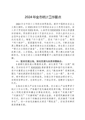 2024年全市统计工作要点2024年全市统计工作的总体思路是:高举中国特色社会主义伟大旗帜,以XXX新时代中国特色社会主义思想为指引,深入学习贯彻党的XXX精神,认真贯彻XXXXXX考察江苏重要讲话精神,贯彻落实省委十五届四次全会、市委九届四次全会、全国和全省统计工作会议决策部署,深刻领悟两个确立的决定性意义,增强四个意识、坚定四个自信、做到两个维护,紧紧围绕市委、市政府中心工作,不断深化拓展主题教育成果,推进党建与业务深度融合,举全局之力抓好第五次全国经济普查,坚持不懈推进依法治统、服务优统、改革兴统、人才强统,奋力展现勇挑大梁、勇立潮头的新气象新作为,为X打造长三角城市群重要中心城市提供坚强统计保障。一、坚持党建立统,强化党建与业务深度融合。1.持续巩固拓展主题教育成果。深化落实第一议题制度,及时传达学习XXXXXX最新重要讲话和指示批示精神、党中央重要会议和重要文件精神。深化数海争锋党建品牌,强化循迹溯源学思想促践行,依托三会一课、集中夜学、青年理论学习小组等载体,加强全体干部政治理论学习,实现领导带头学、支部常态学、干部全员学,创建学习型统计机关。2.推动全面从严治党向纵深发展。把全面从严治党贯穿于统计工作全过程,严格履行党风廉政建设责任制,贯彻落实中央八项规定精神和廉洁自律有关规定,加强对关键少数关键岗位关键领域的重点监督。丰富党风廉政学习教育形式,提升全体干部廉洁自律的道德操守。纵深推进双建争先,进一步细化清廉机关建设颗粒度,打造具有辨识度的清廉支部。3.持续强化意识形态建设。管好用好统计内外网、微信公众号等意识形态阵地。加强意识形态分析研判,常态化开展谈心谈话,严查实控意识形态领域风险点。做好信访工作,及时受理信访事项。全面加强统计网络和数据安全管理,严格落实网络安全责任人和零事件报告制度,做好局门户网站及重要信息系统的安全监测及应急响应。4.推动大走访大调研大服务大解题活动走深走实。传承弘扬四下基层优良作风,深入开展大走访大调研大服务大解题活动,加强重点企业调研走访,深入一线了解基层统计工作难点堵点,及时提供精准统计服务,在密切联系基层、企业、群众中当好暖心人。强化统计调查研究,持续推进调研成果转化运用,以高质量调查研究推动统计工作高质量发展。二、坚持应统尽统,在推进经济普查上再加力。5.高效率组织普查登记。分层分类对县镇两级专业人员、普查两员进行普查业务培训,把登记好一家而非登记完一家作为标准严格要求,有序高效完成入户调查登记和数据采集工作,确保真实反映、据实填报。6.高要求抓好数据审核。在基本完成入户调查工作的基础上,以市县两级上下联动、各部门齐抓共管、各专业协作配合的形式,全方位做好审核改错工作,确保普查单位不遗漏。抽取普查小区开展数据质量检查,分层开展电话核查,提高数据质量。7.高质量开展数据评估与行业编码。结合相关历史数据、部门行政记录,对主要指标和分行业、分地区数据进行比较分析,评估普查数据的真实性、一致性和准确性,分析GDP核算制度改革的衔接性。协调各主管部门,在数字经济核心产业、文化产业、旅游产业、高新技术产业、体育产业等方面,做好行业代码编制,科学准确反映产业发展状况。8.高标准强化普查宣传。着力丰富形式、创新方式,持续加强经济普查宣传动员,消除普查对象顾虑,提高普查对象配合度,营造全社会支持配合普查工作的良好氛围。对照评选标准和程序开展好X市第五次全国经济普查先进集体和先进个人评选工作,营造争先氛围,汇聚奋进合力。三、坚持依法治统,在抓实数据质量上下功夫。9.推进统计法治宣传全方位覆盖。抓好领导干部关键少数,落实统计法律法规进党校制度。利用统计普法面对面、统计信用公示和惩戒、企业联审辅导、业务培训、调研走访等方式开展对统计人员及调查对象的统计法律法规宣传,强化典型案件警示教育。依托互联网+模式拓宽法治宣传渠道,营造良好统计法治氛围。10.强化统计数据生产全流程监管。落实事前、事中、事后闭环管理机制,严把统计单位入退库审核关口,持续优化数据审核查询模式,加大专业核查覆盖面,实现数据质量管控关口前移。11.积极发挥统计监督职能作用。加大统计执法检查力度,构建系统完整、协同高效、约束有力的统计监督体系,在巩固省级统计督察整改成效的基础上,组织对2个县(市、区)和1个市级部门开展统计督察。12.扎实推进《防范和惩治统计造假、弄虚作假督察工作规定》基层落地执行。以海宁市为试点,着力探索职责清晰、责任明确的执规落实体系,努力推动党内法规在基层的落地见效,坚决打赢防治统计造假攻坚战、持久战。13.加强统计基层基础规范化建设。加强镇(街道)统计机构星级评价,不断优化评价方案和评价办法,不断夯实统计基层基础。推动实