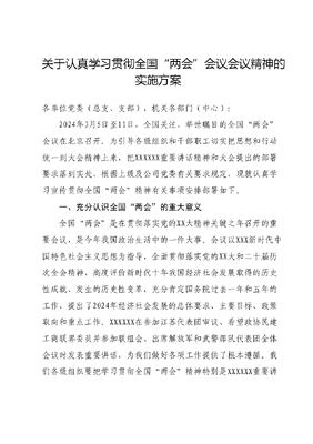 关于认真学习贯彻全国两会会议会议精神的实施方案各单位党委(总支、支部),机关各部门(中心):2024年3月5日至11日,全国关注、举世瞩目的全国两会会议在北京召开。为引导各级组织和干部职工切实把思想和行动统一到大会精神上来,把XXXXXX重要讲话精神和大会提出的部署要求落到实处,根据上级及公司党委有关要求规定,现就认真学习宣传贯彻全国两会精神有关事项安排部署如下。一、充分认识全国两会的重大意义全国两会是在贯彻落实党的XX大精神关键之年召开的重要会议,是今年我国政治生活中的一件大事。会议以XXX新时代中国特色社会主义思想为指导,全面贯彻落实党的XX大和二十届历次全会精神,高度评价新时代十年我国经济社会发展取得的历史性成就、发生的历史性变革,充分肯定国务院过去一年和五年的工作,提出了2024年经济社会发展的总体要求、主要目标、政策取向和重点工作。XXXXXX在参加江苏代表团审议、看望政协民建工商联界委员并参加联组会、出席解放军和武警部队代表团全体会议时发表重要讲话,为我们做好各项工作提供了根本遵循。我们各级组织要把学习贯彻全国两会精神特别是XXXXXX重要讲话精神,作为当前和今后一个时期重要政治任务,采取多种形式迅速掀起学习贯彻热潮,切实把思想和行动统一到会议精神上来把智慧和力量凝聚到落实会议提出的各项任务上来,奋力开创新时代公司高质量跨越发展新局面。二、认真抓好全国两会精神的学习宣传1.加强系统学习。两级党委理论学习中心组要把学习全国两会精神作为重点内容,制定计划、列出专题,认真学习XXXXXX在参加江苏代表团审议、看望参加政协会议的民建工商联界委员、出席解放军和武警部队代表团全体会议、在会议闭幕会上的重要讲话精神,认真学习《政府工作报告》等大会有关报告采取通读原文、观看视频、座谈交流、专题研讨等形式,原原本本地学、全面系统地学,吃透精神实质,把握核心要义。各基层党支部要通过三会一课、主题党日等形式开展各具特色的学习活动。2.开展宣讲活动。各单位遴选骨干力量成立宣讲队伍,利用流动课堂微课堂、政治理论学习日、班前班后会等形式深入基层区队车间开展面对面宣讲,推动两会精神进车间区队、到班组岗位。两级领导班子成员要发挥表率作用,既要作为普通党员参加好所在党支部的学习活动,又要带头深入基层单位开展宣讲。3.举办专题辅导报告会。认真组织收听收看上级举办的以学习贯彻全国两会精神、推进高质量发展为主题的大讲堂,深入解读经济形势,引导各级领导干部完整、准确、全面贯彻新发展理念,深刻领会中国式现代化的丰富内涵,加快推动高质量跨越发展。同时,各单位也可采取请进来与走出去相结合等方式,通过邀请专家教授专题辅导、外出学习培训等形式,加深对会议精神的学习理解。4.召开领导班子务虚会。6月底前,两级党委及党支部要在深入学习两会精神的基础上,专门召开一次务虚会,每名班子成员结合落实上半年指标完成情况,结合岗位工作实际,深入查摆问题不足,找准理清短板弱项,明确工作目标和努力方向。要通过务虚会,进一步解放思想、转变观念,拓宽思路、创新举措针对存在问题制定改进措施,拿出管理提效、资产提质、推进高质量跨越发展等方面的实招硬招新招,真正把全国两会精神落到实处。5.精心组织新闻宣传。公司宣传新闻部门要把握正确舆论导向,统筹运用广播、报纸、网络、微信等多种形式,广泛宣传全国两会精神,及时转发央媒、省媒重要稿件,推出系列评论员文章,结合实际深入解读会议精神。要大力宣传各单位学习贯彻全国两会精神的具体举措和实际行动,大力宣传在全国两会精神指引下,公司实施蓄势突破高质量跨越发展,加快打造高质量发展样板示范企业的生动实践。要积极创新宣传载体采取短视频、动漫、H5等灵活多样形式,加强政策解读,增强宣传教育的吸引力和感染力。充分发挥大屏、橱窗、文化长廊等阵地优势,营造学习宣传浓厚氛围。灵活采取主题征文、常态化宣讲、演讲比赛、知识竞答等方式,吸引职工积极参与,扩大宣传教育覆盖面和影响力。三、深入抓好全国两会精神的贯彻落实6.坚持旗帜鲜明讲政治。各级组织要增强讲政治的自觉性,进一步增强四个意识、坚定四个自信、拥护两个确立、做到两个维护,以实际行动向以XXX同志为核心的党中央对标看齐,向党中央、国务院等领导集体看齐,做到思想上认同核心、政治上忠诚核心、行动上紧跟核心。要严格落实全面从严治党主体责任,党委书记(支部书记)切实履行第一责任人职责,班子成员认真履行一岗双责,驰而不息纠正四风,持之以恒正风肃纪,锤炼忠诚干净担当的干部队伍,营造风清气正的政治生态。认真贯彻落实XXXXXX对新时代国有企业党建工作提出的新要求,深化公司党建品牌和一支部一品牌、一书记一项目等特色模式,大力