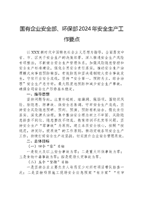 国有企业安全部、环保部2024年安全生产工作要点以XXX新时代中国特色社会主义思想为指导,全面落实中省、市、区关于安全生产的决策部署,深入推进安全生产风险专项整治,不断健全安全生产管理体系,加强风险隐患管控和安全生产标准建设,强化全员安全责任落实,推动安全生产治理模式向事前预防转型,有效防范和坚决遏制较大安全事故发生,守住行业安全底线,坚持安全第一,预防为主,综合治理安全生产总方针,最大限度地预防和减少安全生产事故,确保全司安全生产形势基本稳定。一、指导思想坚持问题导向,注重补短板、堵漏洞、强弱项,围绕识风险、除隐患、防事故、保安全总基调,守牢安全生产底线。坚持安全风险隐患预研、预判、预演、预防有机结合。强化责任落实、深化源头治理,集中整治安全理念树立不牢固、风险隐患排查不到位、隐患整改不彻底、教育培训不扎实等问题。坚持安全生产零事故为原则,建立本质安全核心,按照按规范,讲实际,提质效的工作原则,推动突破各项安全生产工作,持续打好安全生产攻坚战,切实提升企业安全管理质效。二、总体目标(一)四个零目标一是较大及以上安全事故为零;二是重大环保事故为零;三是食物中毒事故为零;四是现场火灾事故为零。(二)五个坚持目标一是坚持企业主要负责人每月至少对所有项目带队检查一次;二是坚持项目施工现场安全应急预案有方案有审核有演练;三是坚持项目安全公示栏更新曝光安全生产违章操作、公示重大危险源防控清单,处理违规违章班组、个人信息;四是坚持项目更新重大危险源排查整治台账,并落实隐患整治及相关措施;五是坚持项目每天组织班前例会,进行施工技术交底、施工安全交底。(三)六个100%目标一是安全生产责任书签订100%。;二是施工项目、管理人员和劳务人员劳动保险购买率100%;三是特殊作业人员持证上岗率、特种设备检验率、设备合格率100%;四是危险性较大的工程安全专项方案制定和审批率100%;五是安全生产教育、培训的人员覆盖率100%;六是重大隐患整改率100%。三、重点工作(一)压实安全生产责任,强化安全责任落实建设工程项目要确认各方责任主体,具体职责分工,确保各项安全生产工作任务落实落地。按照一岗双责三管三必须的原则,签订安全生产责任清单,全面履行安全生产工作职能职责,压紧压实安全生产责任。建设单位要明确勘察、设计、监理、施工等单位安全文明相关责任,并为前述单位开展安全文明施工工作创造条件,积极发挥现场监督作用,坚持定期或不定期对各施工项目安全管理人员到岗、到位情况,发现安全问题详细记录,并责令整改。施工单位加强现场安全管理,按照相关规定进行施工,加大劳动者操作规范力度,落实作业人员劳动保障以及设施设备维修维护保养,重点管理现场分包单位以及施工班组,全面落实现场项目管理部的所有规章制度。(二)事故责任追根溯源,实施追责问责机制强化事故追根溯源,查清安全工作遗漏,查找事故责任人将安全生产责任压实到业主、施工、分包等安全责任主体。加大督查力度,对安全生产责任、制度不落实、不履职不尽责的行为,严肃追责问责。严格落实安全生产追责问责程序,严厉查处安全生产责任落实不到位、不作为、慢作为,风险隐患排查治理不及时、不彻底,存在突发事件信息谎报、瞒报、漏报、迟报等行为。(三)强化安全生产意识,提升人员安全素质大力开展教育培训活动,塑造安全教育培训良好氛围,将消防、地灾、防汛等纳入重点培训计划中,有针对性的制定安全教育培训方案,施工现场要积极开展三级教育培训和班前活动,并按照相关工种落实安全技术交底,着重强化安全理念意识,采用多形式,分层次、分批次开展轮训工作,确保培训高质高效,切实提升一线人员安全生产意识。(四)强化安全宣传引导,形成良好安全氛围高度重视安全文化、安全理念的导向作用,充分发挥安全文化建设、安全理念引领的渗透力和影响力,常态化开展安全警示教育,深刻吸取事故教训,举一反三,引导职工形成自觉控制、自我约束、自主保安的行为规范。利用文化墙、自媒体、公众号加大安全宣传力度,通过树立优秀安全工作者典型,提高员工安全工作认同感,采取安全生产法治宣传知晓安全的重要性。(五)全面提升预防体系,落实隐患风险整改针对重大危险源要按职责分工建立重大危险源控制体系,通过风险识别和评估调研,识别可能对企业产生重大影响的各类风险,如机械安全、行为安全、技术风险等。对于潜在风险较高、影响较大的风险,采取避免措施,及时调整方向化解风险,对于难以避免的风险,可采取减轻风险程度,制定相应的技术措施,如建立应急预案、加强危机管理等。持续保持安全环保隐患排查整治工作常态化,做到排查不留死角、整治不留后患,坚决杜绝安全风险隐患小事拖大,大事拖炸的情况发生。(六)增加专项预案范围,提升应急处置能效结合经营生产中的重大风险源和重点工作岗位有针对性的编制修订各
