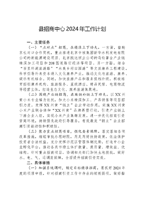 县招商中心2024年工作计划一、主要任务(一)点对点招商,在精准上下功夫。一方面,借助京长对口合作契机,重点推进北京中核集团新华水利发电有限公司的新能源建设项目、北京凯达恒业公司的马铃薯全产业链精深加工项目和208国道路衍经济等项目。另一方面,结合百里环湖旅游路水美乡村田园游等文旅康养工程建设,科学引导外来资本进入文化康养产业,推动文化与旅游、康养、娱乐有机结合。同时,加快旅游产品和服务提档升级,积极培育招引康养机构、旅游服务、星级酒店、精品民宿、电商物流等经营主体,打造生态文化、康养旅游集聚地。(二)围绕产业链招商,在延链补链上下功夫。以XX州黄小米专业镇为依托,加大小米精深加工、产品销售等项目招引力度。发挥XX州黄链主企业带动作用,实施XX州黄小米产业联合体和XX州黄品牌再塑行动,引进产业链上下游企业入驻,实现小米产业集群发展。进一步优化招商引资营商环境,持续强化政府引导服务,有效激发链主企业招商引资能动性和积极性。(三)聚力重点招商项目,强化要素保障。落实落细各项改革措施,缩短审批办理时限,用足用好扶持政策,依法保护投资者合法权益。充分发挥示范区管理体制优势,打造中小企业孵化平台,推动各类市场主体扩数量、提质量、增效益、优结构。针对重点招商项目,协调相关部门加快土地报批,做好水、电、气、运调度保障,全面提升招商引资实效。二、具体举措(一)加强系统调研,锁定目标精准招商。要抓好2024年度的项目申报,针对招商引资工作中存在的短板弱项,做好指标分析调度,强化与发改、统计部门的沟通协作,合力做好项目入库入统工作,做到应入尽入、应统尽统。同时,要依托自身禀赋优势和产业转型发展定位,借助与北京房山区对口合作的契机,重点推进北京中核集团新华水利发电有限公司的新能源建设项目,北京凯达恒业公司的马铃薯全产业链精深加工项目,208国道路衍经济项目,提升招商引资精准度。深度挖掘XX县山水禀赋和历史文化资源,结合百里环湖旅游路水美乡村田园游等文旅康养工程建设,科学引导外来资本进入文化康养产业,推动文化与旅游、康养、娱乐有机结合。(二)发挥链主企业牵引作用,优化环境服务招商。要坚持招商引资政府主导、企业主体、园区承接的工作思路,完善招商引资体制机制,以XX州黄小米专业镇为依托,着力加大小米精深加工、产品销售等产业项目招商力度,把小米产业向休闲食品、饮品、酿品等领域延伸,抓住一体化生产和品牌塑造两个重点,发挥XX州黄链主企业带动作用,引进产业链上下游企业入驻,实现小米产业集群发展。进一步优化招商引资营商环境,持续强化政府引导服务,有效激发县域内主导产业链主企业担当招商引资排头兵的能动性和积极性。(三)加强横向纵向联动,提升资源要素配置保障。把XX县现代农业产业示范区作为项目引进的主战场,依托示范区基础设施、产业集聚和独立审批服务等优势,重点围绕特色农业种植、有机食品加工和仓储物流产业开展招商引资,吸引更多优质项目落地生根、开花结果。充分发挥示范区管理体制优势,打造中小企业孵化平台,推动各类市场主体扩数量、提质量、增效益、优结构。针对重点招商项目,协调相关部门加快土地报批,做好项目涉及的水、电、气、运调度保障,为招商项目落地提供优质的服务,全面提升安商服务的质量和水平。三、目标成效(一)突出工作重点抓招商一是坚持招大引强。坚持以大项目为中心,推进招商引资文可居文库——海量学习资料,手机电脑下载www.wenkeju.com向招商选资转变,重点引进投资强度高、产出效益高、科技含高、产业关联度高的大项目。争取在2024年4月底前,完成XX县人民医院与北京中医药大学合作共建医联体,XX县教育局与首都师范大学及首都师范大学附属育新学校房山分校就教师培训、人才培养、干部挂职等方面的合作事项。2024年4月前与中核集团新华水力发电有限公司投资战略合作项目进行开工;华能XX县三期300MW光伏发电项目开工建设,总投资8.25亿元,投资主体为华能山西清洁能源有限公司。二是加强产业链招商。以招引贴合本县产业布局和发展方向的三大主导产业企业为重点,构成产业集群和产业特色,不断壮大主导产业、提升传统产业、培育新兴产业。着力建设一批投资规模大、技术水平高、产业链长、资源转化潜力强、贴合环保要求和行业标准的大项目。组织召开京长对口合作项目谋划包装推进会,结合十四五规划及年度工作计划,在京长对口合作框架内深度谋划一批操作性强、符合上级支持政策、能带动我县产业发展、促进基础设施完善,促进双方共同发展的合作项目。争取在2024年4月底前与北京凯达恒业公司就转移承接建设马铃薯全产业链精深加工项目签订战略合作框架协议。(二)创新招商工作方式,提升成效一是转变招商工作方式。继续开展产业招商、专业招商、驻外招商组招商等方式,不断
