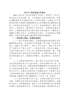 局2024年度党建工作要点2024年是中华人民共和国成立75周年,是实现十四五规划目标任务的关键一年。今年党建工作的总体要求是:坚持以XXX新时代中国特色社会主义思想为指导,全面深入学习贯彻党的XX大精神和XXXXXX来xx考察重要讲话重要指示精神,认真落实省市区深化三个年活动部署要求,紧扣围绕中心、建设队伍、服务群众职责定位,以党的政治建设为统领,以增强党组织政治功能和组织功能为重点,以模范机关、清廉机关建设为抓手,以创新活动为牵引,全面提高机关党建质量,为推动全区xx事业高质量发展提供坚强保证。一、突出凝心铸魂,加强政治建设(一)深化思想政治建设。坚持把党的政治建设摆在首位旗帜鲜明讲政治,自觉深刻认识和理解两个确立的决定性意义,增强四个意识、坚定四个自信、做到两个维护始终牢记国之大者,认真对标对表,及时校正偏差,自觉在思想上政治上行动上同上级党组织保持高度一致。注重在贯彻落实党中央和省市区决策部署、应对重大突发事件、完成急难险重任务中,提高政治判断力、政治领悟力、政治执行力。(二)加强党员教育培训。建立常态化长效化学习机制,采取局党组理论学习中心组引领学、各党支部集中深入学、党员干部自主学等方式,持续巩固拓展XXX新时代中国特色社会主义思想主题教育成果。加强学习强国干部网络学院等平台学习,多措并举抓好党员干部教育培训,不断提升党员干部政治理论素养,确保XXX新时代中国特色社会主义思想和党的XX大精神学习培训覆盖到每一个支部、每一名党员。(三)抓牢抓实意识形态工作。全面落实意识形态工作责任制,加强机关党员意识形态教育,筑牢党员思想防线。坚持政治标准,加强局微信群、微信公众号等网络意识形态阵地建设管理,做到既管好阵地,又讲好机关故事,推动意识形态工作落实落细、走深走实。积极践行社会主义核心价值观,丰富中华优秀传统文化和社会主义先进文化,加强社会公德、职业道德、家庭美德、个人品德建设。坚持发扬斗争精神,增强斗争本领,对意识形态领域各种错误言行敢于亮剑、坚决抵制。二、织密组织体系,建强战斗堡垒(四)严格落实机关党建规范化。着眼增强党组织政治功能和组织功能,持续巩固模范机关创建成果,严格落实组织体系、队伍建设、活动阵地、工作运行、考核管理、作用发挥规范化。(五)加强机关党务干部管理。严格执行党章党规,按照局机关党委书记应当由本单位党员负责人担任和党支部书记原则上由本单位党员主要负责人担任的要求,选优配强各党支部班子。严格党组织书记述职评议考核,强化结果运用。(六)推动四强党支部建设。认真贯彻《中国共产党党和国家机关基层组织工作条例》,坚持大抓基层的鲜明导向,扎实推进标准化规范化,努力建设政治功能强、支部班子强、党员队伍强、作用发挥强的机关基层党支部。认真落实党组成员联系党支部工作制度,率先把党组书记所联系党支部建成四强党支部。七一前夕,表彰一批先进基层党组织、优秀共产党员和党务工作者。(七)持续深化三个年活动。认真落实省市区深化三个年活动部署要求,围绕高质量项目推进年主动争取项目、全力保障项目,围绕营商环境突破年优化审批流程、提升服务效率,围绕干部作风能力提升年增强服务能力,锤炼过硬作风,扎实推进干部绩效考核,使其切实发挥增长本领、激励干事、培养干部、涵养正气的积极作用。三、强化引领保障,推动党业融合(八)加大模范机关建设力度。聚焦政治、学习、组织、能力、纪律五个过硬和信念坚定、理论武装、担当作为、文可居文库——海量学习资料,手机电脑均可下载www.wenkeju.com作风优良、服务群众五个表率要求,局机关党委要加大创建力度,明晰创建标准,充实创建内容,完善考评体系,以更加务实有力的举措推进模范机关建设上台阶、见实效。(九)着力推进机关党建创新。发挥机关党建引领示范作用,建立党建观察员互学共促交流机制和党建指导员制度。全面开展党建品牌创建行动,着力打造一支部一品牌党建品牌矩阵,巩固提升原有品牌,打造一批新品牌。(十)认真落实双报到工作机制。常态化开展机关党组织和党员干部到社区双报到为民服务,落实街镇吹哨、部门报到社区吹哨、党员报到工作机制,组织党员干部深入街镇、社区一线,实施共驻共建促发展系列主题活动,用心用情办好群众微实事、实现微心愿,着力培育各党支部党建新动能。四、聚焦日常监督,深化清廉机关建设(十一)深化纪律规矩教育。认真落实区委《关于推进清廉xx建设的实施意见》和区直机关工委《区直机关推进清廉机关建设的实施方案》《开展清廉机关建设的指导意见》,深入开展干部大讲堂,加强党员干部经常性纪律教育、政德教育、家风教育。组织党员干部观看警示教育片、学习案件警示录和通报曝光的典型案例,教育党员干部汲取教训、引以为戒,算好