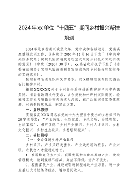 2024年xx单位十四五期间乡村振兴帮扶规划2024年是乡村振兴攻坚之年,党中央和各级政府、党委高度重视此项工作,国务院于2020年12月16日下发了《中共中央国务院关于实现巩固拓展脱贫攻坚成果同乡村振兴有效衔接的意见》(中发〔2020〕30号),xx委省政府也于下发了《省委省政府关于实现巩固拓展脱贫攻坚成果同乡村振兴有效衔接的实施意见》。按照吉林省委组织部文件要求,我x继续包保帮扶安图县石门镇仲坪村。根据XXXXXX关于乡村振兴系列讲话精神和中共中央国务院、省委省政府文件要求,结合我校和仲坪村实际情况,经驻村工作队与安图县相关负责人沟通,在广泛征询镇党委镇政府、村两委的意见后,制定此方案。一、指导思想贯彻落实XXX同志在党的十九大报告中提出的乡村振兴的20字总要求:产业兴旺、生态宜居、乡风文明、治理有效、生活富裕,最终实现乡村产业振兴、乡村人才振兴、乡村文化振兴、乡村生态振兴、乡村组织振兴。二、帮扶目标(一)全力促进乡村产业振兴乡村振兴,产业兴旺是重点。产业是发展的根基,产业兴旺,农民收入才能稳定增长。1、发展特色优势产业。巩固发展村内黄牛养殖产业,优化管理模式,做到规模不缩减、效益不降低、资产不流失。2、挖掘富民产业。建设或引进新型增效产业项目,进一步发展壮大村级集体经济,增加村民收入。3、探索培育家庭农场。鼓励村民开展小型庭院种养殖项目,激发勤劳致富的主观能动性。4、发展农民合作经济组织。充分了解和利用国家政策指导农村各项经济活动,进一步引导和支持农民发展各类专业合作经济组织。(二)全力促进人才振兴乡村振兴,人才是基石。农村经济社会发展,说到底,关键在人。要培养更多爱农业、懂技术、善经营的新型职业农民。要通过富裕农民、提高农民、扶持农民,让农业经营有效益,让农业成为有奔头的产业,让农民成为体面的职业。1、开展农技专项培训。聘请省内农业养殖、种植专家到村进行专项培训,让村民学会树立科学养殖、科学种植理念,促进养、种植经济效益的不断增长,同时减少对环境的破坏。2、学习先进经验和方法。联系省内养殖龙头企业,把村内养殖大户和有志于养殖事业的年轻人送出去进行培养,开拓视野。3、搭建干事创业的平台。充分利用政府优惠政策,吸引各类人才返乡创业,激活农村的创新活力。(三)全力促进文化振兴乡村振兴,既要塑形,也要铸魂。没有乡村文化的高度自信,没有乡村文化的繁荣发展,就难以实现乡村振兴的伟大使命。1、加强农村思想道德建设。以社会主义核心价值观为引领,深入挖掘优秀传统农耕文化蕴含的思想观念、人文精神、道德规范,培育挖掘乡土文化人才,弘扬主旋律和社会正气。2、制订完善新的村规民约。培育文明乡风、良好家风、淳朴民风,改善农民精神风貌,提高乡村社会文明程度,焕发乡村文明新气象。3、完善公共文化建设。修建老年活动中心一处,配套相应棋牌、健身设备设施。申请室外体育健身器材,规划室外活动场地。4、组织开展丰富多彩的文体活动。经常或定期开展知识竞赛、舞蹈表演、农趣运动会等有益于身心活动,促进知识普及,促进全民健身。(四)全力促进生态振兴乡村振兴,生态宜居是关键。良好生态环境是农村最大优势和宝贵财富。要坚持人与自然和谐共生,走乡村绿色发展之路。1、以绿色发展引领乡村振兴。通过宣传,牢固树立和践行绿水青山就是金山银山的理念,落实节约优先、保护优先、自然恢复为主的方针,统筹山水林田湖草系统治理,严守生态保护红线。2、推进美丽乡村建设。以优化农村人居环境和完善农村公共基础设施为重点,通过绿化、美化和综合整治手段,把乡村建设成为生态宜居、富裕繁荣、和谐发展的美丽家园。(五)全力促进组织振兴党的力量来自组织,组织能使力量倍增。农村基层党组织强不强,基层党组织书记行不行,直接关系乡村振兴战略的实施效果好不好。1、建强村级党组织。基层党组织,是实施乡村振兴战略的主心骨。要规范党内政治生活,认真做好三会一课和主题党日活动,切实发挥组织生活会的作用。2、全面加强村书记的培养与提高。通过学习,提高村支书的政治站位和思想觉悟,提高执政能力和水平,拓宽视野,增长经验。3、加强党员队伍建设。落实农村发展党员三注重两提高措施,真正把各方面先进分子和优秀人才吸收进来。培养村级后备力量,为乡村持续振兴培养梯队力量。4、深化村民自治实践。建立健全党委领导、政府负责、社会协同、公众参与、法治保障的现代乡村社会治理体制,提升治理水平,确保乡村社会充满活力、安定有序。三、帮扶项目计划根据我校及仲坪村实际情况,经过充分研讨,拟定十四五期间帮扶项目(见附件)。各个项目力求做到少花钱多办事,花少钱办大事,实现经济效益和社会效益双增长。四、落实帮扶责任1、落实四个不摘责任。全校上下要认真落实摘帽不摘责任、摘帽不摘政策、摘帽不摘帮扶、摘帽不摘监管要求,持续巩固脱贫攻坚成果