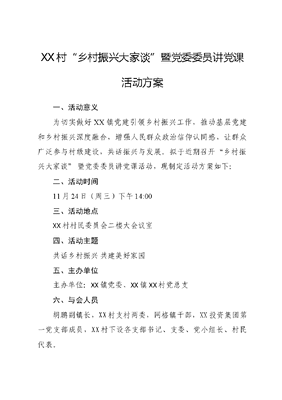 XX村乡村振兴大家谈暨党委委员讲党课活动方案一、活动意义为切实做好XX镇党建引领乡村振兴工作,推动基层党建和乡村振兴深度融合,增强人民群众政治信仰认同感,让群众广泛参与村级建设,共话振兴与发展。拟于近期召开乡村振兴大家谈 暨党委委员讲党课活动,现制定活动方案如下: 二、活动时间11月24日(周三)下午14:00三、活动地点XX村村民委员会二楼大会议室四、活动主题共话乡村振兴 共建美好家园五、主办单位主办单位:XX镇党委、XX镇XX村党总支六、与会人员胡鹏副镇长,XX村支村两委,网格镇干部,XX投资集团第一党支部成员,XX村下设各支部书记、支委、党小组长、村民代表。七、活动议程 一、开场仪式1.黄书记做开场发言;2.XX投资集团第一党支部代表讲话。二、党委委员讲党课1.胡XX镇长讲党课;2.组织学习十九届六中全会精神,观看十九届六中全会公报视频。三、谈心得体会1.XX村党员代表围绕如何当好一名微网格长、推动五个到户和乡村振兴工作谈心得体会。2.XX投资集团第一党支部党员代表谈心得体会。四、讨论会1、引导村民围绕乡村振兴村级建设进行讨论,村部记录、收集意见并汇总。2、黄xx书记做总结发言。文可居文库——海量学习资料,手机电脑均可下载www.wenkeju.com