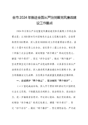 全市2024年推进全面从严治党暨党风廉政建设工作要点2024年全面从严治党暨党风廉政建设和反腐败工作的总体要求是:以XXX新时代中国特色社会主义思想为指导,全面贯彻党的XXX精神,深入落实XXXXXX对工作的重要指示要求,落实二十届中央纪委三次全会、省纪委十二届三次全会、市纪委十四届三次全会精神,深刻领悟两个确立的决定性意义,增强四个意识、坚定四个自信、做到两个维护,坚决贯彻坚定不移全面从严治党战略部署,认真落实全面从严治党体系任务要求,深入推进党风廉政建设和反腐败斗争,着力培强廉洁文化品牌,为实现全市高质量发展提供坚强保障。一、忠诚拥护两个确立,坚决做到两个维护。(一)坚定政治方向。深入学习贯彻XXX新时代中国特色社会主义思想,不断提高政治判断力、政治领悟力、政治执行力。进一步锤炼宗旨意识,牢记初心使命,践行党的路线,深刻领悟两个确立的决定性意义,增强四个意识、坚定四个自信、做到两个维护,坚定理想信念,严守政治纪律,做到绝对忠诚可靠。(责任部门:局机关各科室,各直属单位)(二)强化理论武装。坚持第一议题制度,把XXXXXX重要讲话和指示批示精神作为市直全市系统各级党组织的首要政治任务,坚持做到第一时间学习领会、第一时间贯彻落实。将学习党章党规党纪列入党组理论学习中心组、党员干部三会一课、日常教育培训的重要内容,充分利用学习强国灯塔-党建在线理论夜校等载体平台,深入学习宣传贯彻党的XXX精神,持续巩固深化党史学习教育成果,进一步筑牢党员干部拒腐防变的思想根基和道德防线。(责任部门:局机关党委、各直属党组织)(三)严肃党内政治生活。严格执行《关于新形势下党内政治生活的若干准则》,进一步增强党内政治生活的政治性、时代性、原则性、战斗性,不断提高党内政治生活质量。加强对党内政治生活状态、党的路线方针政策执行情况、民主集中制等各项制度执行情况的监督检查,推动基层党组织和全体党文可居文库——海量学习资料,手机电脑均可下载www.wenkeju.com员遵守党章党规,坚决落实党的基本理论、基本路线、基本方略。(责任部门:局机关各科室,各直属单位)二、构建全面从严治党体系,坚决落实主体责任(一)压紧压实主体责任。严格贯彻落实《党委(党组)落实全面从严治党主体责任规定》,建立落实全面从严治党主体责任清单,签订党风廉政建设责任书,构建明责知责、督责尽责、问责负责的责任链体系。党组书记切实担负起第一责任人责任,做到重要工作亲自部署、重大问题亲自过问、重点环节亲自协调,把主体责任落细落地落实。班子成员认真履行一岗双责,把党风廉政建设责任分解细化,形成一级抓一级、层层抓落实的局面,推动全面从严治党向基层延伸。(责任部门:局机关党委)(二)全面夯实监督责任。做深做实做细日常监督,强化政治纪律和组织纪律,带动廉洁纪律、群众纪律、工作纪律、生活纪律严起来,做到真管真严、敢管敢严、常管常严。围绕民主集中制原则、三重一大事项决策、廉政风险防控、隐形变异四风问题等,实施精准有效监督。紧盯重要时间节文可居文库——海量学习资料,手机电脑均可下载www.wenkeju.com点、重点领域、重要岗位,做到常提醒、早预防、严监督。(责任部门:办公室、局机关党委、各直属单位)(三)严格落实意识形态责任制。把意识形态工作纳入党建工作体系,纳入重要议事日程,全年专题研究意识形态工作不少于2次。强化思想政治工作,及时关注员工思想动态,对苗头性、倾向性问题及时研究、及时化解、及时引导,对各种错误思想、错误言论敢于亮剑。强化全市领域意识形态、网络意识形态定期报告和风险隐患研判分析,加强学校、官网、公众号等管理,守牢意识形态主阵地,定期对意识形态责任落实情况进行专项检查,推动全系统各级党组织严格落实意识形态工作责任,牢牢掌握意识形态工作领导权、主动权。(责任部门:办公室、党建办,各直属党组织)三、持续纠四风树新风,不断巩固发展风清气正的政治生态(一)持续深入整治享乐主义、奢靡之风。深化对全市领域四风表现形式的特点的认识,坚决刹住吃喝上、交往上、车轮上的不正之风。严肃查处违规使用公车、滥发奖金补文可居文库——海量学习资料,手机电脑均可下载www.wenkeju.com贴和福利等问题;紧盯中秋、国庆、元旦、春节等重要时间节点,加大明察暗访深度、频度、力度,对收送电子红包、快递物流方式隔空送礼等隐蔽性问题,以及酒驾醉驾行为背后存在的四风和腐败问题,做到精准发现、严肃查处。(责任部门:办公室、局机关党委、各直属单位)(二)整治形式主义、官僚主义顽疾。持之以恒落实中央八项规定及其实施细则精神,对贯彻党中央决策部署做选择、搞变通、打折扣等形式主义、官僚主义突出问题精准