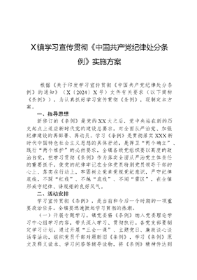 X镇学习宣传贯彻《中国共产党纪律处分条例》实施方案 根据《关于印发学习宣传贯彻《中国共产党纪律处分条例》的通知》(X〔2024〕X号)文件有关要求(以下简称《条例》),为认真抓好学习宣传贯彻《条例》,现制定本方案。一、指导思想新修订的《条例》是党的XX大之后,党中央站在新的历史起点上适应新时代党的建设总要求,对全面从严治党、加强纪律建设的再部署、再动员。学习《条例》是贯彻落实XXX新时代中国特色社会主义思想的具体行动,是捍卫两个确立、践行两个维护的必然要求,全镇各级党组织要以高度的政治自觉,把学习贯彻《条例》作为落实全面从严治党主体责任的重要抓手,使党的纪律牢记在全体党员特别党员领导干部的心上、落实在行动上,牢固树立党章党规党纪意识,严守纪律底线,不踩红线、不越底线、不闯雷区,在全镇形成守纪律、讲规矩的良好风气。二、活动安排学习宣传贯彻《条例》,是当前和今后一个时期的一项重要政治任务。全镇要迅速掀起学习贯彻的热潮。(一)开展专题学习。镇党委将《条例》纳入党委理论学习中心组学习内容,带头深入学习、贯彻执行。各党支部要制定学习计划,通过开展三会一课、主题党日、廉政谈心谈话等活动,组织党员干部对照新旧《条例》,学习《条例》原文及释义读本、学习问答等辅导读物,将《条例》精神传达到每个支部、每名党员,确保全体党员准确领会《条例》,切实筑牢思想和纪律防线。同时多样化学习形式,采取集中学+个人学以及组织知识测试等方式,切实做到学深悟透、学有成效。(二)举办专题培训。镇党委将加强对《条例》的学习业务培训,各党政领导要在联系支部、各支部书记要在党员会议开展一次加强纪律建设党课,为党员干部作出示范,着力解决一些党员对党规党纪掌握不熟悉、不透彻的问题。(三)组织知识测试。在2024年七一前夕,将组织全镇党员干部及公职人员开展一次《条例》知识测试活动,进一步加深党员干部对《条例》的理解辨析认识。三、工作要求(一)提高政治站位。各党支部、驻镇各单位要充分认识学习《条例》的重要性、必要性,切实增强政治自觉、思想自觉和行动自觉,加强对《条例》学习宣传贯彻工作的组织领导,切实担当管党治党的政治责任和落实全面从严治党的主体责任,推动党员干部学习教育走深走实、落地见效。(二)强化组织学习。各党组织负责人、驻镇各单位负责人要亲自部署,统筹组织安排,将《条例》学习列入党员会议、干部职工例会必学内容,党员领导干部要带头认真学、深入学、反复学,切实发挥示范带动作用。以《条例》学习为重要依据,示范带动全体党员真正把纪律严起来、把规矩立起来,推动纪律建设不断取得新成效。(三)严格监督检查。镇纪委将不定期对各党支部、驻镇各单位学习贯彻《条例》情况开展监督检查,对发现的问题,及时督促整改。对监督检查中发现的敷衍塞责、弄虚作假、工作不力、流于形式的,将严肃追责问责。文可居文库——海量学习资料,手机电脑均可下载www.wenkeju.com