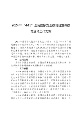 2024年4·15全民国家安全教育日宣传教育活动工作方案2024年是中华人民共和国成立75周年、实现十四五规划目标任务的关键之年,4月15日将迎来第九个全民国家安全教育日。为深入贯彻落实XXXXXX关于全面加强国家安全教育的重要指示精神,大力推动国家安全宣传教育工作在全镇广泛深入开展,增强XX镇人民国家安全意识,按照中央和省委、市委国安办统一安排部署,结合我镇工作实际,特制定本方案。一、活动主题贯彻总体国家安全观,增强全民国家安全意识和素养,夯实以新安全格局保障新发展格局的社会基础。二、工作安排(一)强化学习教育。加强对《中华人民共和国国家安全法》《总体国家安全观学习纲要》系列法律法规、权威读物和党内《中国共产党领导国家安全工作条例》《党委(党组)国家安全责任制规定》等文件精神的学习。把国家安全相关法律作为全体镇村干部人员学法用法重要内容,纳入党委理论学习中心组学习内容,在宣传教育日期间,要组织全体干部职工开展一次总体国家安全观安全知识测试,确保学习入脑入心。(责任单位:各村(社区)、单位部门)(二)开展学校教育。将国家安全教育纳入国民教育体系,落实《大中小学国家安全教育指导纲要》有关要求,制作一批针对中小学的国家安全宣传教育特色课程,以同上一堂国家安全教育课、国旗下的讲话、主题板报和主题班会等多种形式,全面增强中小学师生及家长的国家安全意识,激发爱国热情。(责任单位:科教中心、XX中学、中心学校)(三)夯实基层基础。充分发挥乡村振兴第一书记基层情况熟悉、群众基础扎实的优势,走村入户开展宣传教育。充分发挥好一中心一张网十联户基层社会治理机制作用,强化网格员和联户长的国家安全知识培训,建立国家安全宣传志愿者队伍,认真履职尽责开展入户宣传。通过召开群众座谈、入户发放宣传册等宣传教育活动形式,形成各具特色、百花齐放的宣传教育格局,打通维护国家安全工作最后一公里。(责任单位:各村(社区))(四)广泛网络宣传。运用网络新媒体宣传国家安全法、网络安全法、反恐怖主义法、反间谍法等法律,扩大宣传范围。(责任单位:各村(社区))(五)开展户外宣传。加强对学校、企业、农村、重点领域国家安全宣传工作的组织领导,利用公共交通工具、展板、横幅、电子屏等载体开展总体国家安全观宣传,营造全方位、立体化、多视角的宣传态势。(责任单位:各村(社区)、经发办、科教中心)(六)开展特色宣传。我镇国家安全教育日宣传活动要紧扣传承红色基因、弘扬长征精神主线,以提升维护大安全意识为目标,以红色精神传递奋斗力量,推动红色文化入脑入心。结合工作实际,进一步拓宽活动渠道,开展主题鲜明、别具特色的宣传活动,推动国家安全宣传教育进机关、进乡村、进社区、进学校、进企业、进网络。(责任单位:各村(社区)、单位部门)三、工作要求(一)提高政治站位,突出活动主题。各村(社区)、单位部门务必提高认识、突出主题,紧紧围绕党的XX大关于推文可居文库——海量学习资料,手机电脑均可下载www.wenkeju.com进国家安全体系和能力现代化的战略部署,坚定不移贯彻总体国家安全观,把开展好第九个全民国家安全教育日活动作为衷心拥护两个确立、忠诚践行两个维护的具体实践。把开展国家安全教育纳入重要议事日程,提前研究谋划,有针对性地开展有效有力的宣传教育活动。4月15日之前及当天,要聚焦大安全理念、突出国家安全宣传素材进行宣传。(二)紧密联系实际,明确地域特色。要突出抓好特色宣传,充分发挥红色资源优势,围绕传承红色基因,讲好遵义故事进一步找准宣传教育载体,把握宣传时机、掌握宣传节奏、增强宣传效果,把传统的宣传教育资源和新兴媒体有机融合,突出特色、注重实效,以丰富多彩、喜闻乐见的宣传教育活动营造全社会维护国家安全的良好范围。(三)严守工作纪律,注重密宣结合。宣传教育活动中要严格遵守保密要求,注重宣密结合,内外有别,坚决不允许发生因国家安全宣传教育造成失泄密事件,要注重宣传内容的审核把关,防止形成负面炒作。(四)注重经验总结,强化信息报送。要及时发现、推介活动中涌现出的好经验好做法、先进个人和先进事迹,进一步激发广大干部群众投身国家安全教育活动的积极性和主动性。各村(社区)、单位部门要按照本方案要求狠抓工作落实,并于2024年4月15日12:00前将工作开展图片、简报、工作总结等相关资料报送至平安办XX处。文可居文库——海量学习资料,手机电脑均可下载www.wenkeju.com